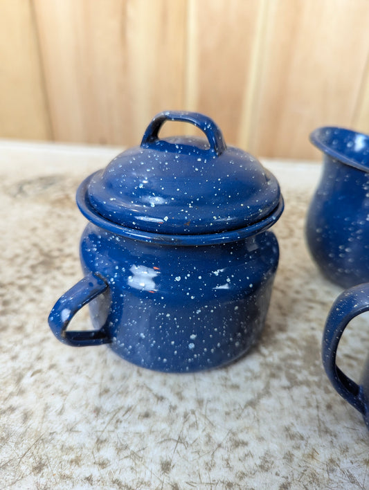 Blue & White Speckled 3 Piece Enamelware set of Creamer, Sugar Bowl and Mug