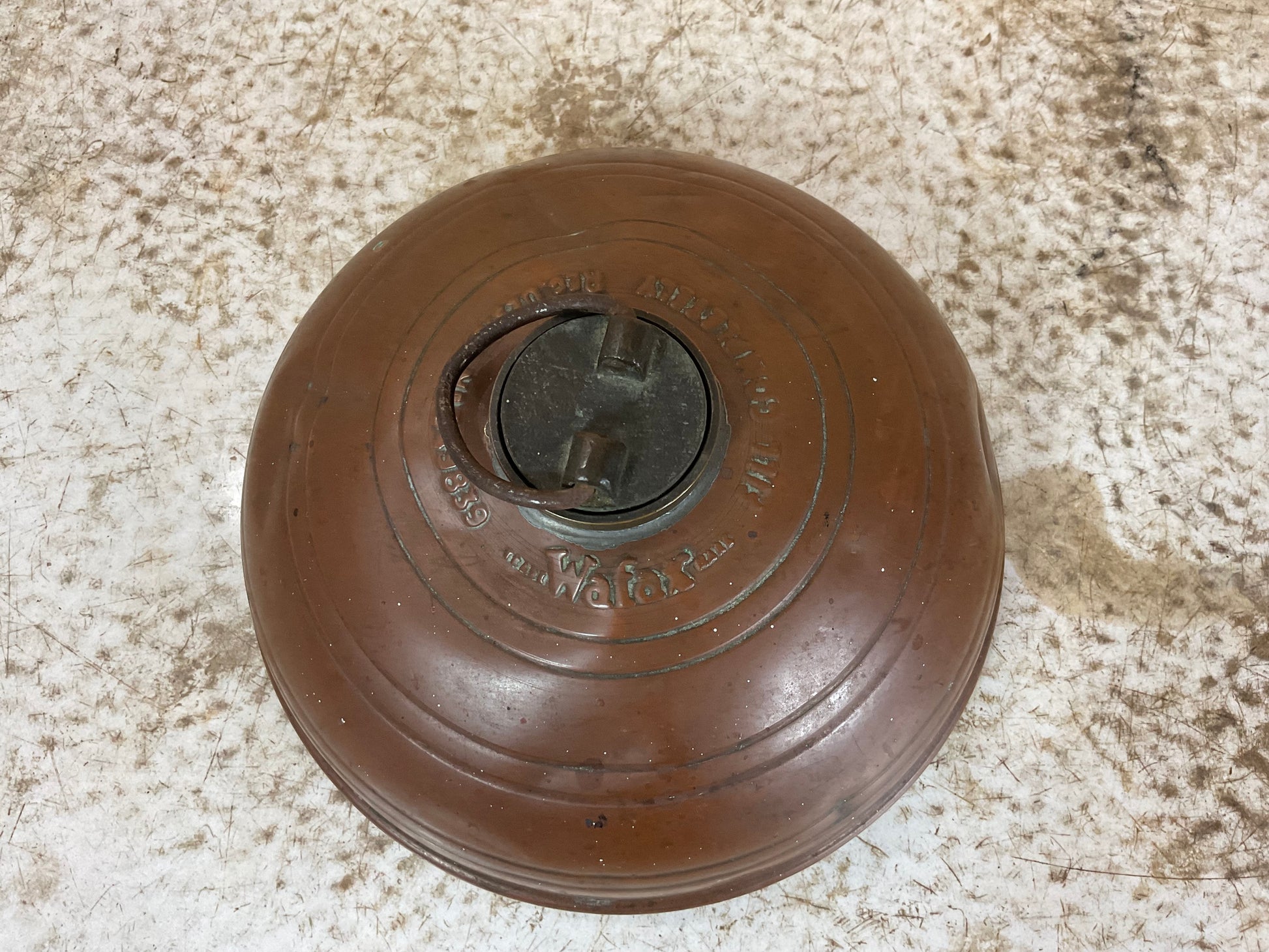 This charming 1920’s antique Wafax copper bed warmer features a dome shape with embossed lettering, measuring 8” in diameter and 4” high. Crafted with a metal stopper, it’s a functional and decorative collectible that adds vintage character to any bedroom. Despite some wear, it remains in good condition, making it a unique piece for collectors or those who appreciate nostalgic home accents.