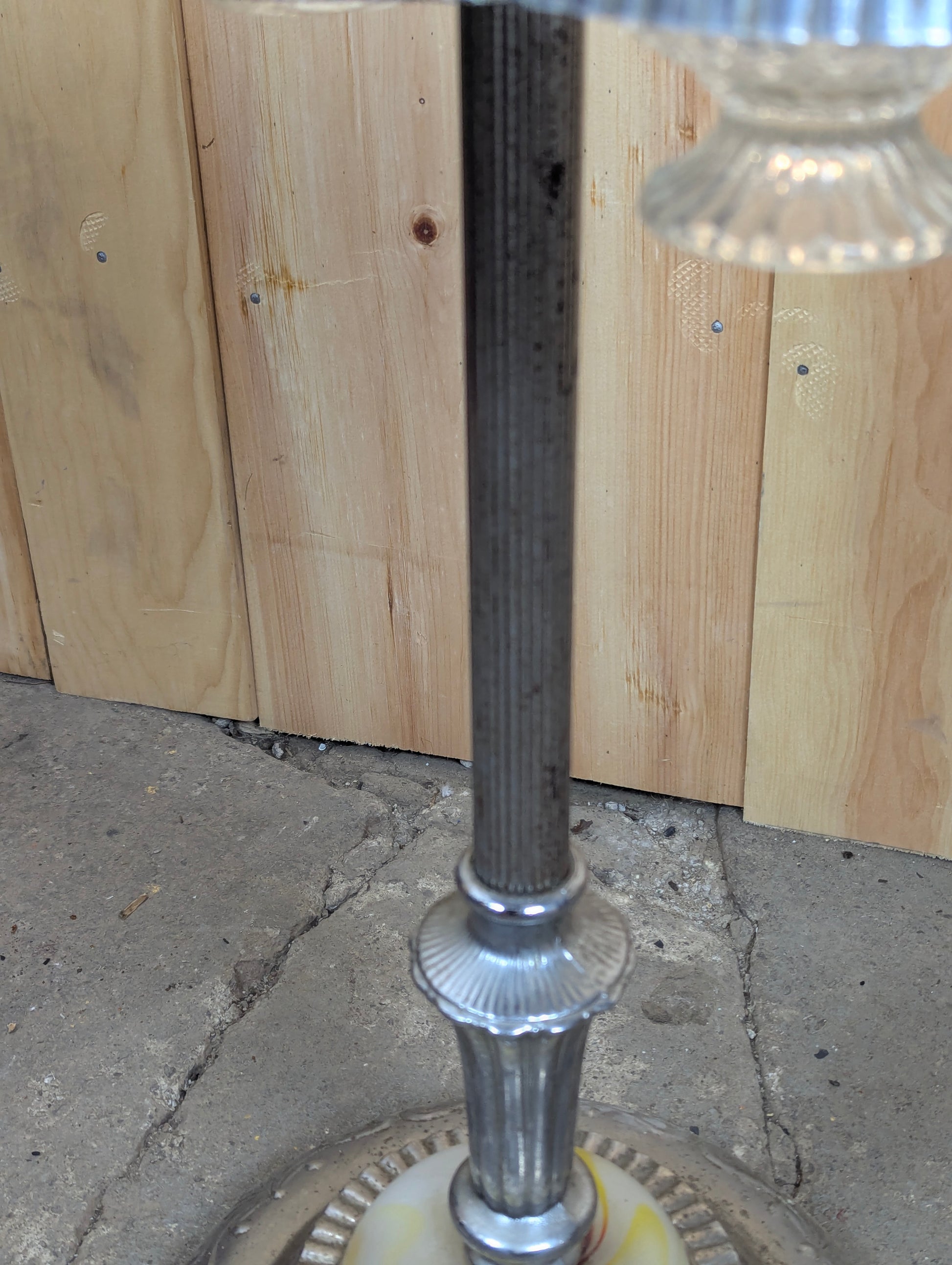 This unique 1930’s Art Deco lighted smoking stand combines vintage charm with functionality. Standing 40” tall, it features a tray top adorned with classic playing card suits, two slag glass shades—one with a chip—a pair of ashtrays, and two glass serving bowls. Both lights are fully operational, making it a great collectible and a stylish conversation piece for any room. Its well-worn condition adds authentic character and a nostalgic touch to your décor.