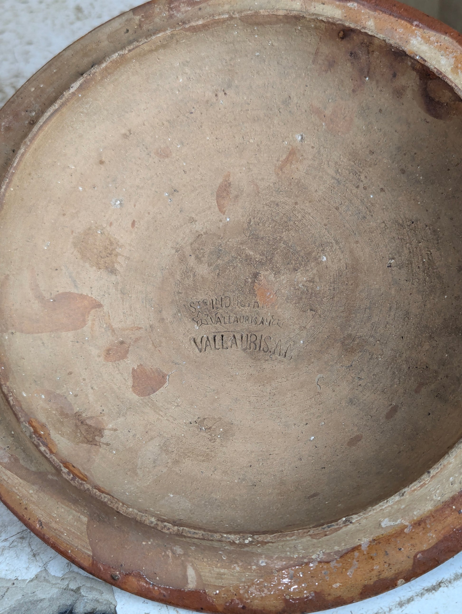 This 1930’s vintage French cooking clay pot from Vallauris, made by Société Industrielle, offers a charming piece of collectible kitchenware. Measuring 9” in diameter and 8” high, it features convenient carrying handles on the sides. While it shows character with visible cracks and a chip on the lid, these signs of use add authentic vintage appeal. Perfect for collectors or those seeking a unique rustic touch in their kitchen, this pot brings a piece of French culinary history into your home.
