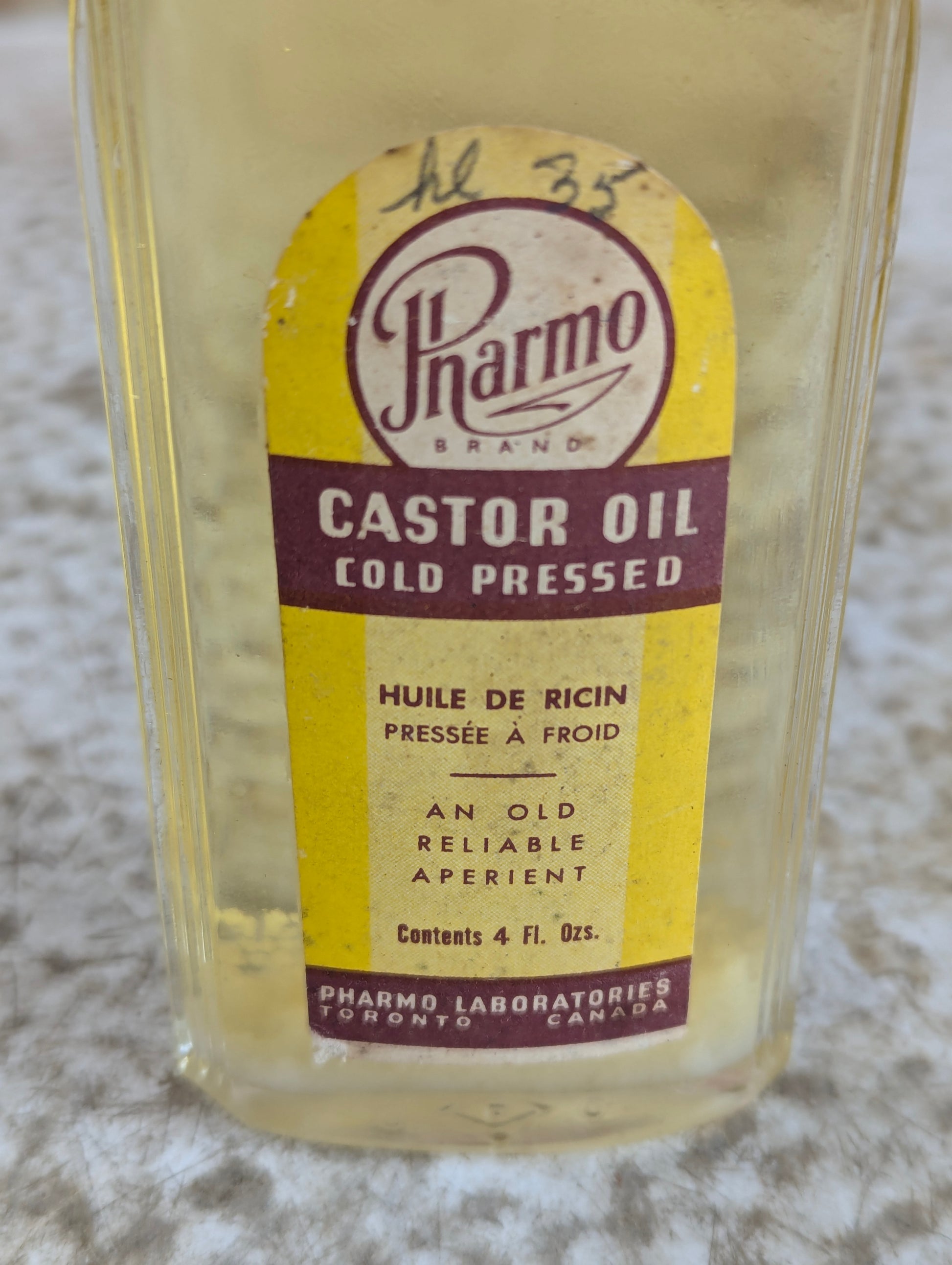 Step back in time with this authentic 1930s Pharmo Castor Oil bottle, a genuine piece of Canadian pharmaceutical history. Crafted by Toronto's Pharmo Laboratories, this 4 fl oz glass vessel showcases stunning Art Deco design elements that capture the elegance of the era. The original cap remains intact, adding to its authenticity and appeal. Perfect for collectors of vintage medicine bottles, Art Deco memorabilia, or anyone seeking a distinctive conversation piece that blends nostalgia with timeless design. A rare find that celebrates early 20th-century Canadian manufacturing and aesthetic craftsmanship.