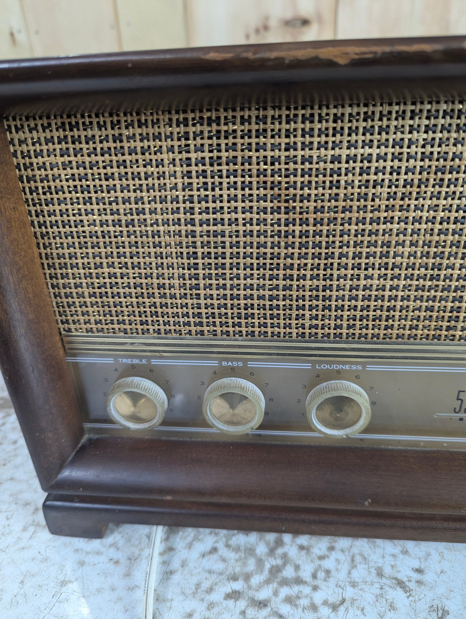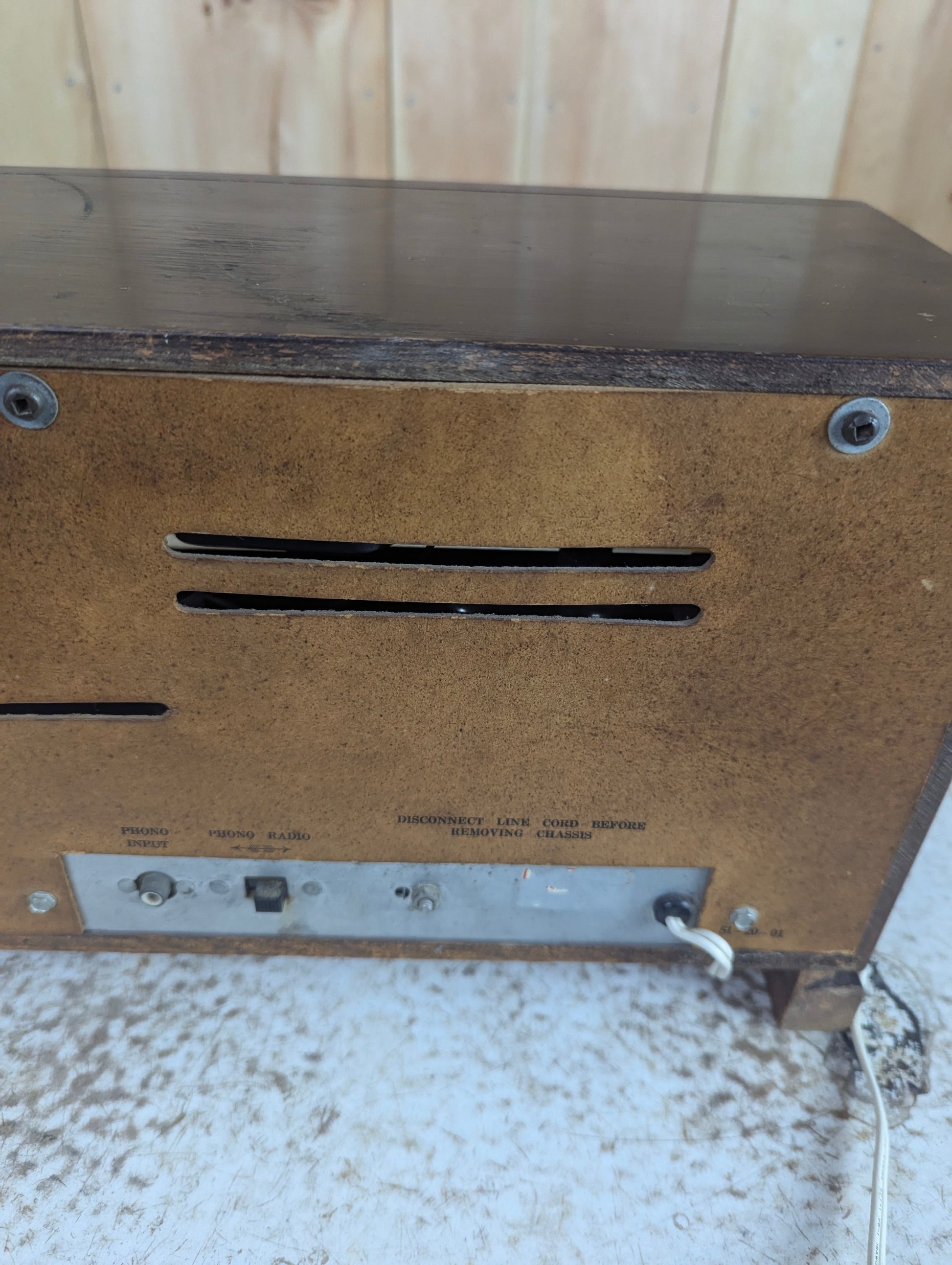 Experience the charm of vintage sound with the 1954 Viking Tube Radio Model RM370. Crafted for The T. Eaton Co, this collectible radio powers on and picks up AM stations, delivering authentic mid-century audio. Its wooden case, showing gentle signs of wear, adds nostalgic character while preserving its classic appeal. Perfect for collectors and enthusiasts, this radio brings a piece of history into your home.