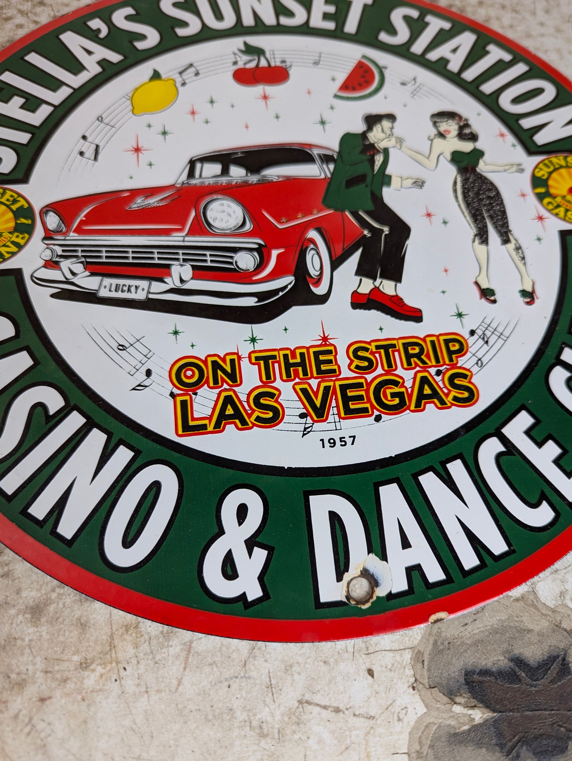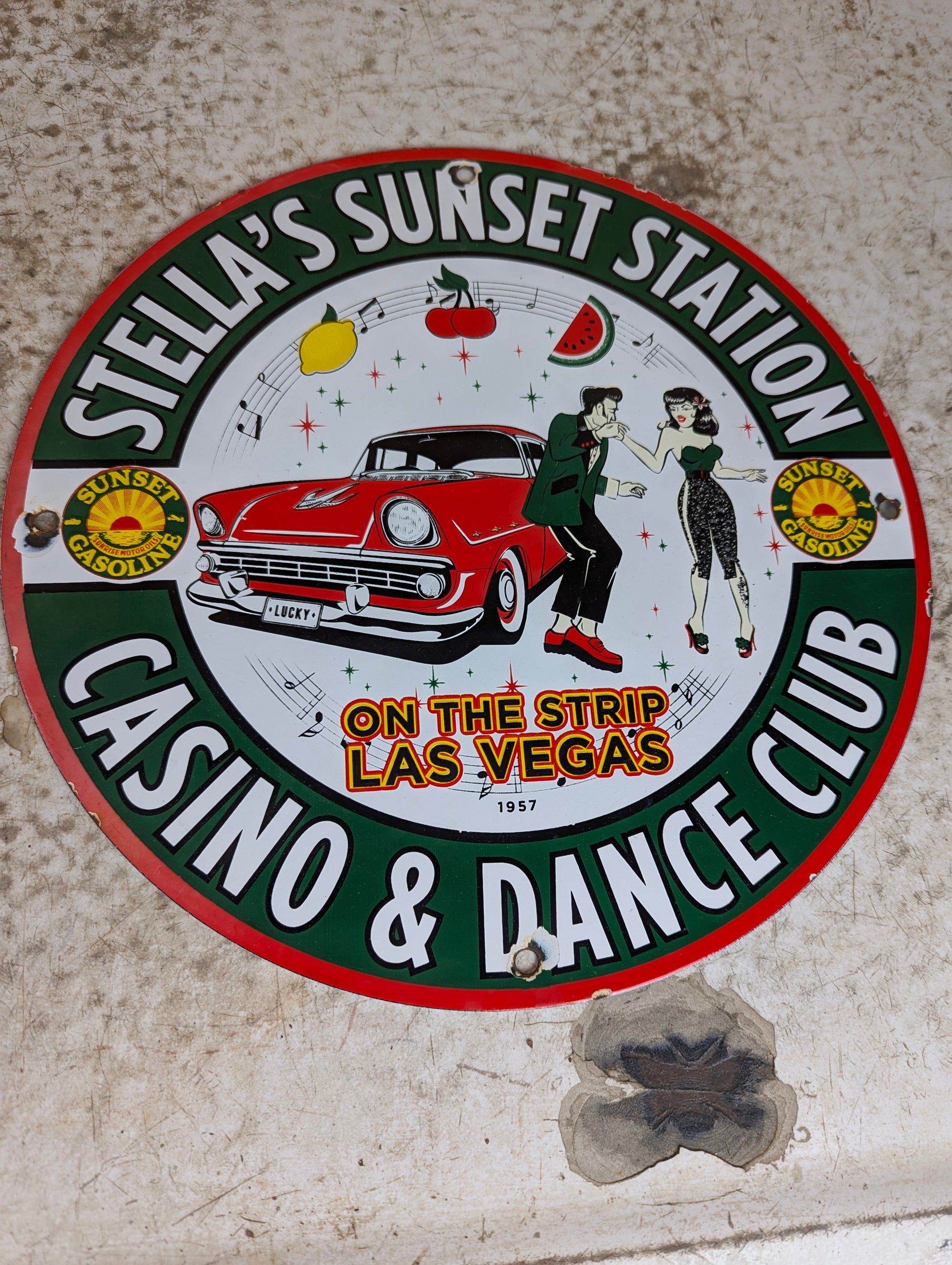 1957 Porcelain 12” Stella’s Sunset Station Gas Station Advertisement