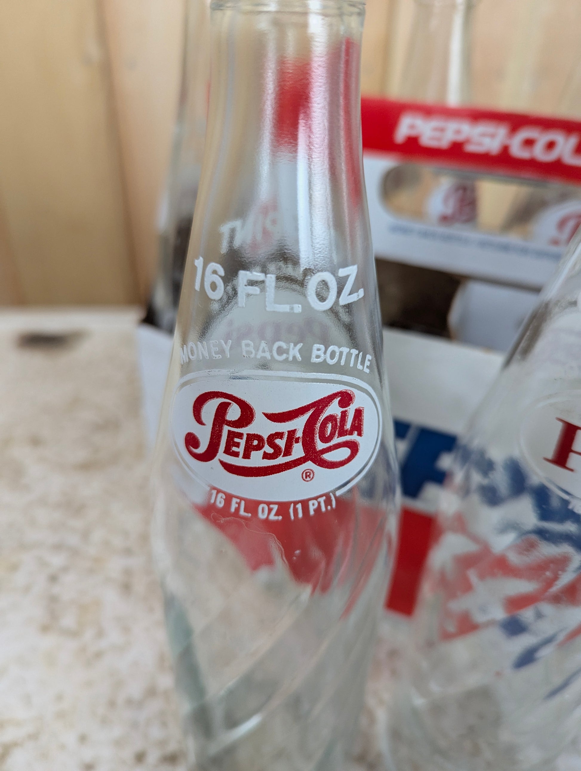 Elevate your man cave, party, or wedding decor with these 1970's Pepsi glass bottles. This 8 pack comes in a cardboard case, making them perfect for collectors. These 16 oz. bottles are in good used condition and are sure to bring a touch of nostalgia to any event.