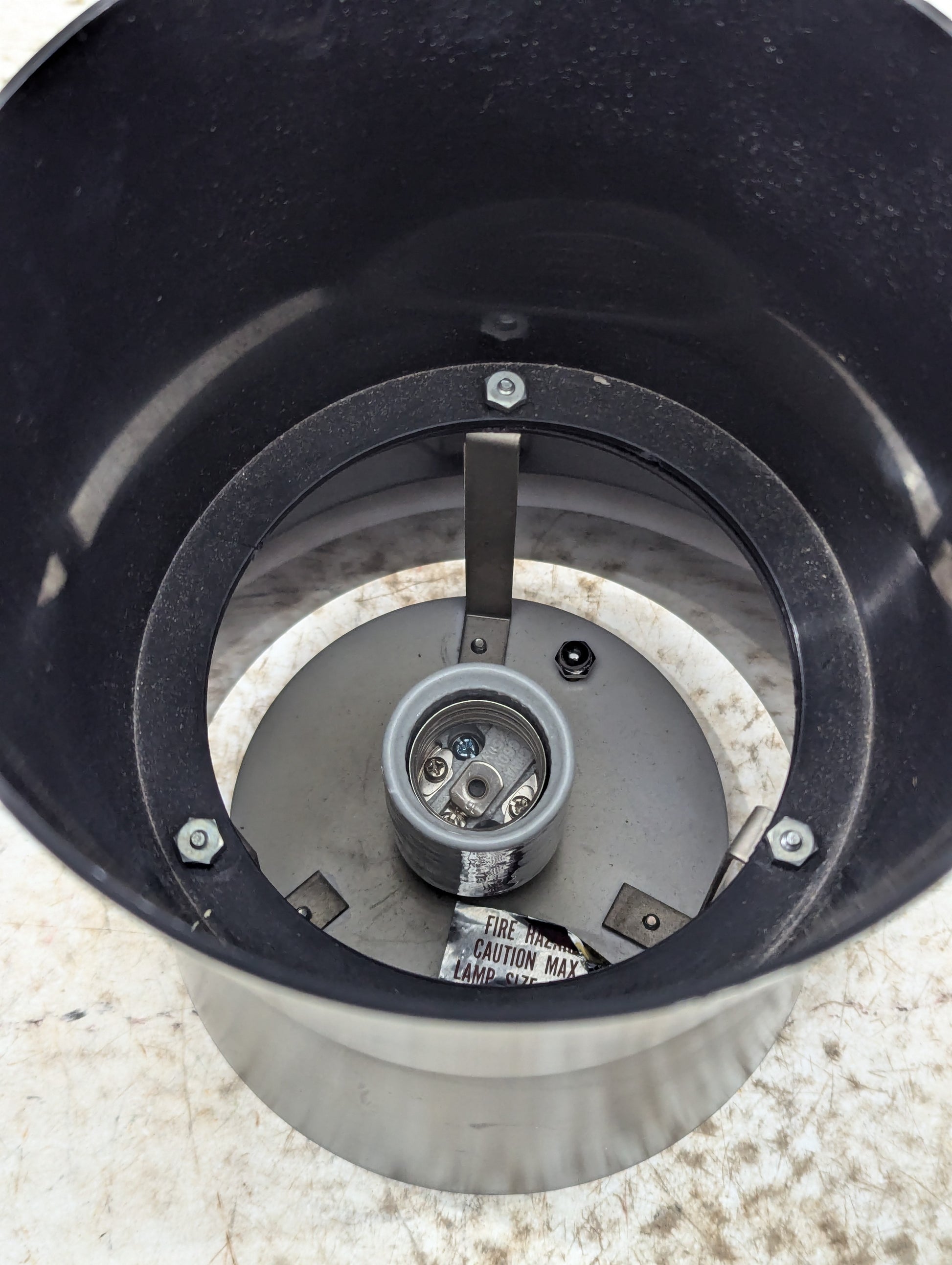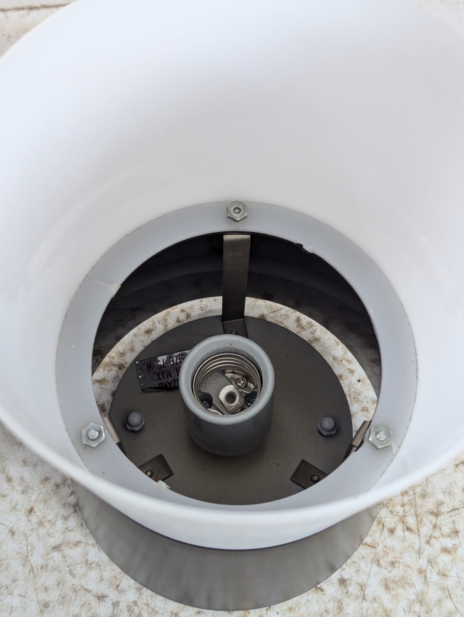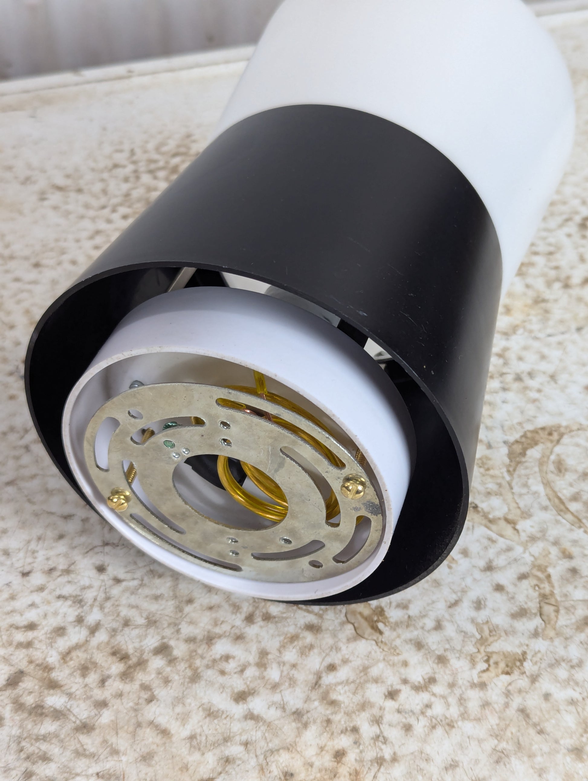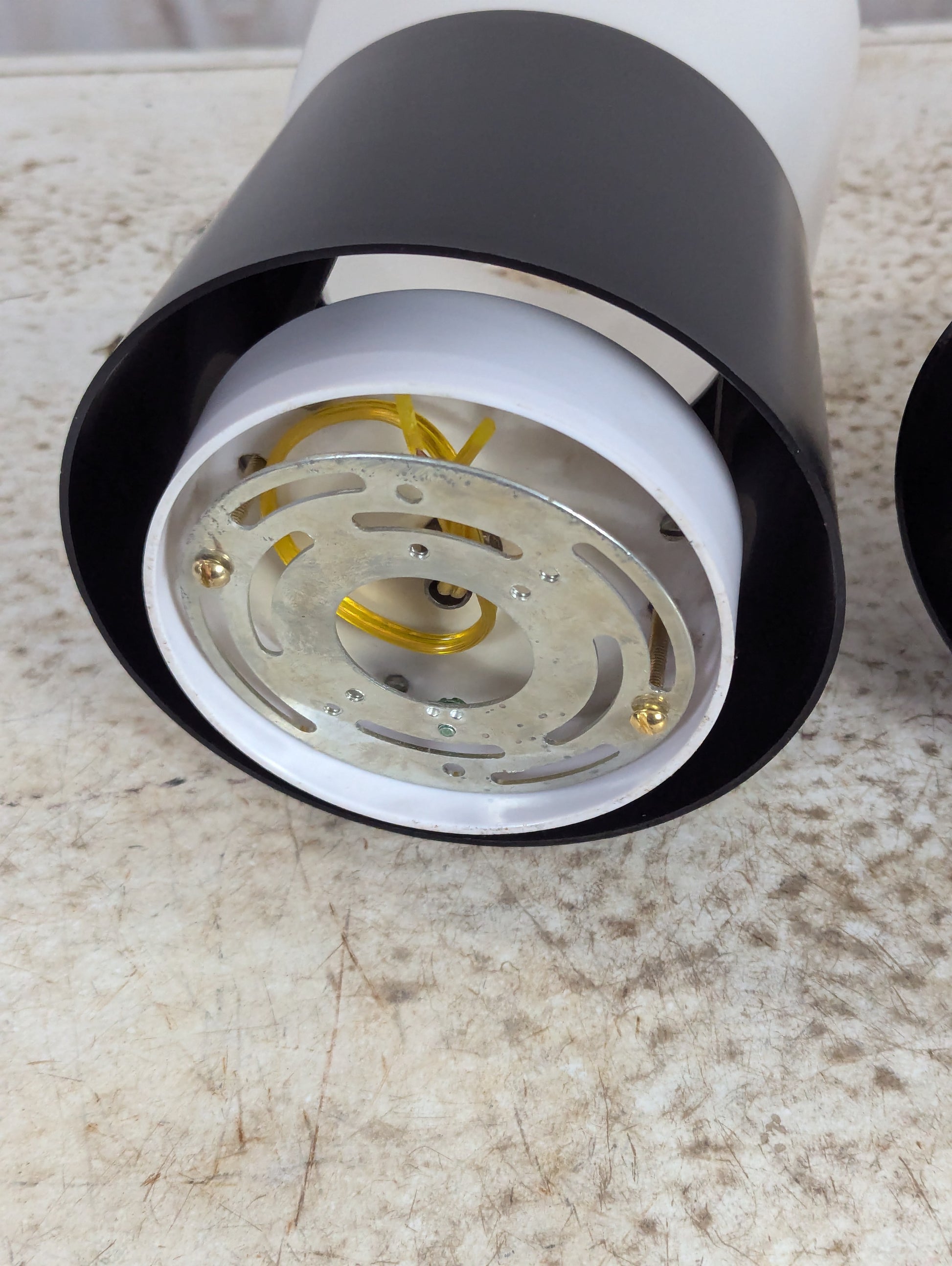 These 1980’s flush mount acrylic fixtures are in good condition and measure 6” x 10”. Each fixture features new sockets. Two of the fixtures are black and white and one is black socket—offering both style and functionality to enhance your space effortlessly.