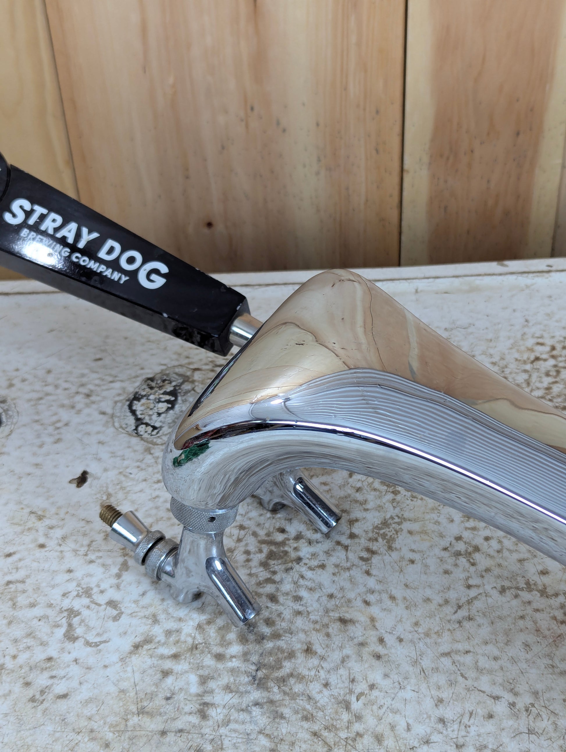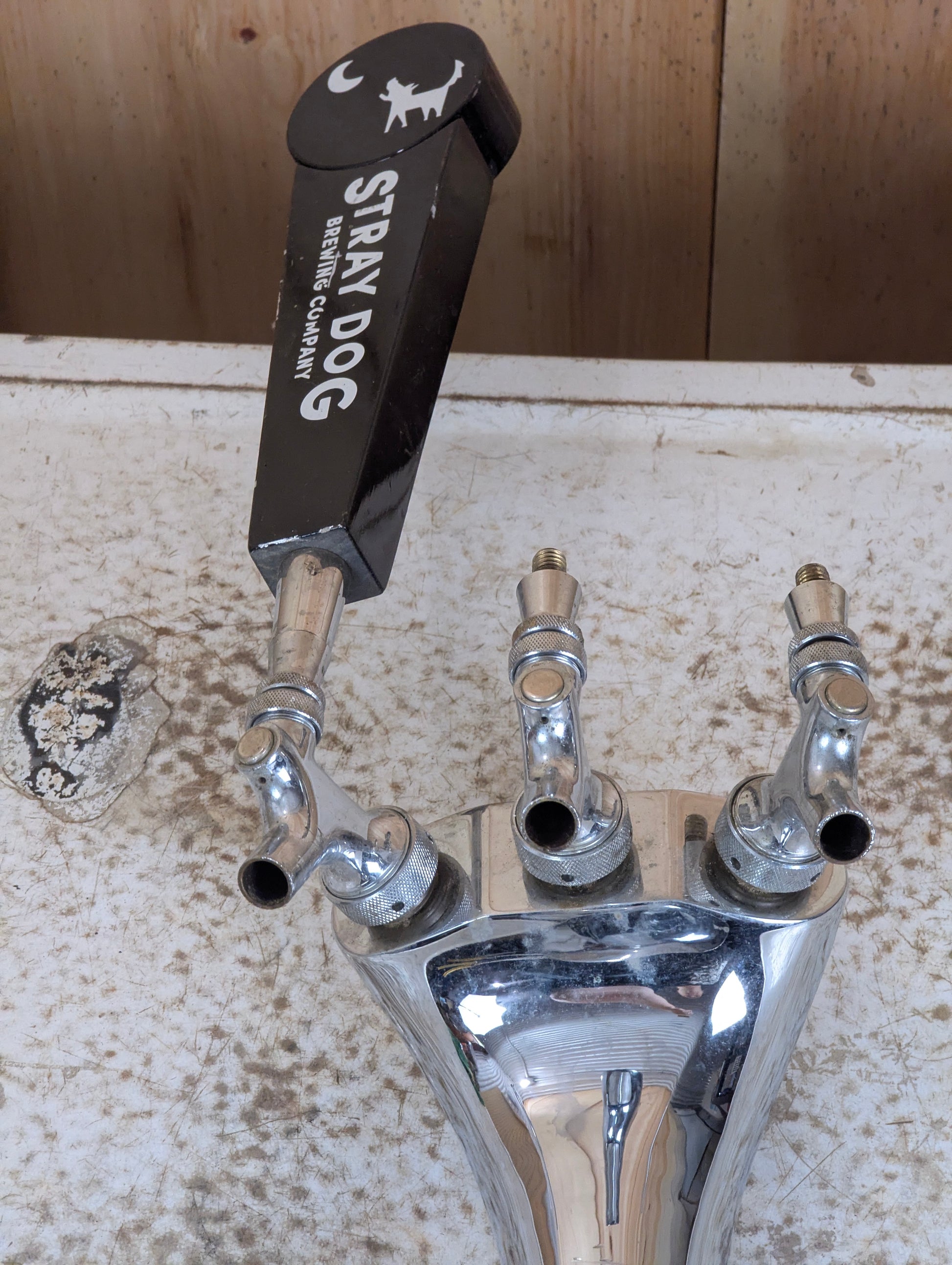 Enhance your home bar or business with this 3 Tap Cobra Style Draft Beer Tower featuring a single Stray Dog draft handle. Crafted for style and functionality, it offers a sleek chrome finish with minor scratches that do not affect performance. Perfect for serving multiple beverages, this tower combines durability and polished aesthetics, making it an excellent addition to elevate any draft beer setup.