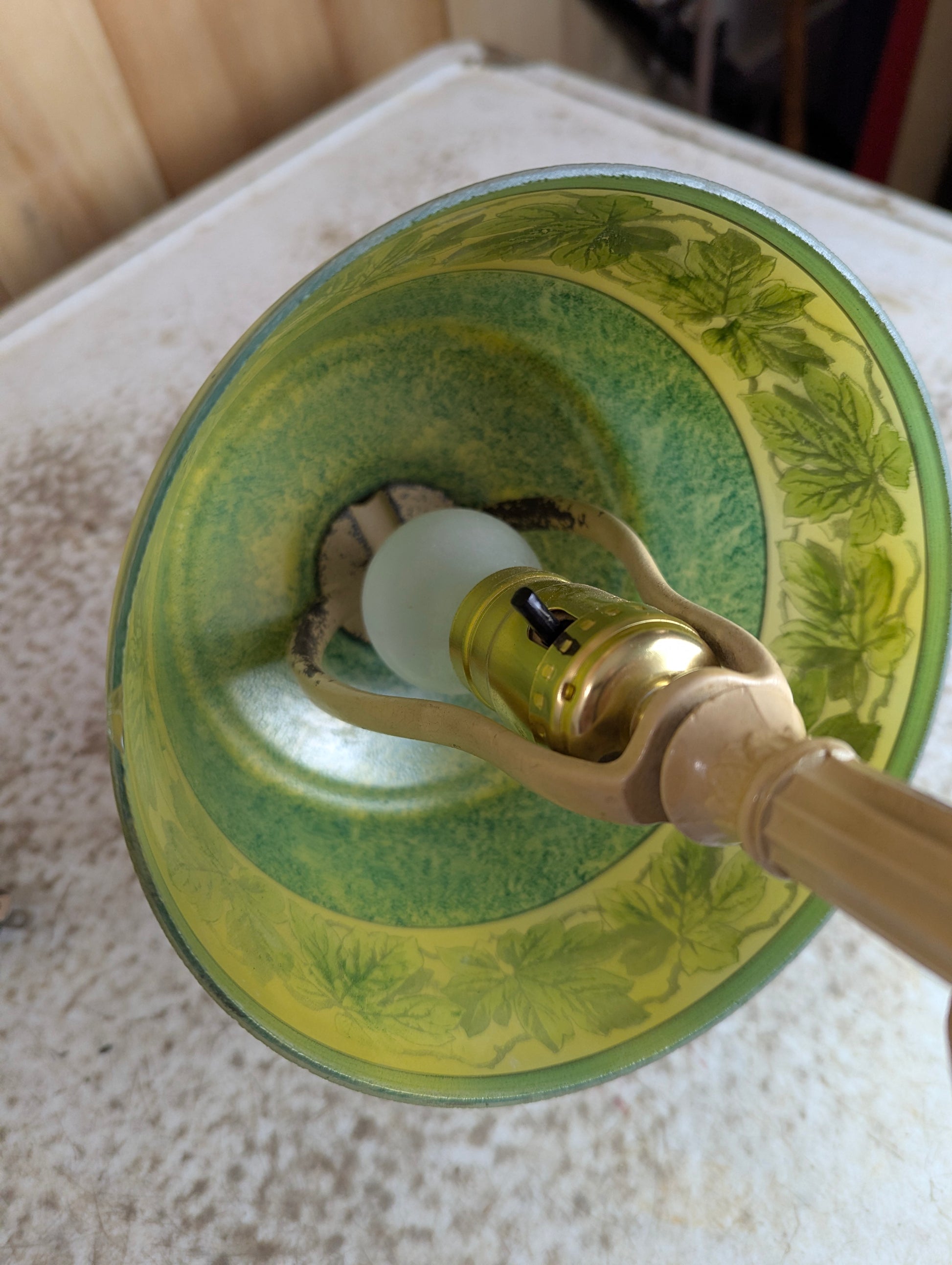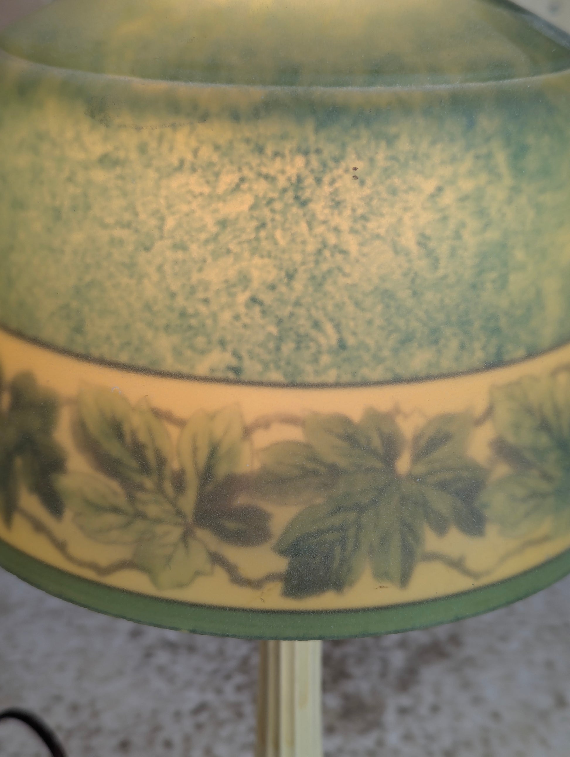 This stunning 1920s Art Nouveau table lamp brings timeless elegance to any room. The hand-painted green leaf design on the glass shade showcases authentic period craftsmanship, while the sturdy cast iron base provides lasting stability. Standing 14.25" tall with a 5.5" base, it's perfectly proportioned for desks, nightstands, or side tables. Recently rewired for safe, reliable use, this vintage treasure combines historical charm with modern functionality. A true collector's piece that transforms your space with warm, ambient lighting and classic Art Deco style.