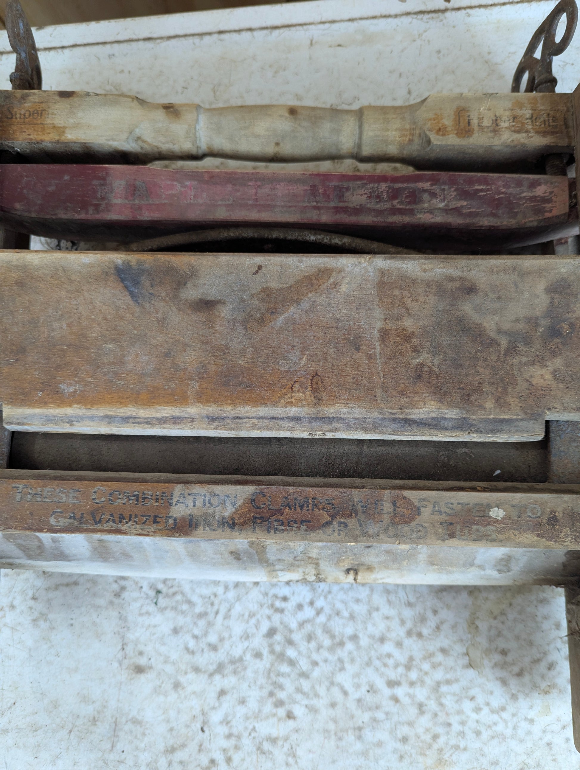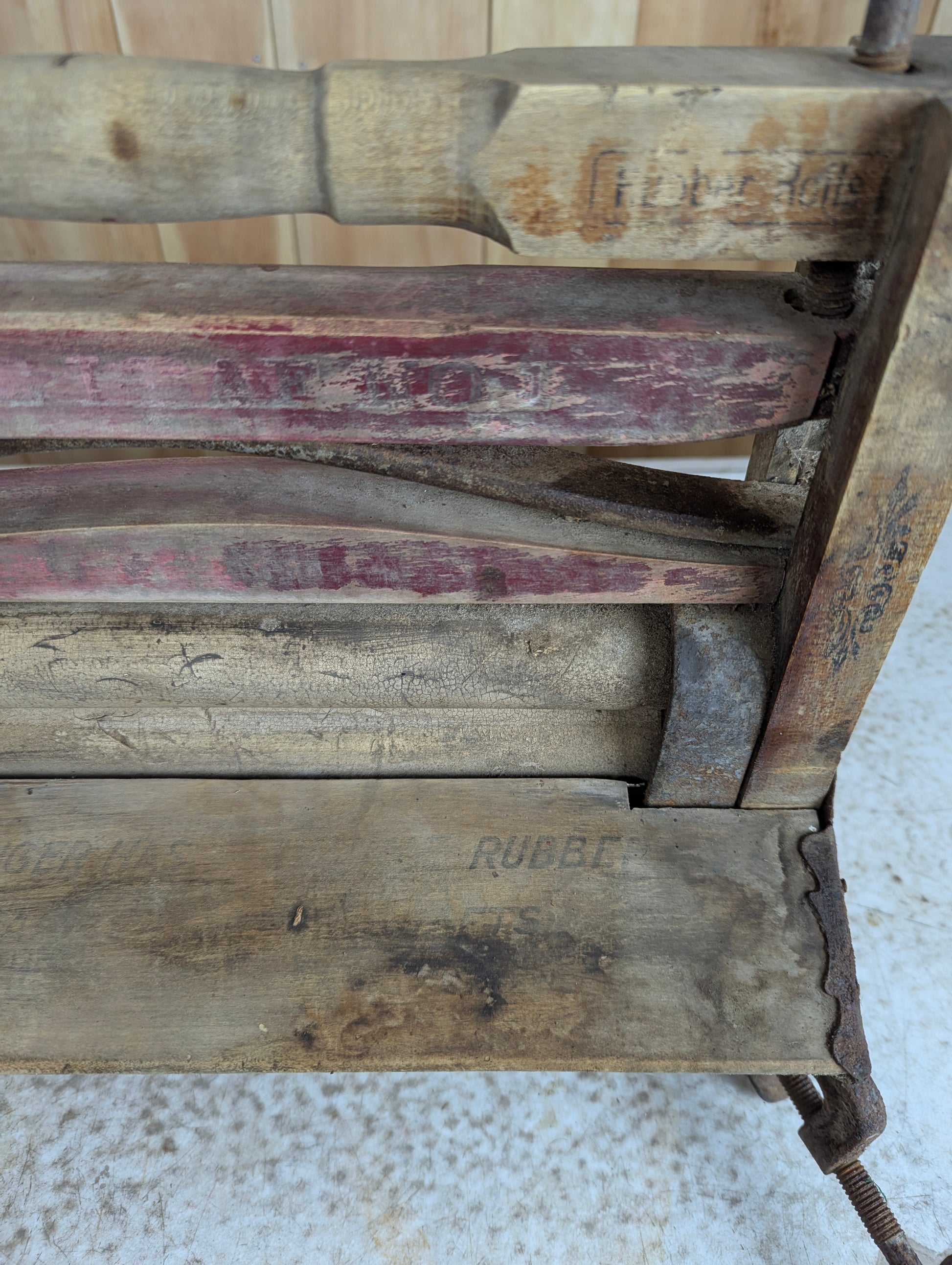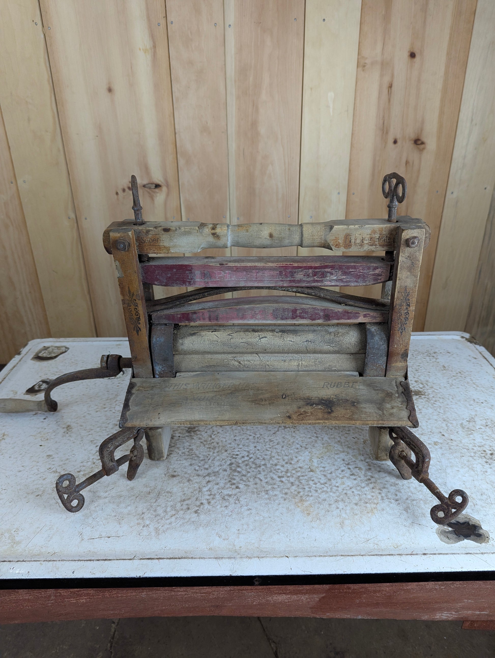 Discover the charm of farmhouse living with this Antique Beatty Maple Leaf #1 Washer Wringer. In good used condition, this hand-cranked wringer features attachments to easily secure it to a wash tub. Perfect for collectors or those seeking rustic décor, it combines practical vintage function with authentic rustic style, bringing a nostalgic touch to your home.