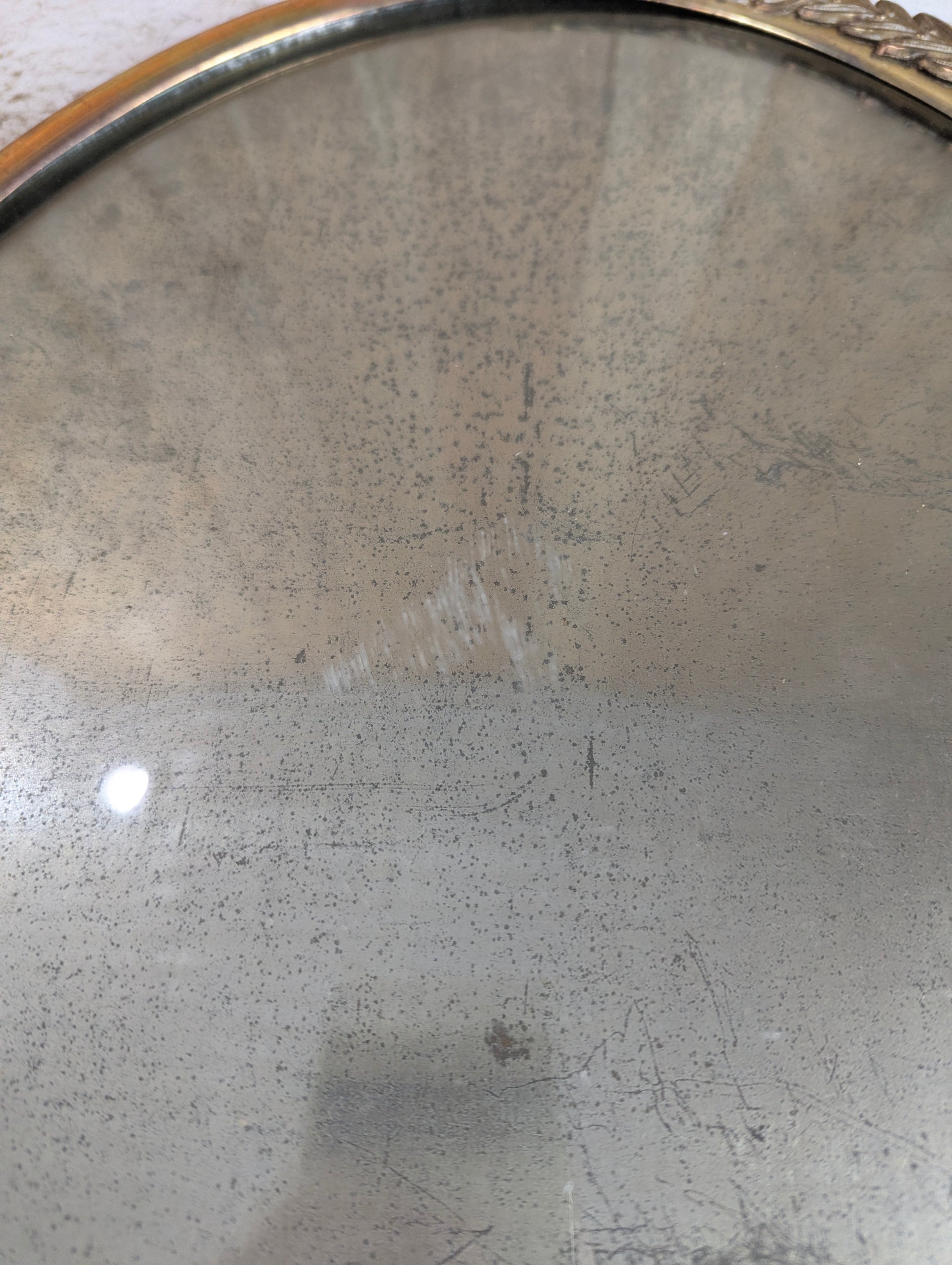 A striking vintage piece that brings timeless elegance to any room. This antique oval frame features an intricate copper and brass leaf motif, beautifully framed by bubble glass that catches the light. Measuring 14" x 20", it's the perfect size for a statement wall display. The combination of warm metallic tones and textured glass creates authentic vintage character—ideal for collectors who appreciate quality craftsmanship and nostalgic home decor. Whether you're decorating a period room or adding a focal point to modern interiors, this piece works as both functional frame and standalone collectible art object. A genuine antique treasure for those seeking distinctive, conversation-starting wall decor.