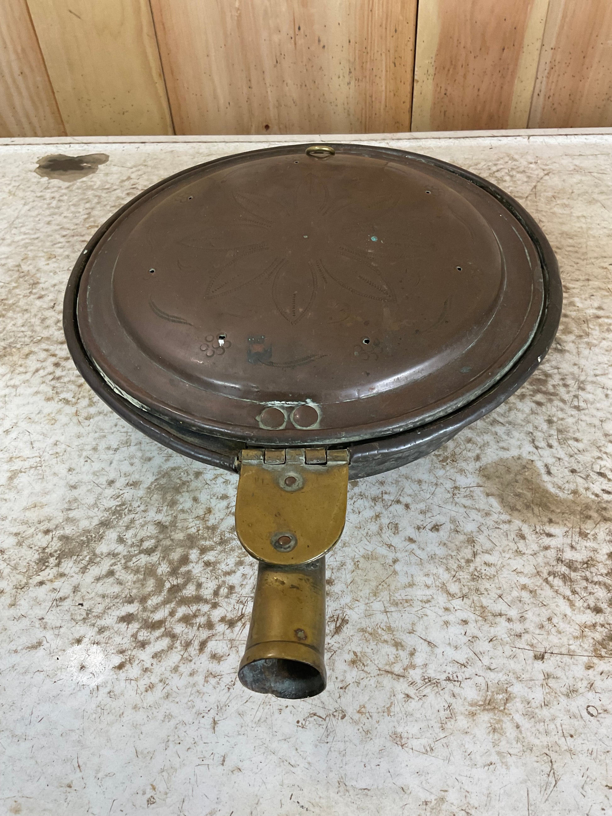 This antique copper bed warming pan, measuring 14” long with an 11” diameter and 3” high pan, is a charming collectible piece. Though it shows signs of wear, its unique design on top adds character and historical appeal. A distinctive addition for collectors or vintage enthusiasts seeking authentic, functional décor.