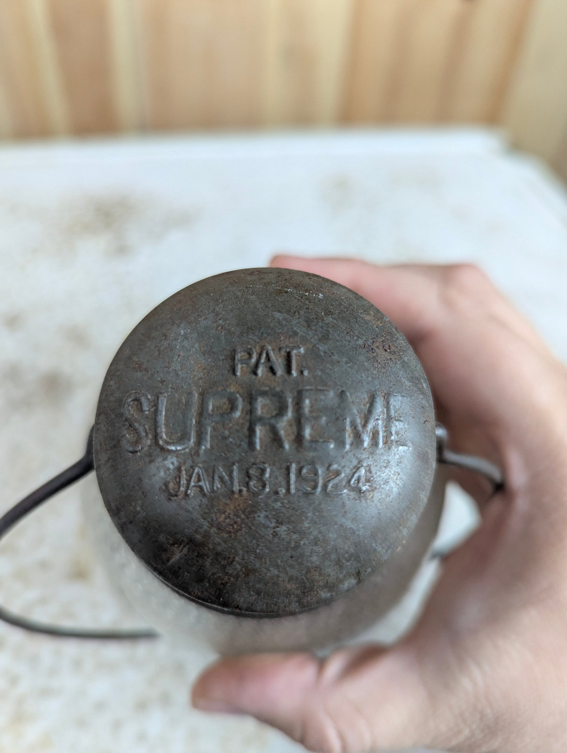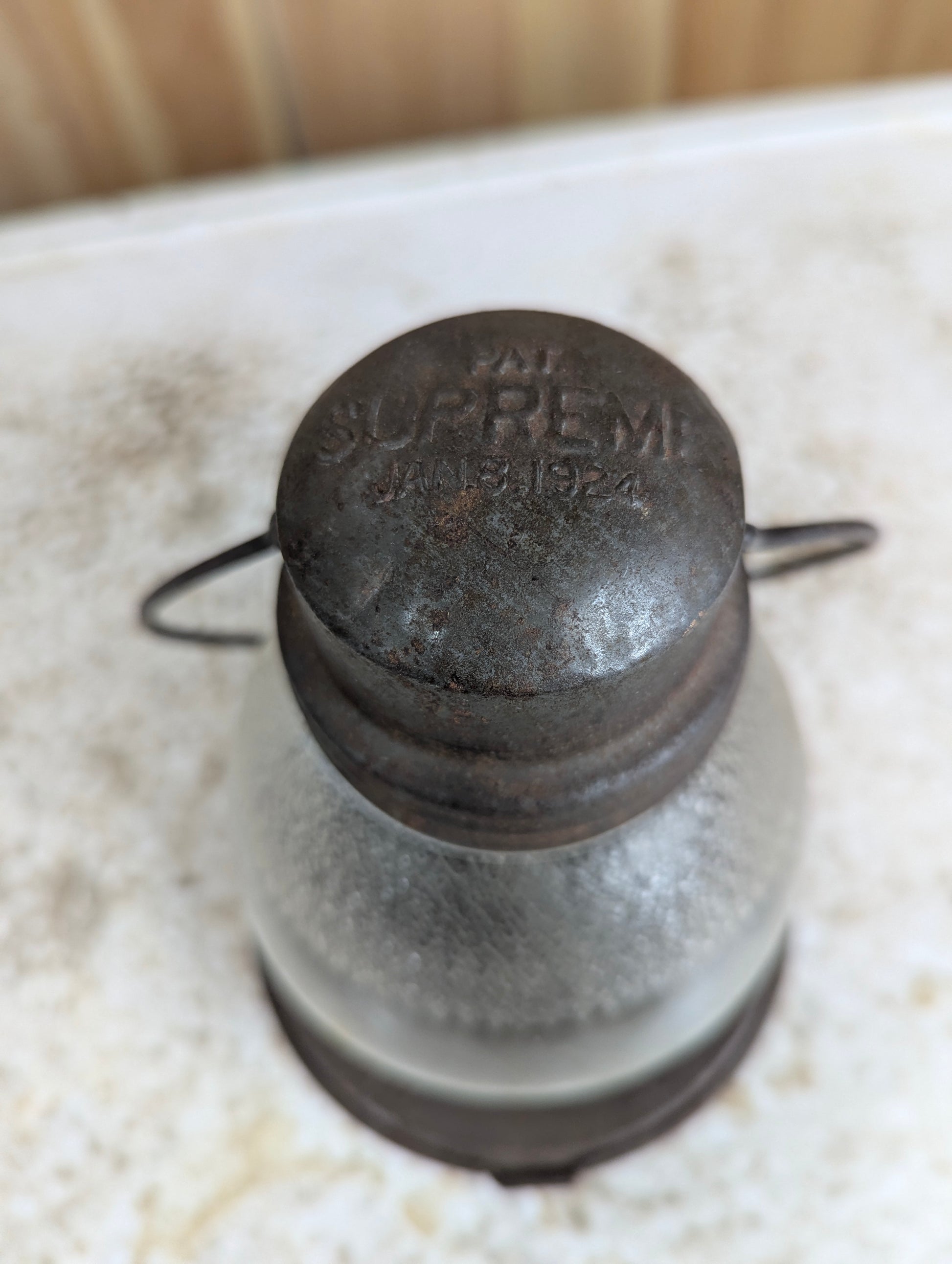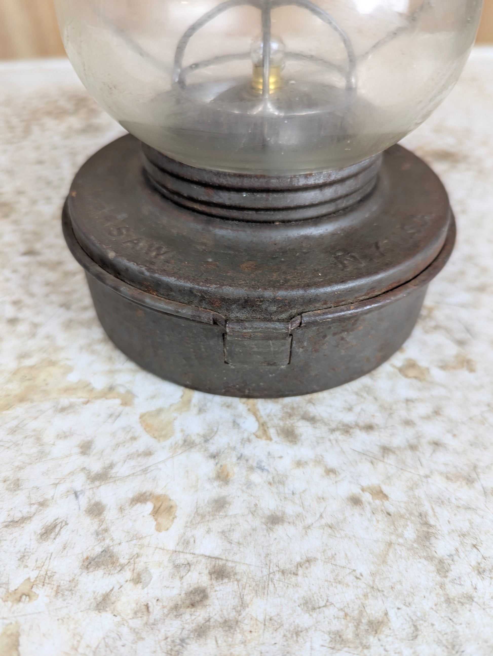 This Antique Embury Battery Lantern, patented on January 6, 1924, is a rare collectible from Warsaw, N.Y. USA. Featuring a sturdy carrying handle and an intact glass globe, this battery-operated railroad lantern combines vintage charm with practical design. Its well-preserved condition makes it a standout piece for collectors or those seeking unique historical décor. Add a genuine piece of railroad history to your collection today.