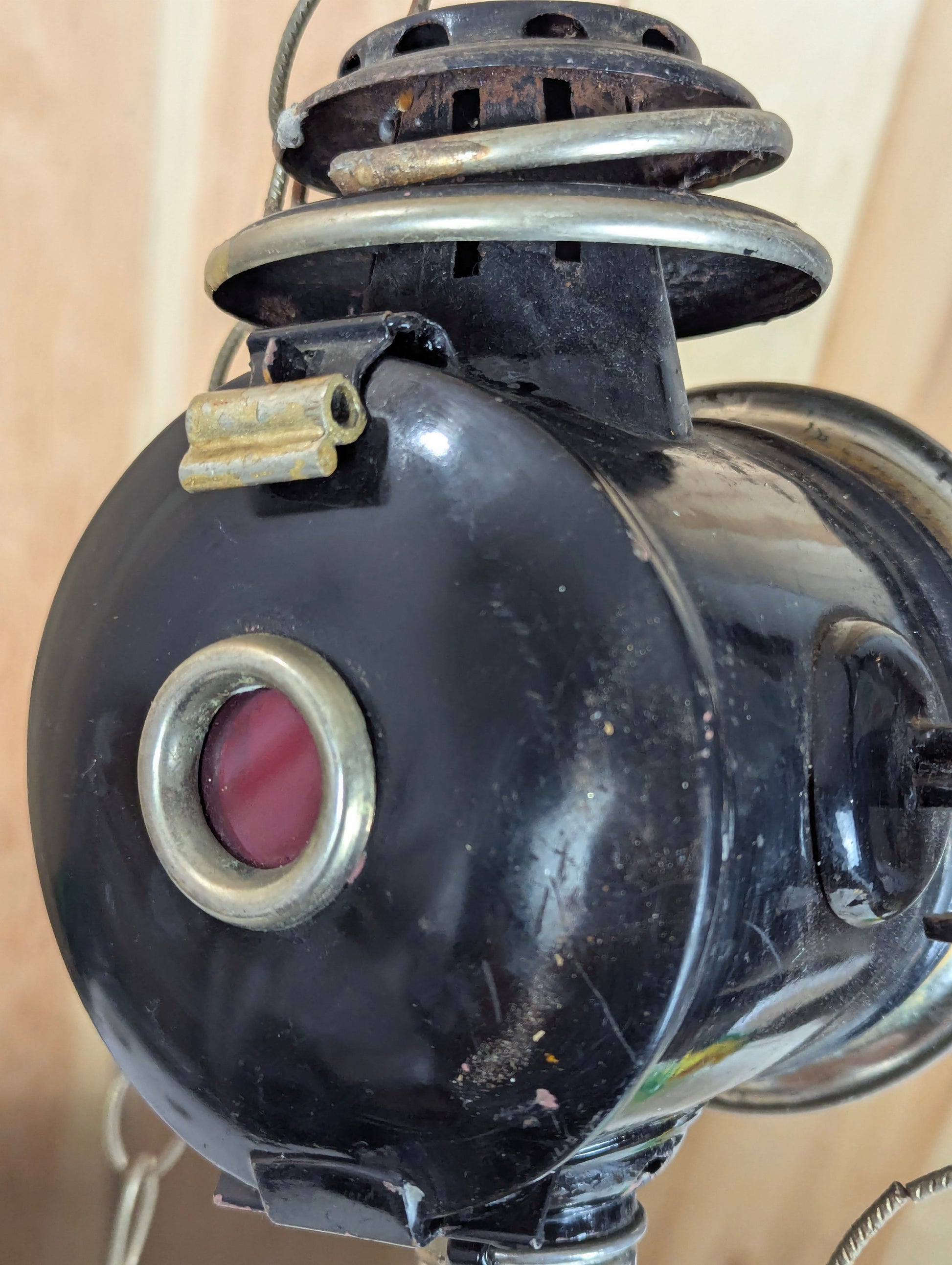 This Antique Fairbanks Lavender & Son Carriage Coach Lamp Lantern is a charming collectible in good used condition. The glass and vibrant red rear lens remain intact, preserving its original appeal. Featuring a side bracket, a bottom handle, and once candle-operated, this lantern combines vintage craftsmanship with functional design—perfect for collectors or as a unique display piece.