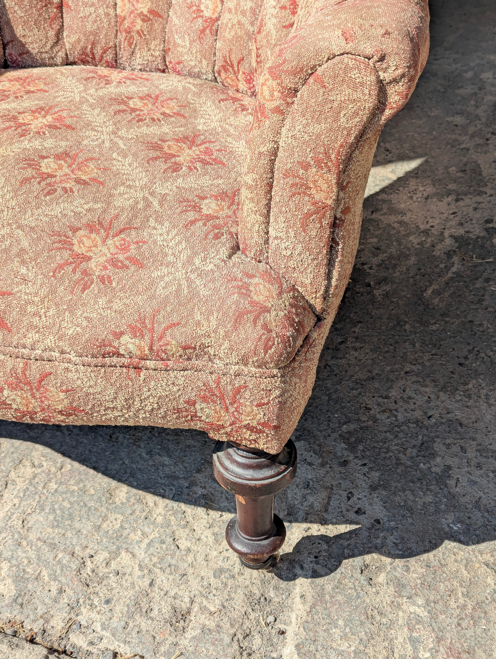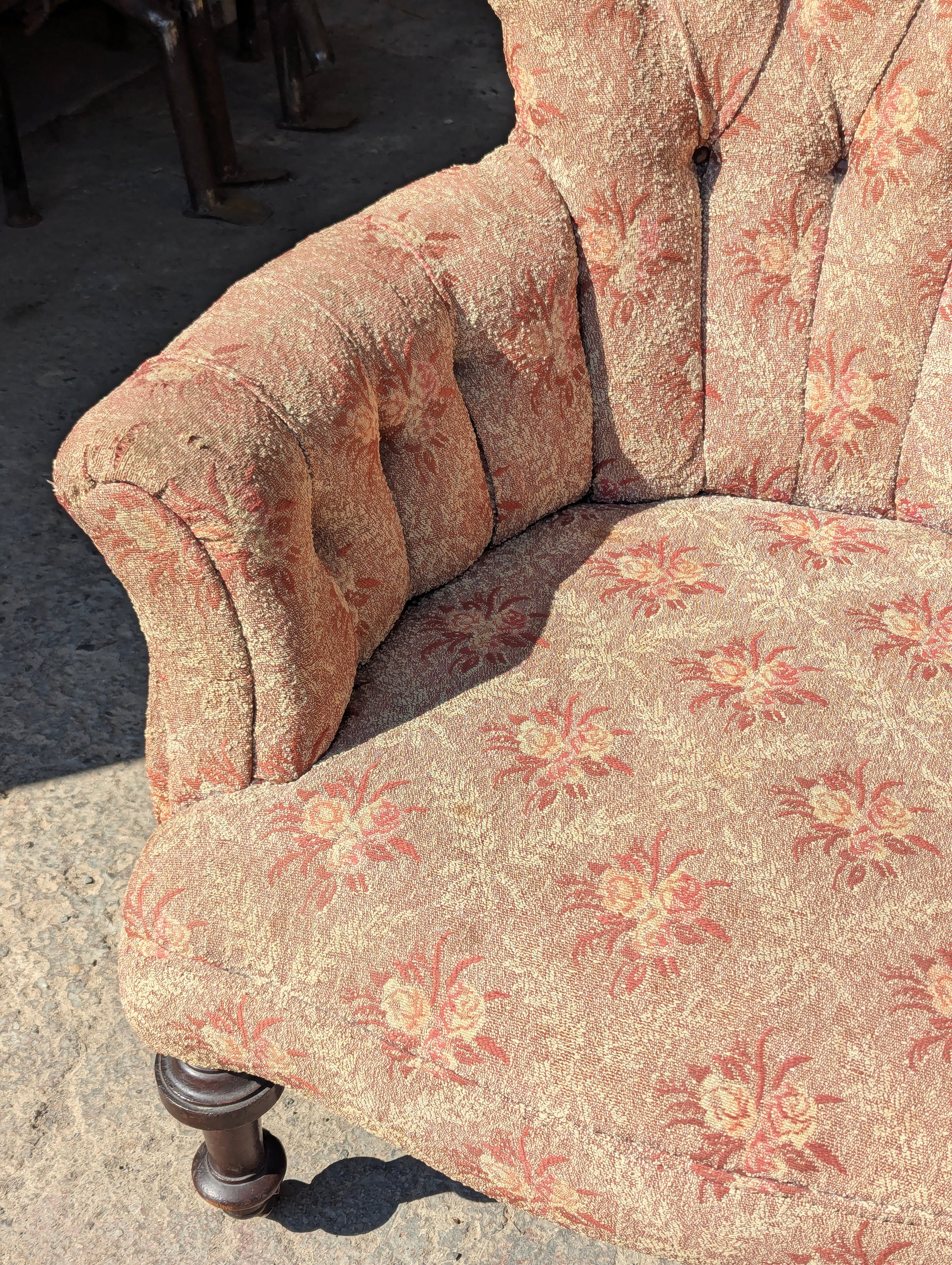 This Antique Flowered Chair combines classic charm with practical features. Upholstered for comfort, it boasts a sturdy back height of 42" and a spacious 20.5" wide seat positioned 16" from the ground. Designed with wheels at the base, it’s easy to move while adding vintage elegance to any room. Despite some signs of wear, it’s a tasteful addition that enhances both style and functionality.