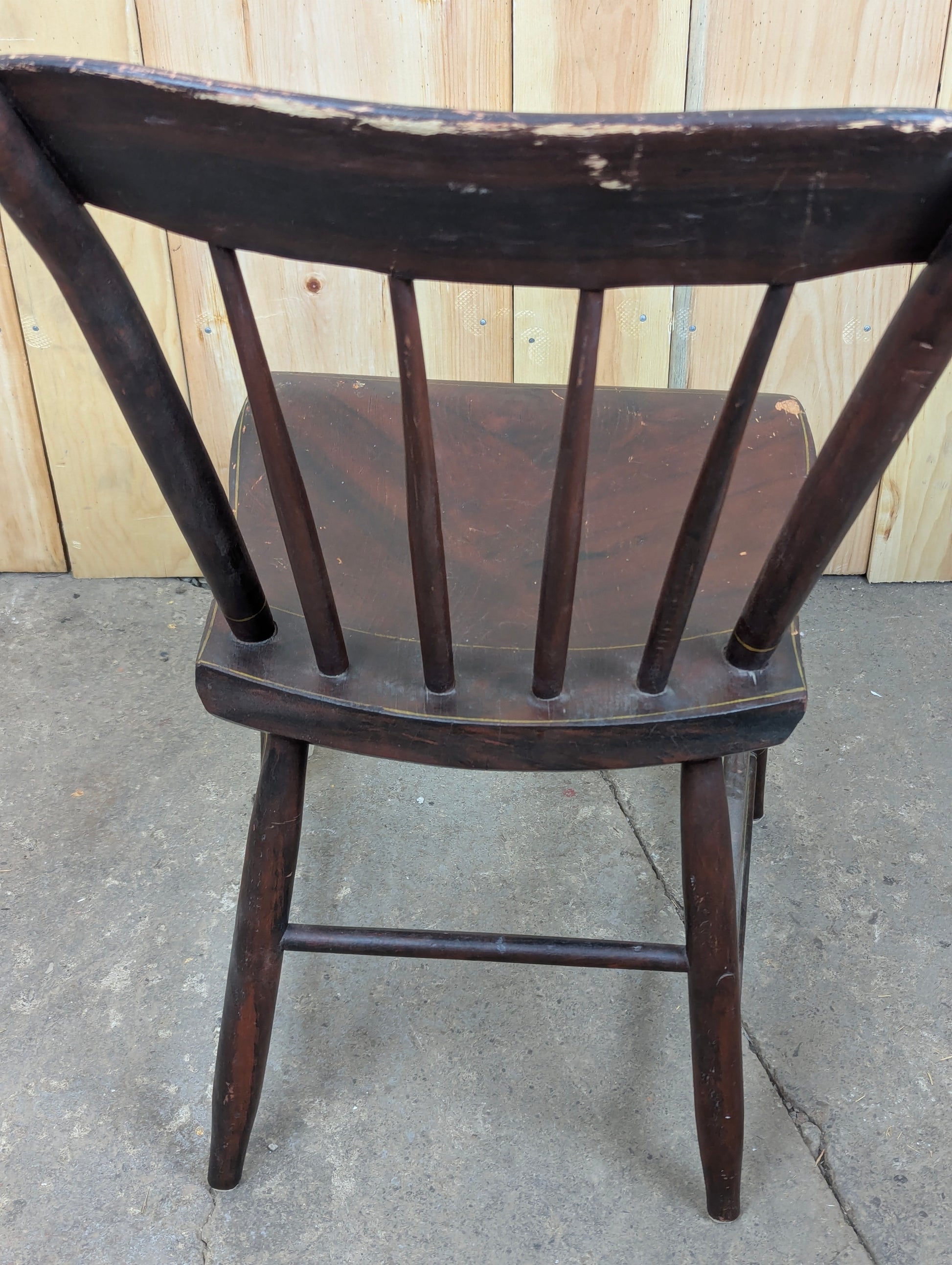 This antique handcrafted painted wooden chair combines timeless charm with sturdy construction. Featuring a shaped seat 17” high and a 32” back height, it offers comfortable support. With six durable wrungs, this chair is built to last while showcasing its unique character through signs of wear. Perfect for adding vintage elegance to any space.