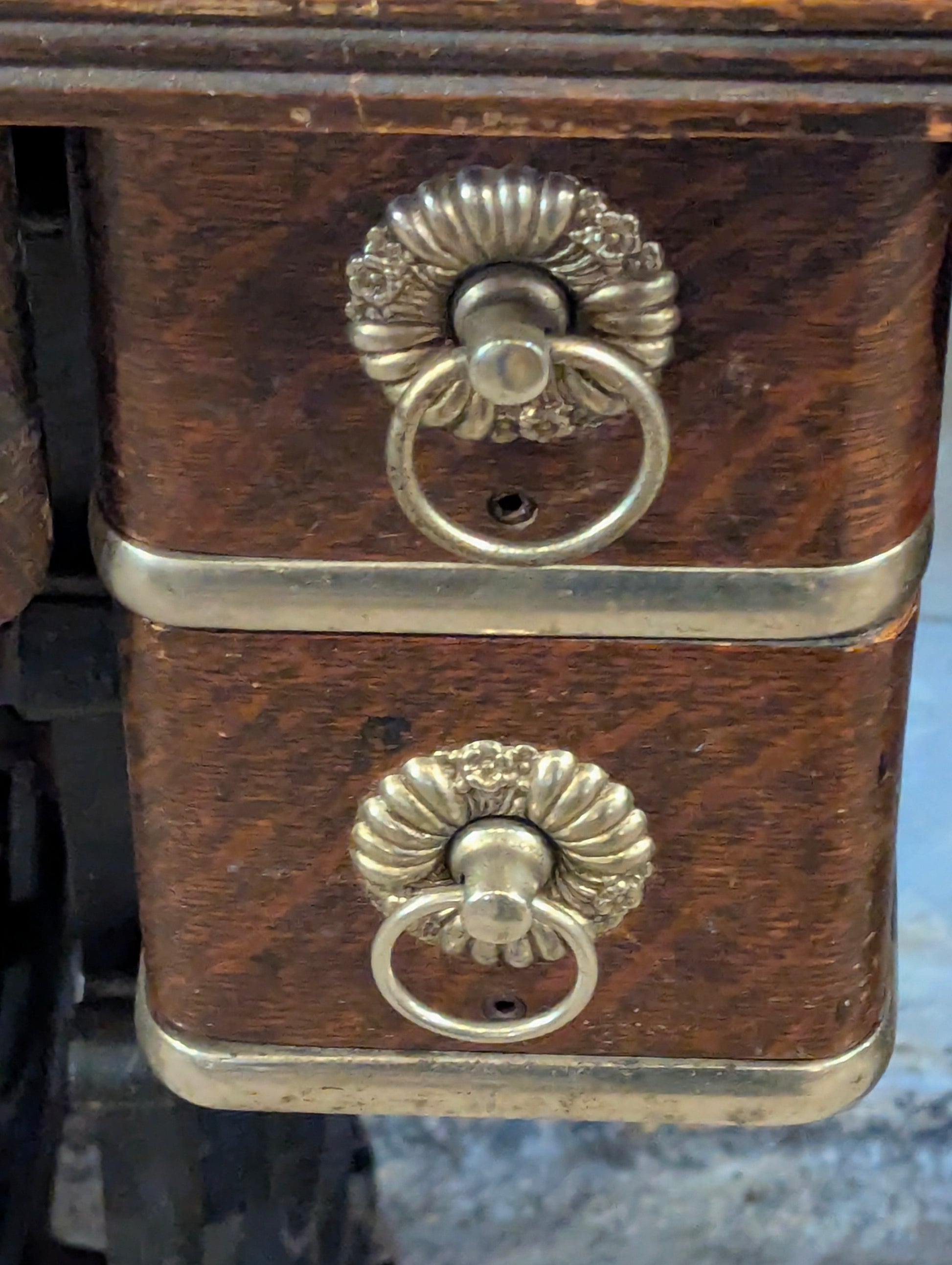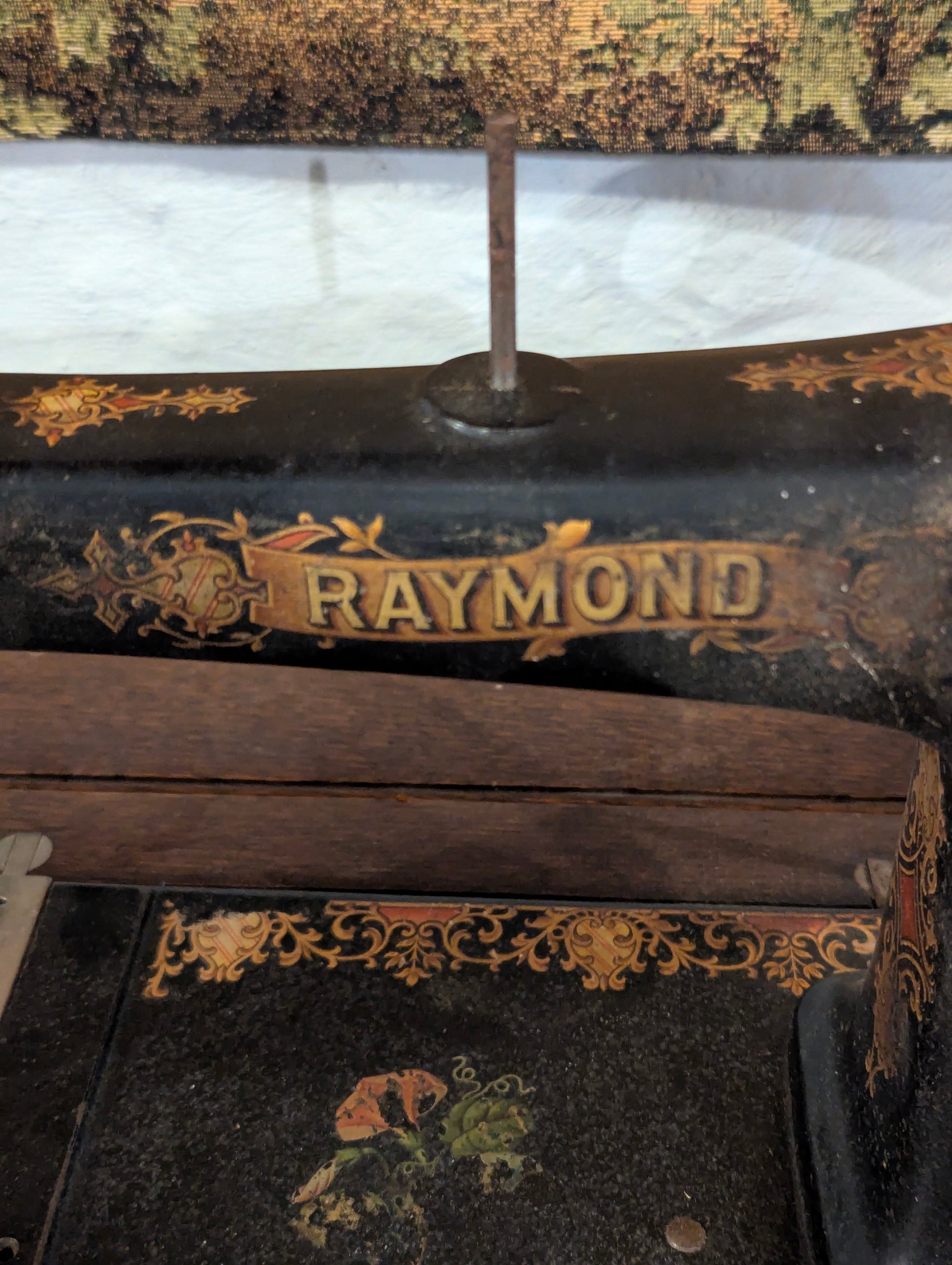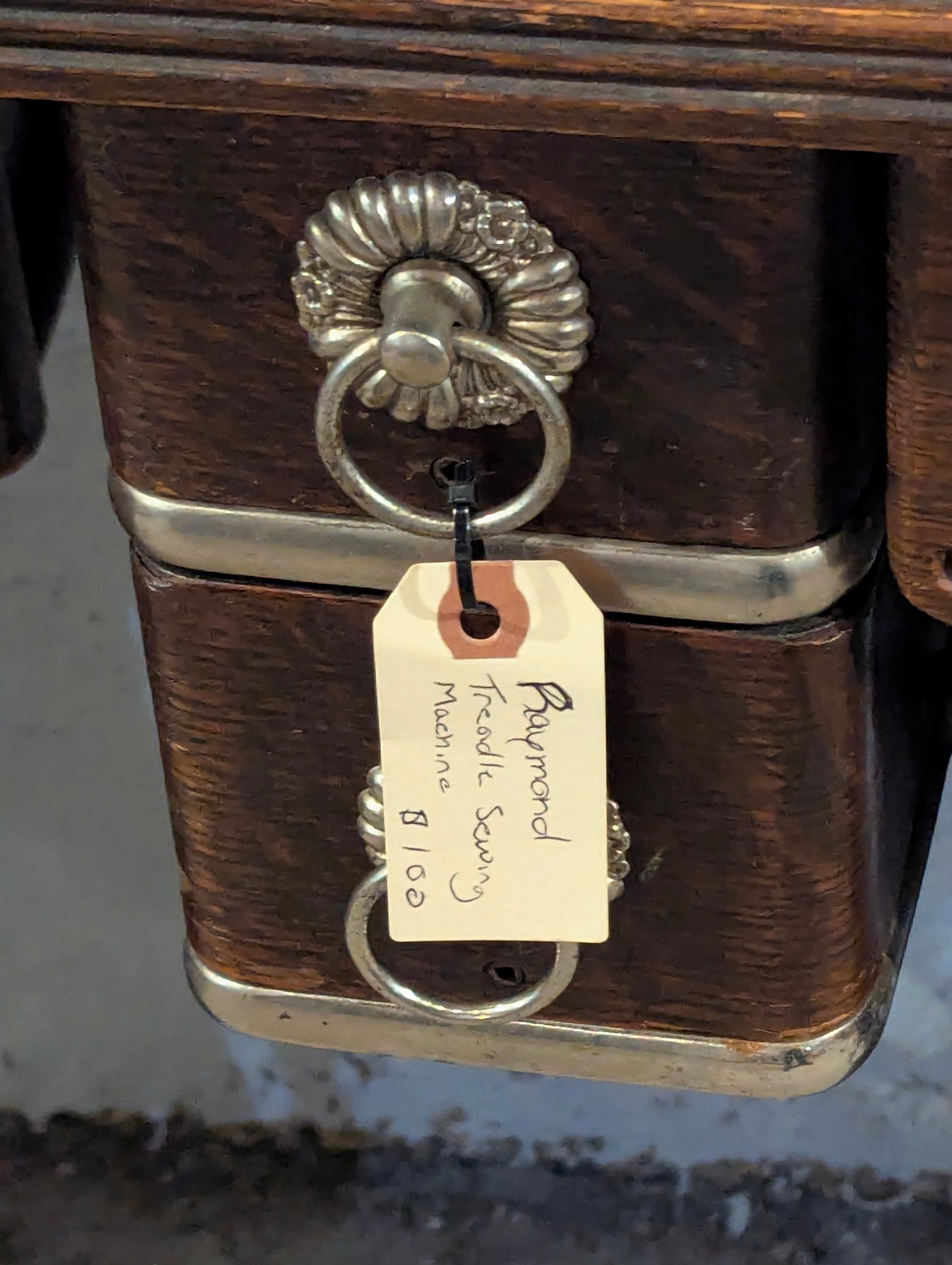 This Antique Raymond Treadle Sewing Machine made in Guelph Ont operates but needs a new belt. It combines timeless craftsmanship with practical storage and measures 34.5” x 18” with a height of 29.5”. Featuring a sturdy cast iron base and 4 wooden drawers with original hardware, it offers both durability and convenient space for your sewing essentials. While it shows signs of wear, its classic design and reliable build make it a charming and functional addition to any collection or workspace. Embrace the heritage and utility of this vintage piece today.