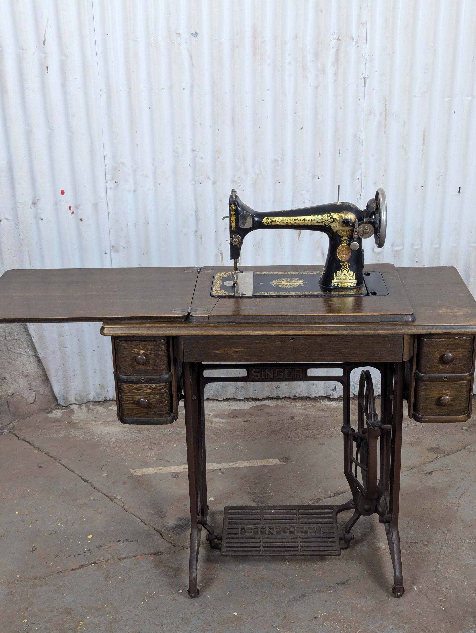 This Antique Singer Sewing Machine combines timeless craftsmanship with practical functionality. In good condition, it features a convenient flip-down drawer on the front and two additional drawers on each side for maximum storage. The wheels on the bottom provide easy mobility, allowing you to position this beautiful piece of history anywhere in your home. Perfect for collectors and sewing enthusiasts alike!