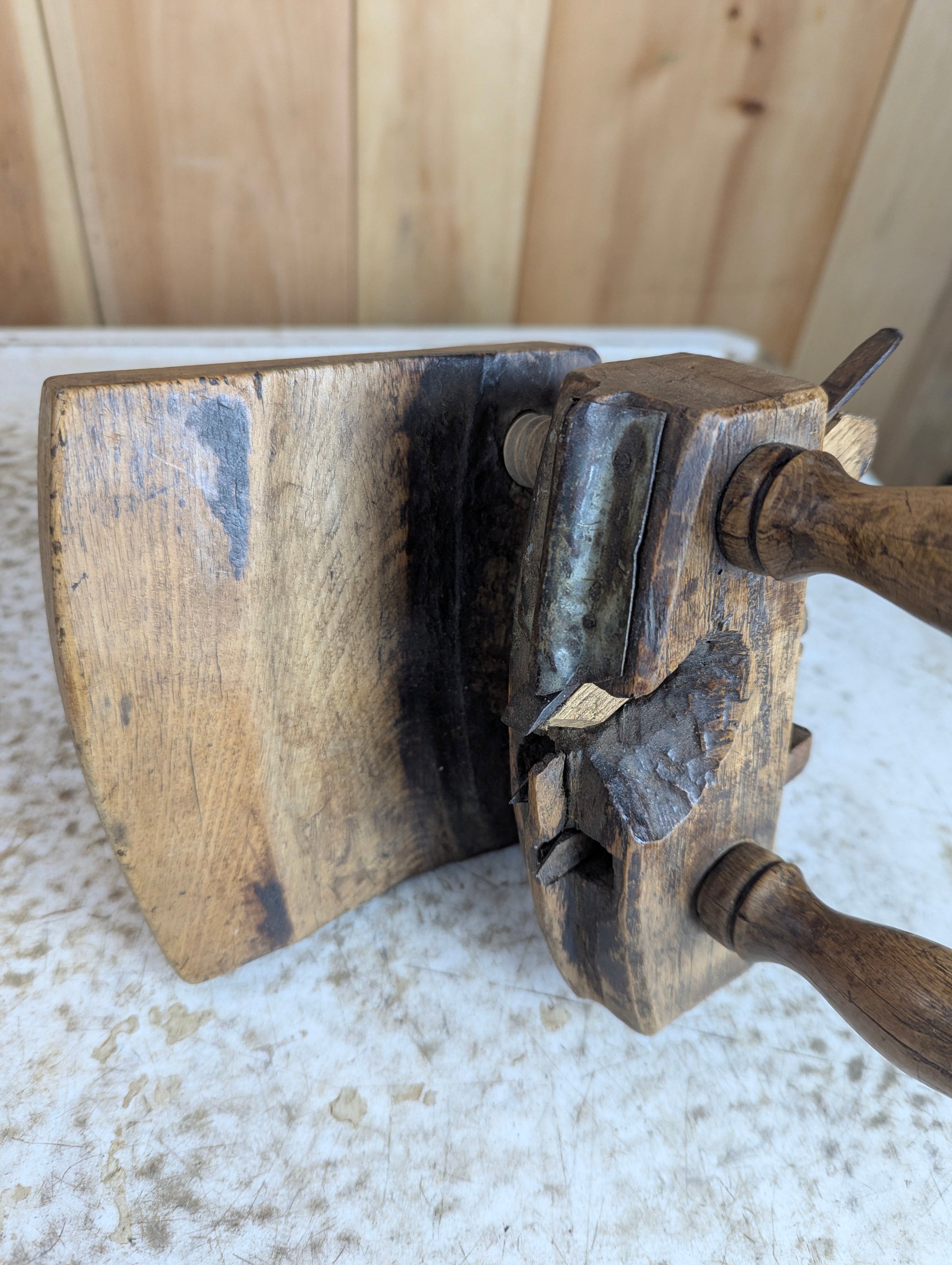 This vintage wooden screw arm plow plane is a genuine workshop tool in good used condition, showcasing authentic craftsmanship from a bygone era. The adjustable design allows for precise depth and width settings, making it versatile for various woodworking tasks. Its solid wooden construction provides reliable performance for planing grooves and rabbets. Perfect for collectors, restoration enthusiasts, or woodworkers who appreciate traditional hand tools. A functional piece of woodworking history with character and practical utility.