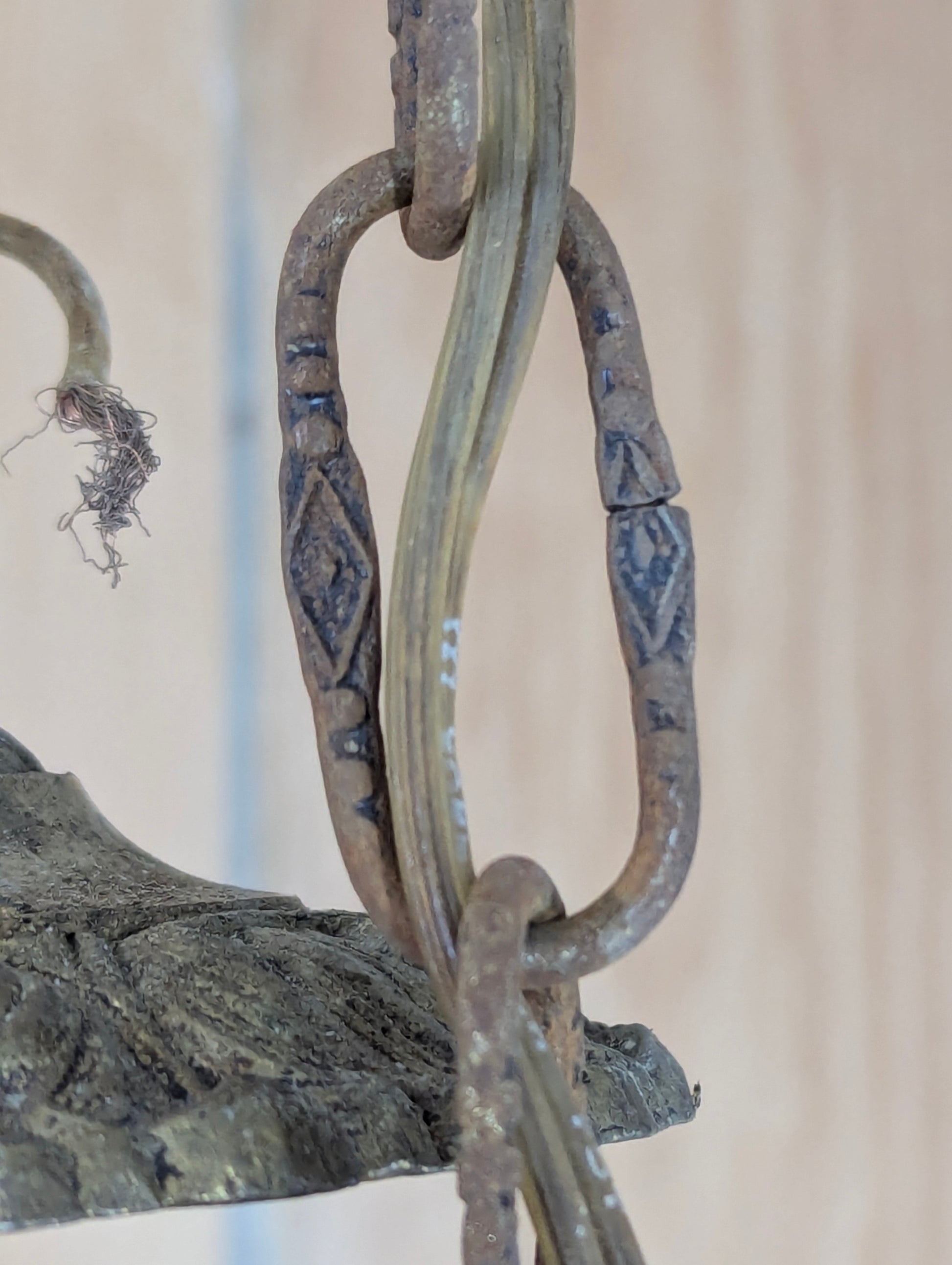Elevate your dining room with this stunning Art Nouveau solid brass chandelier. Featuring a swirling floral design and decorative chain links, it boasts original patina that adds authentic vintage charm. Measuring 28” wide and hanging down 17”, this six-light fixture offers both elegance and a warm, inviting glow. Perfect for enhancing any vintage home décor, it’s a timeless centerpiece that brings character and sophistication to your space.