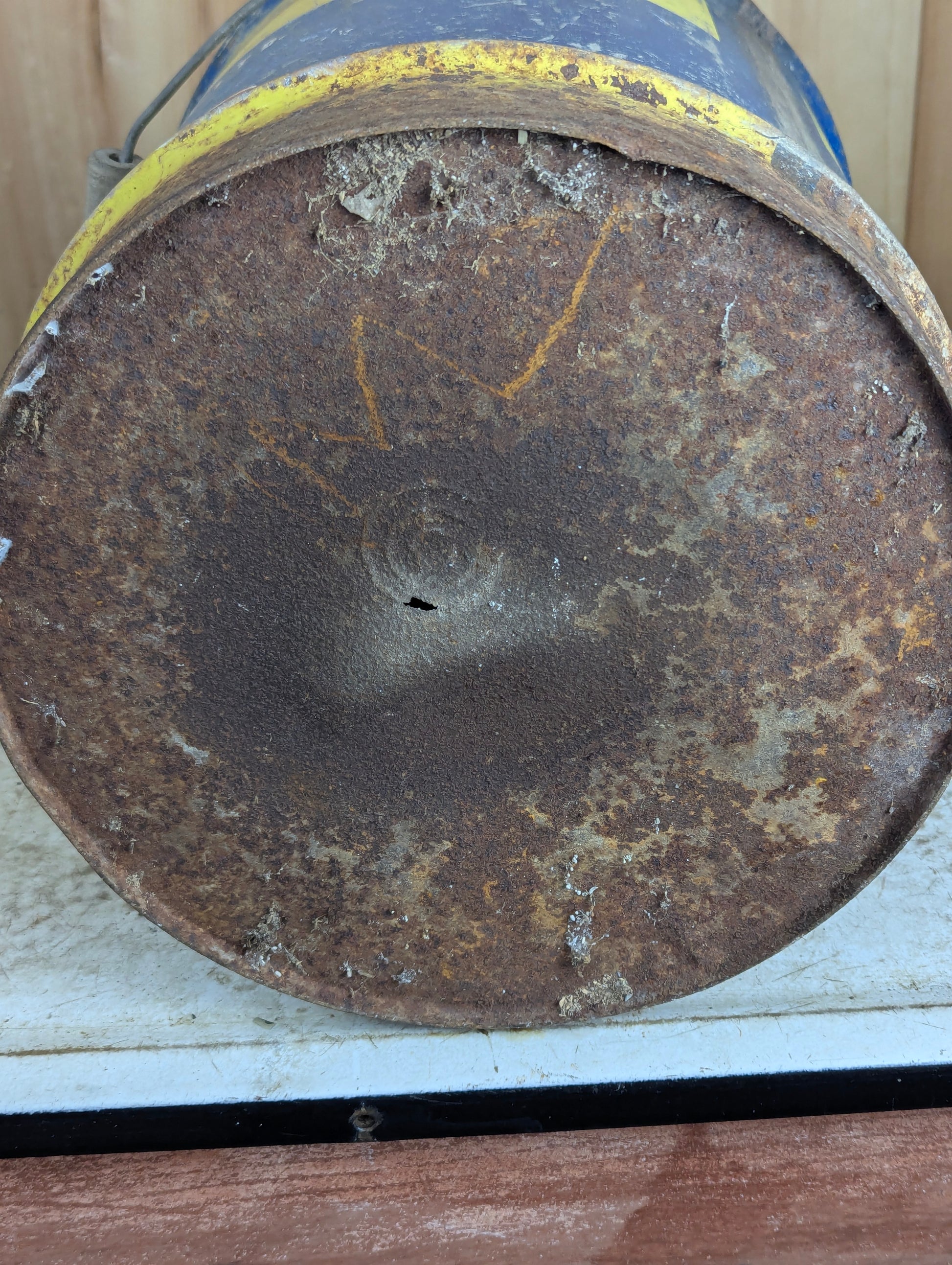 This vintage Canadian Tire Oil Can stands 15” tall with an 11.5” diameter and features a convenient carrying handle on top. Its authentic, good used condition makes it a perfect collectible piece to enhance your man cave, workshop, or garage decor. Combine style and nostalgia while showcasing a unique conversation starter with this timeless piece.