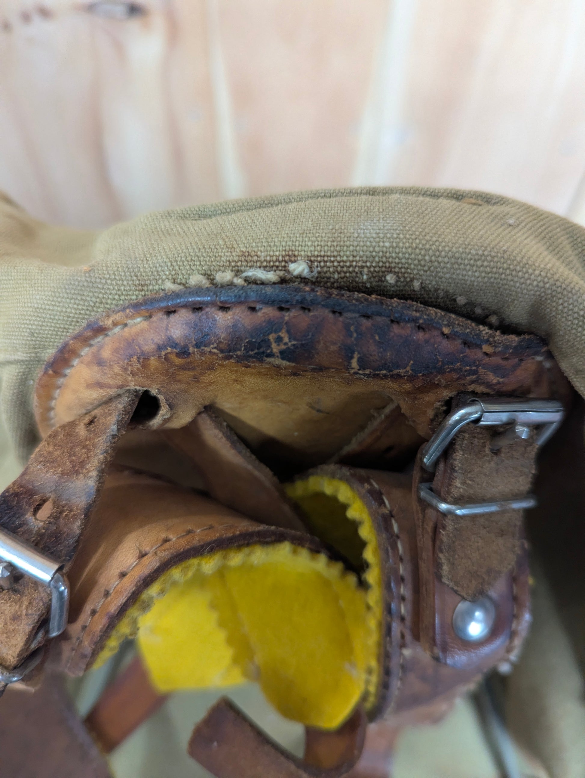 This Canvas Army Rucksack Backpack combines rugged durability with practical design. Featuring a sturdy metal frame at the back and ample interior storage, it’s perfect for backpacking, camping, or fishing trips. The well-maintained drawstring ensures secure closure, while the leather straps provide reliable support—best kept oiled and clean for long-lasting use. The leather stitching on top back needs to be fixed. With no holes inside, this backpack offers trustworthy protection for your gear. Choose this versatile pack for your next outdoor adventure.