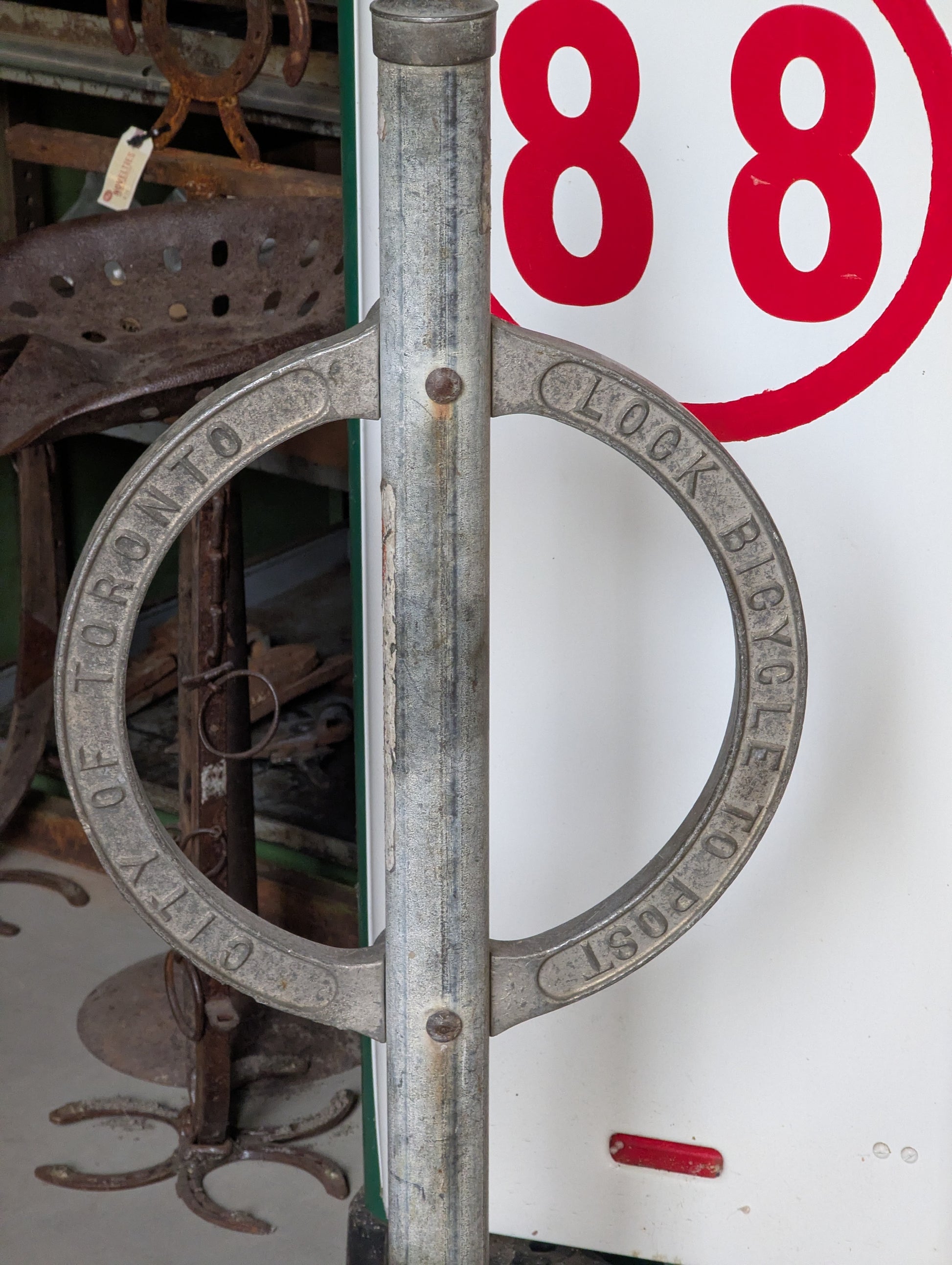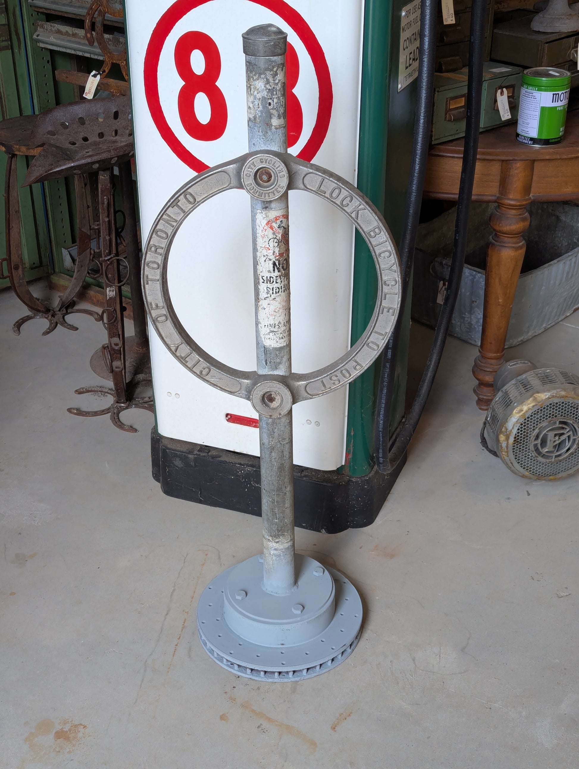 This Cast Aluminum City of Toronto Bike Post is a heavy, sturdy piece crafted to last. Standing 45" tall, its solid base is a genuine car brake disc, ensuring exceptional stability. Featuring embossed lettering in its original condition, this bike post isn’t just functional—it’s a bold urban statement. Perfect for securely hooking up your bike, it combines durability with distinctive city charm to keep your ride safe and stylish.