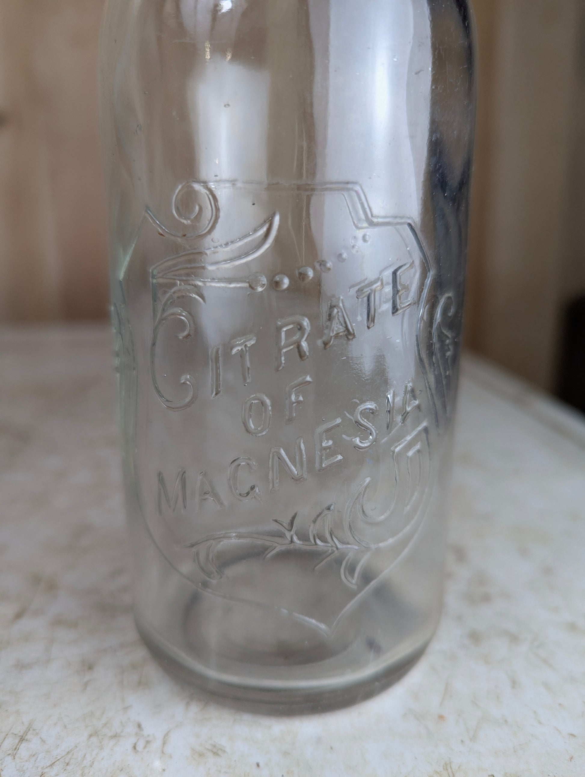 This collectible Citrate of Magnesia glass medicine bottle features charming embossed lettering and design, showcasing its vintage appeal. In good used condition, it includes a classic ceramic and wire bail stopper, making it a unique addition to any antique collection or display. Perfect for enthusiasts of historical pharmacy items or decorative glassware.
