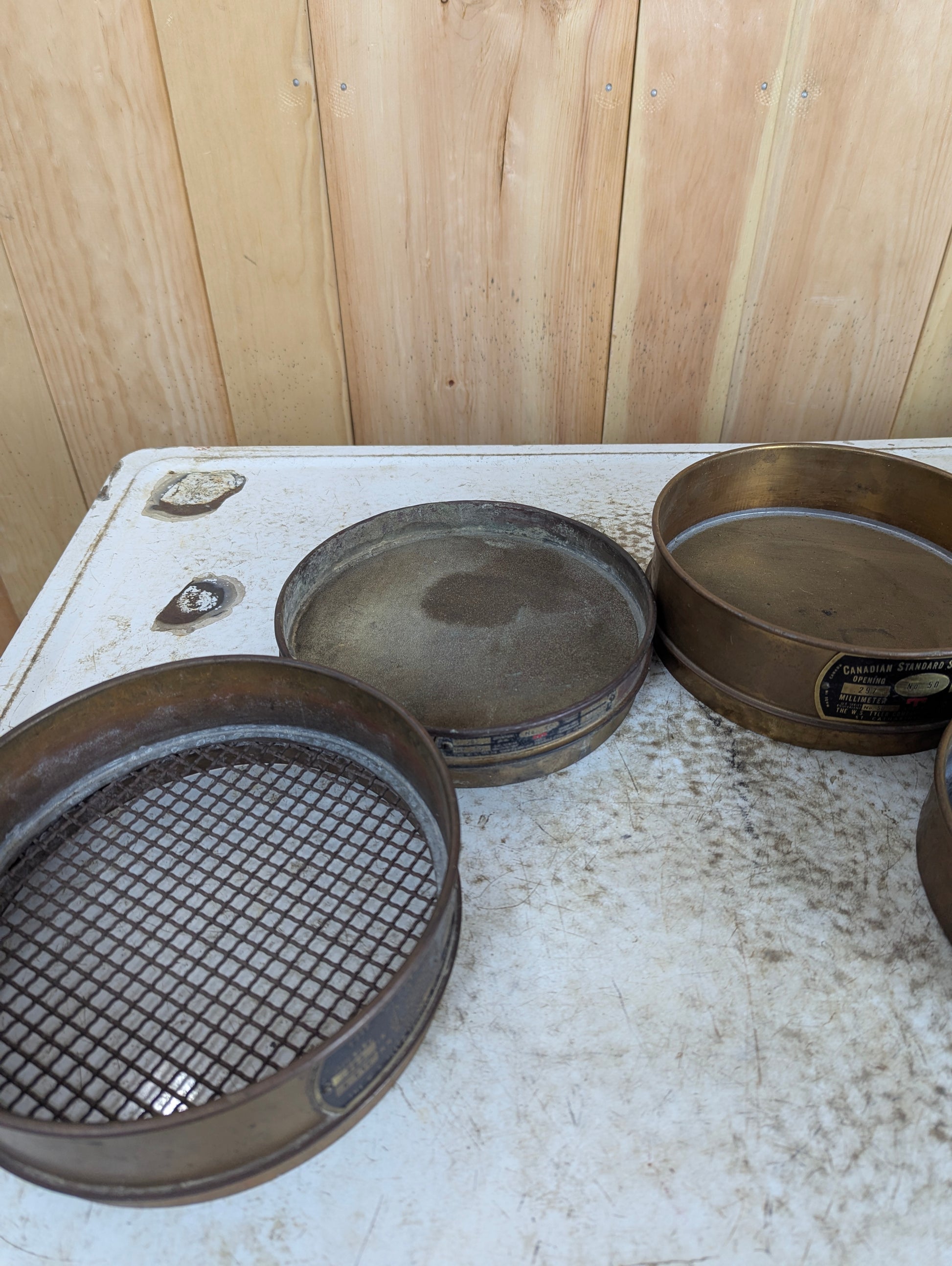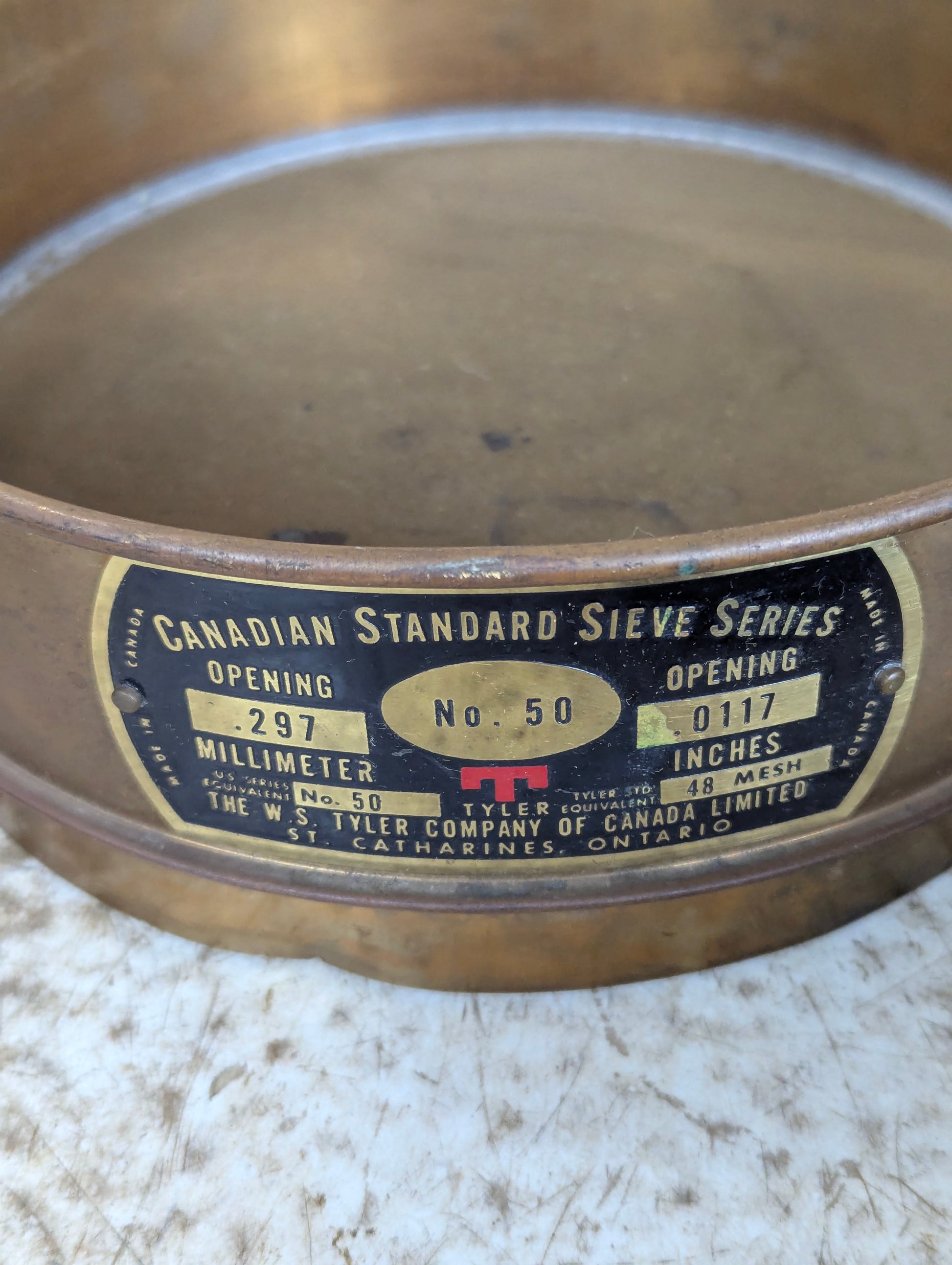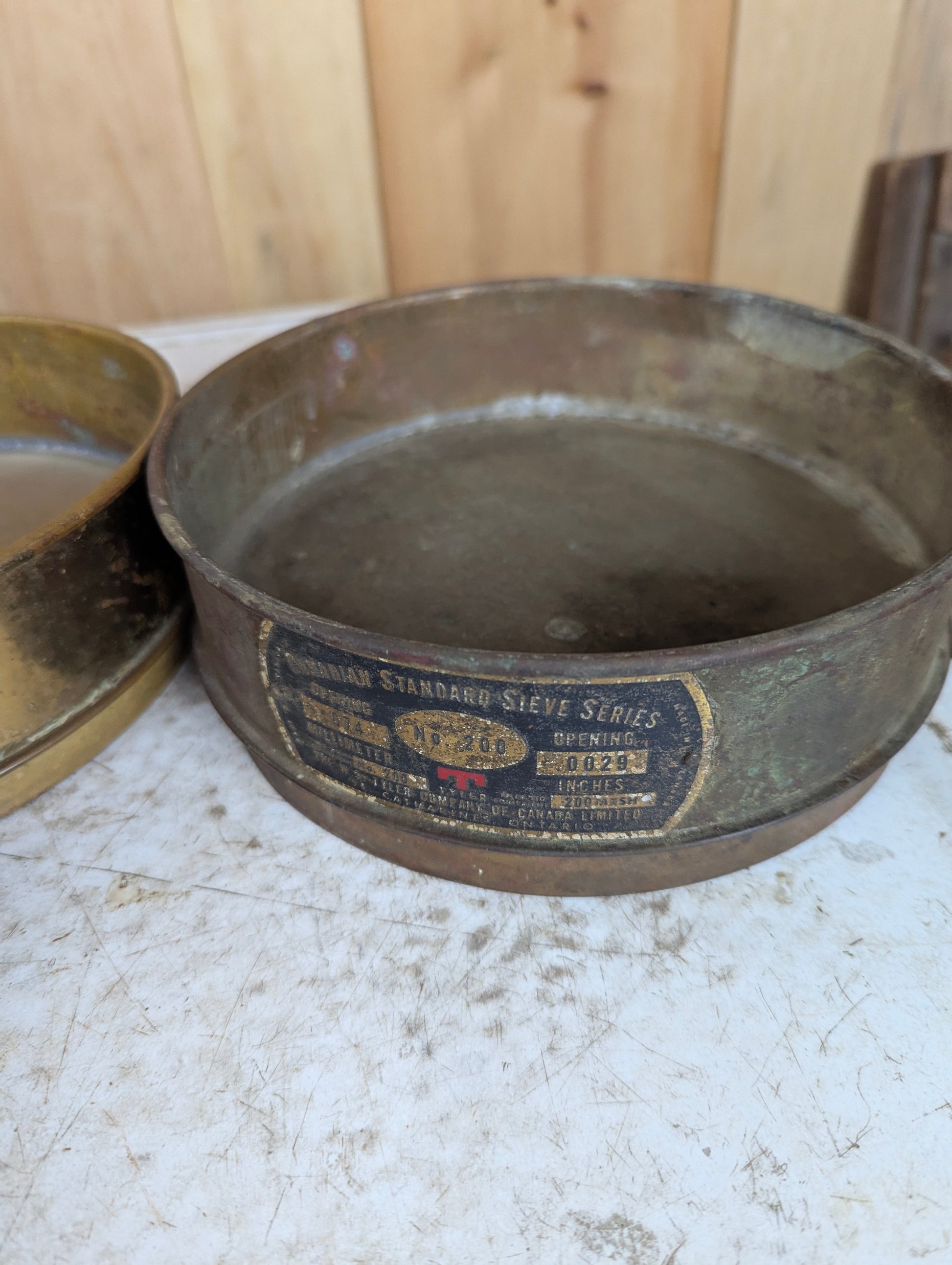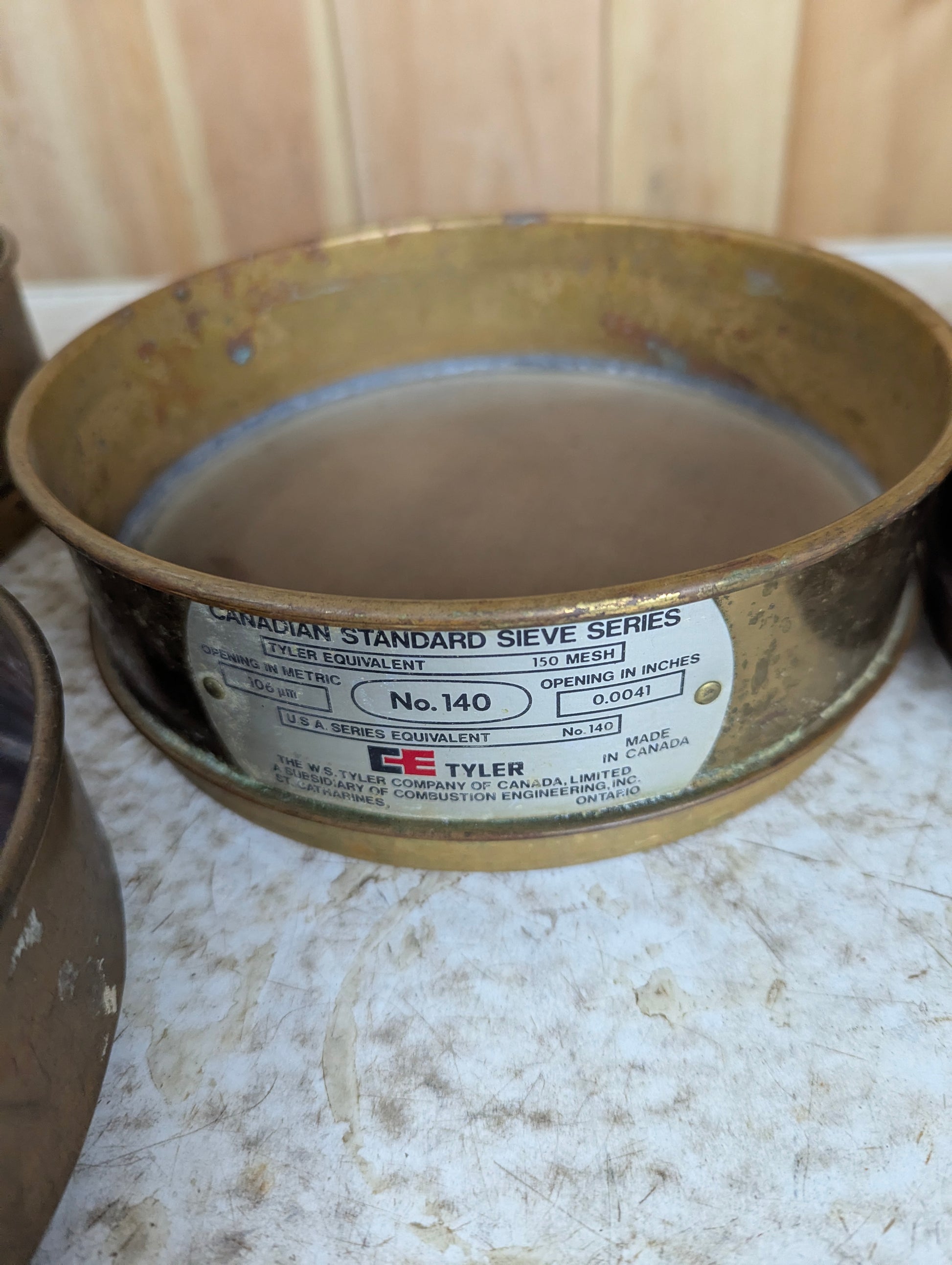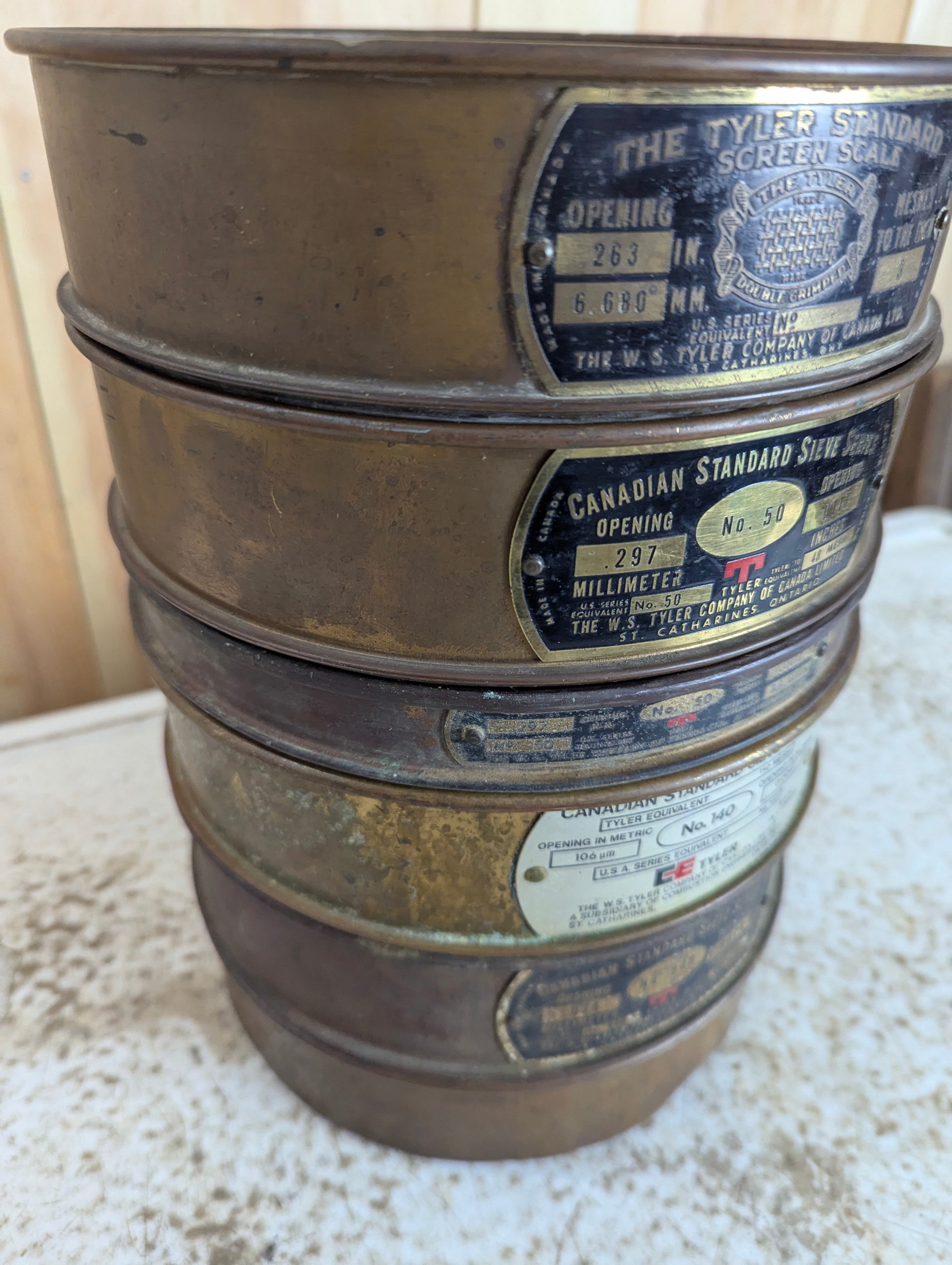 This Copper Sieve Set features five durable sieves and a bottom pan, each measuring 8.25” in diameter. Crafted by W S Tyler Co in St. Catherines, this set ensures precise and reliable sifting for your laboratory or industrial needs. Its quality construction offers consistent performance, making it an essential tool for accurate particle size analysis. Elevate your testing process with this trusted, professional-grade sieve set.
