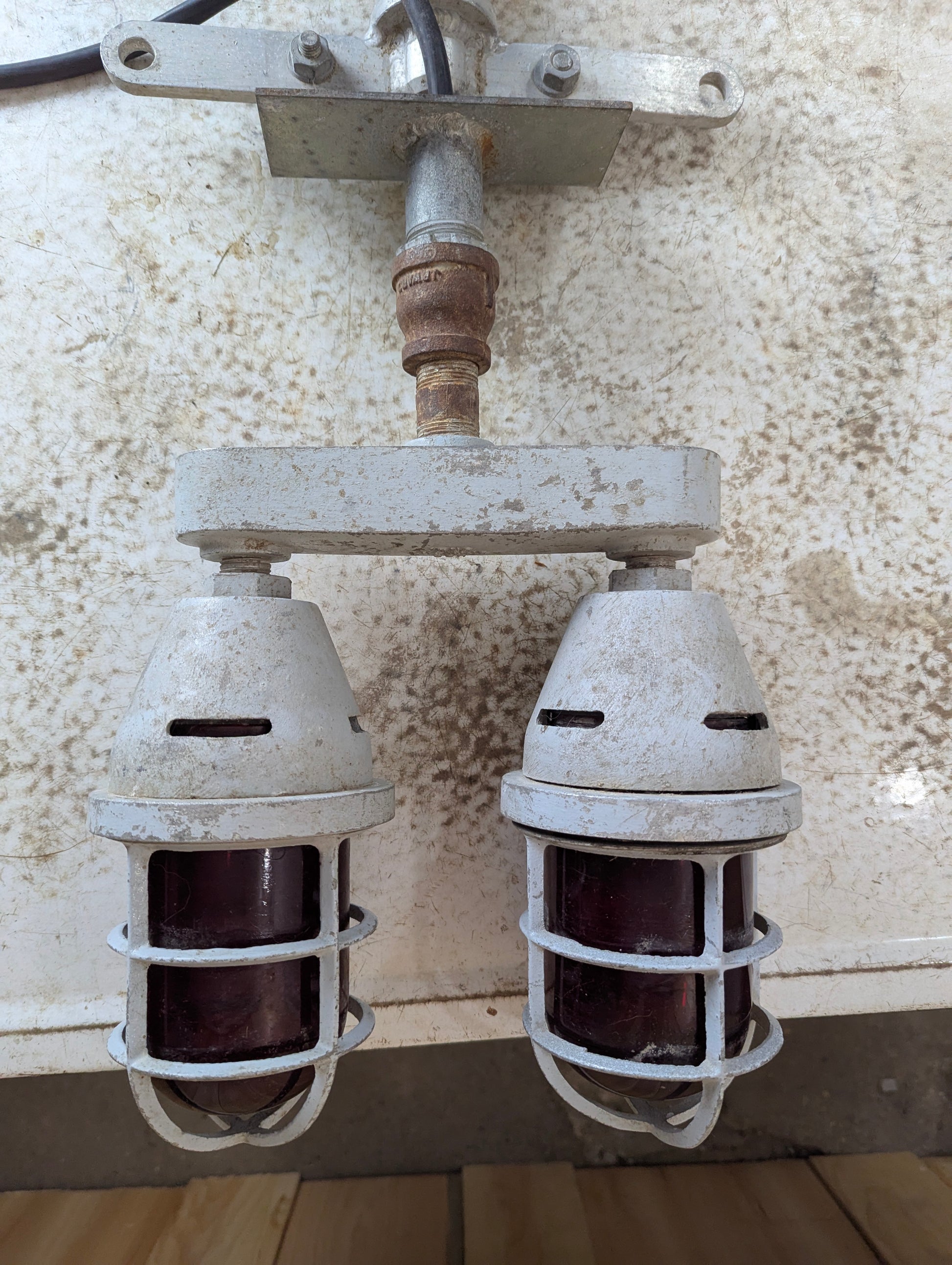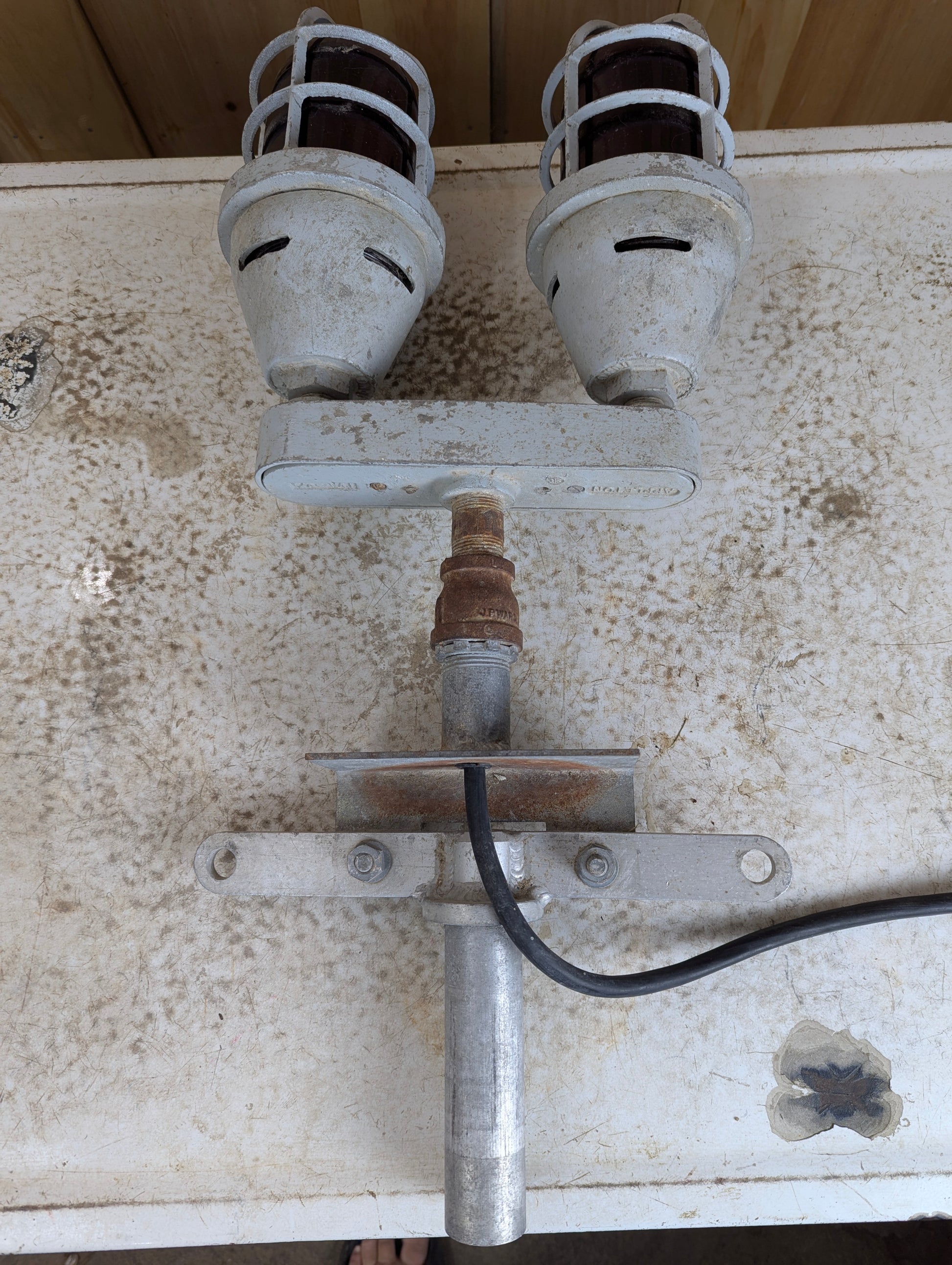 This Double Lamp Industrial Caged Warning Light is in good used condition and fully operational. It features durable aluminum construction with sturdy mounting brackets, allowing easy placement on a stand or wall installation. The regular glass globes and protective cages are intact and well-maintained, ensuring reliable performance and long-lasting safety visibility for your workspace or project.