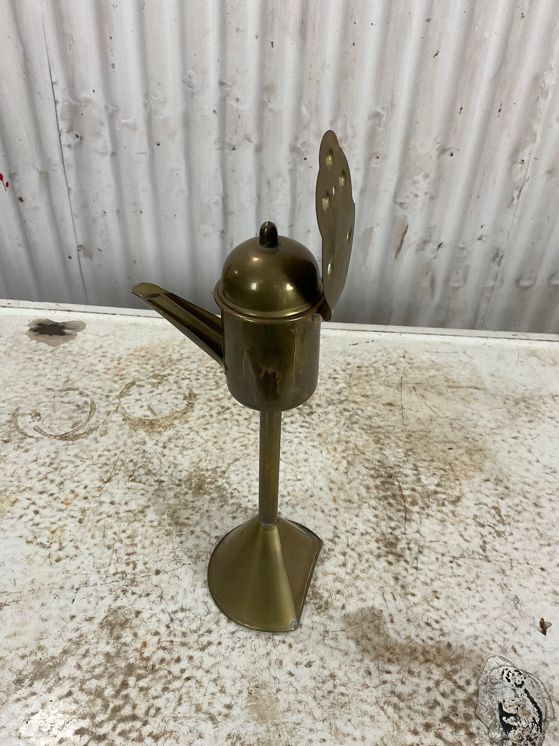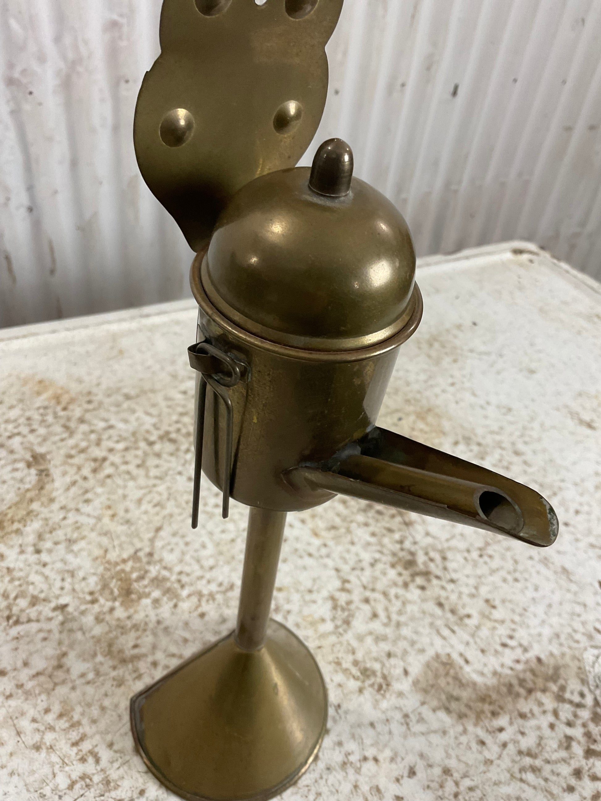 This Early 1800’s Brass Betty Oil Lamp from Holland stands 14” tall and offers a charming glimpse into history. Though the oil receptacle shows some cracks, it remains a valuable collectible piece that adds vintage character to any display. Perfect for enthusiasts of antique lighting and unique décor.