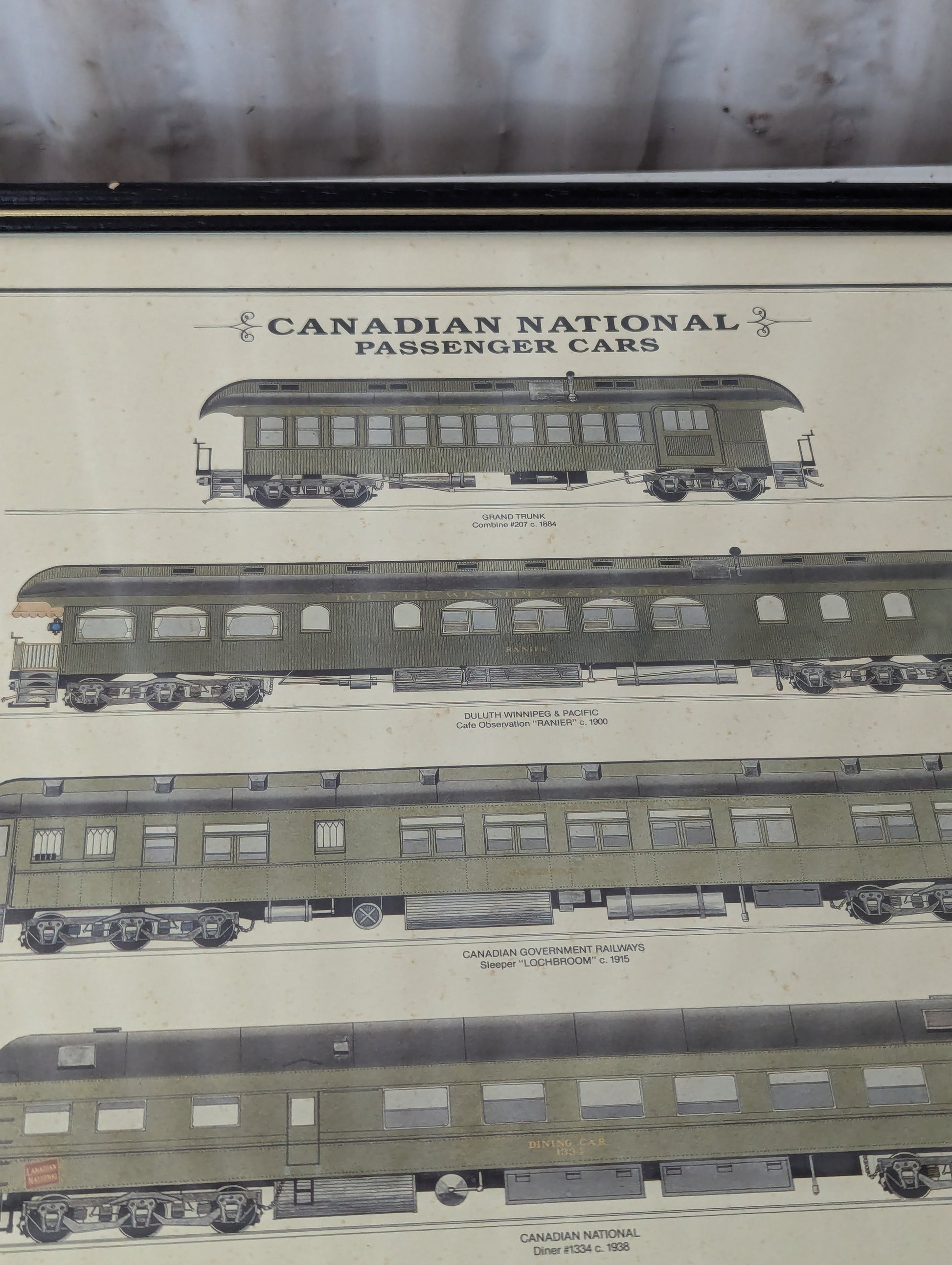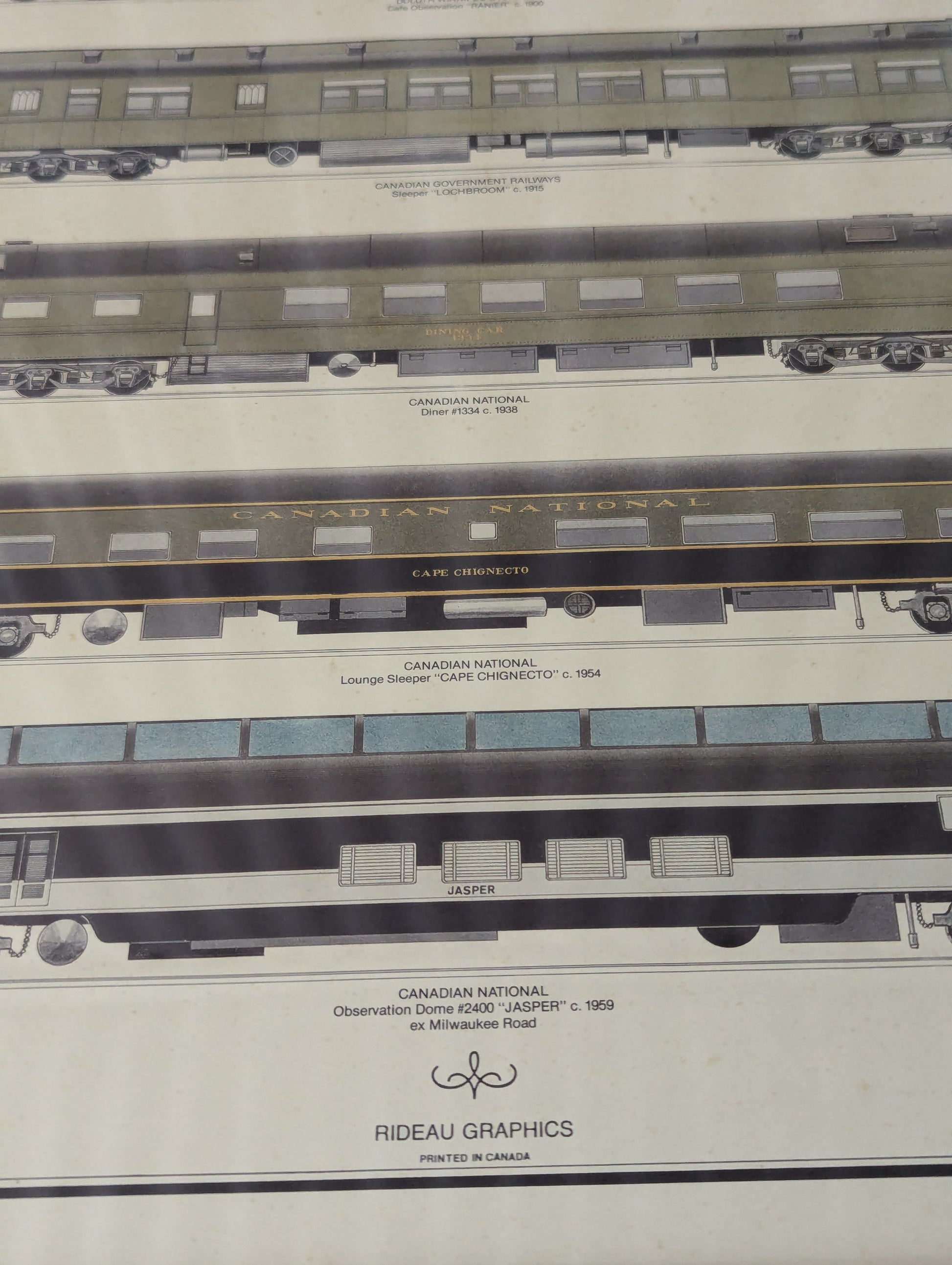 These framed CPR/CNR passenger car prints, crafted by Rideau Graphics, offer a unique collectible for railway enthusiasts and art lovers alike. Measuring 21” x 16”, each print is in good condition and makes a striking addition to any wall. Enhance your space with this distinctive piece of transportation history and enjoy the timeless appeal of classic rail imagery.