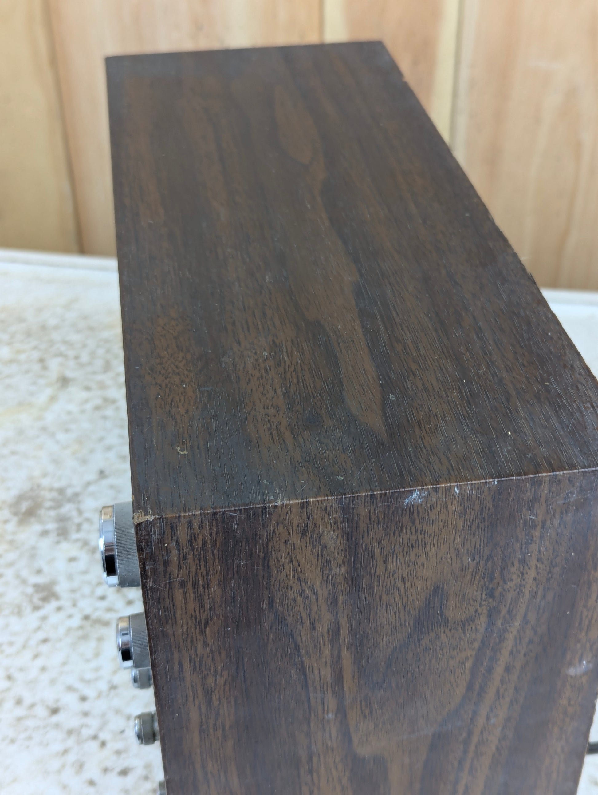 This 1970’s vintage Sony ICF-9550W AM FM transistor radio combines classic style with reliable performance. Housed in a charming wooden case measuring 14.5” x 9” x 6”, it remains in good working order despite some signs of wear. A true collectible, this radio offers nostalgic appeal and a unique addition to any vintage electronics collection.