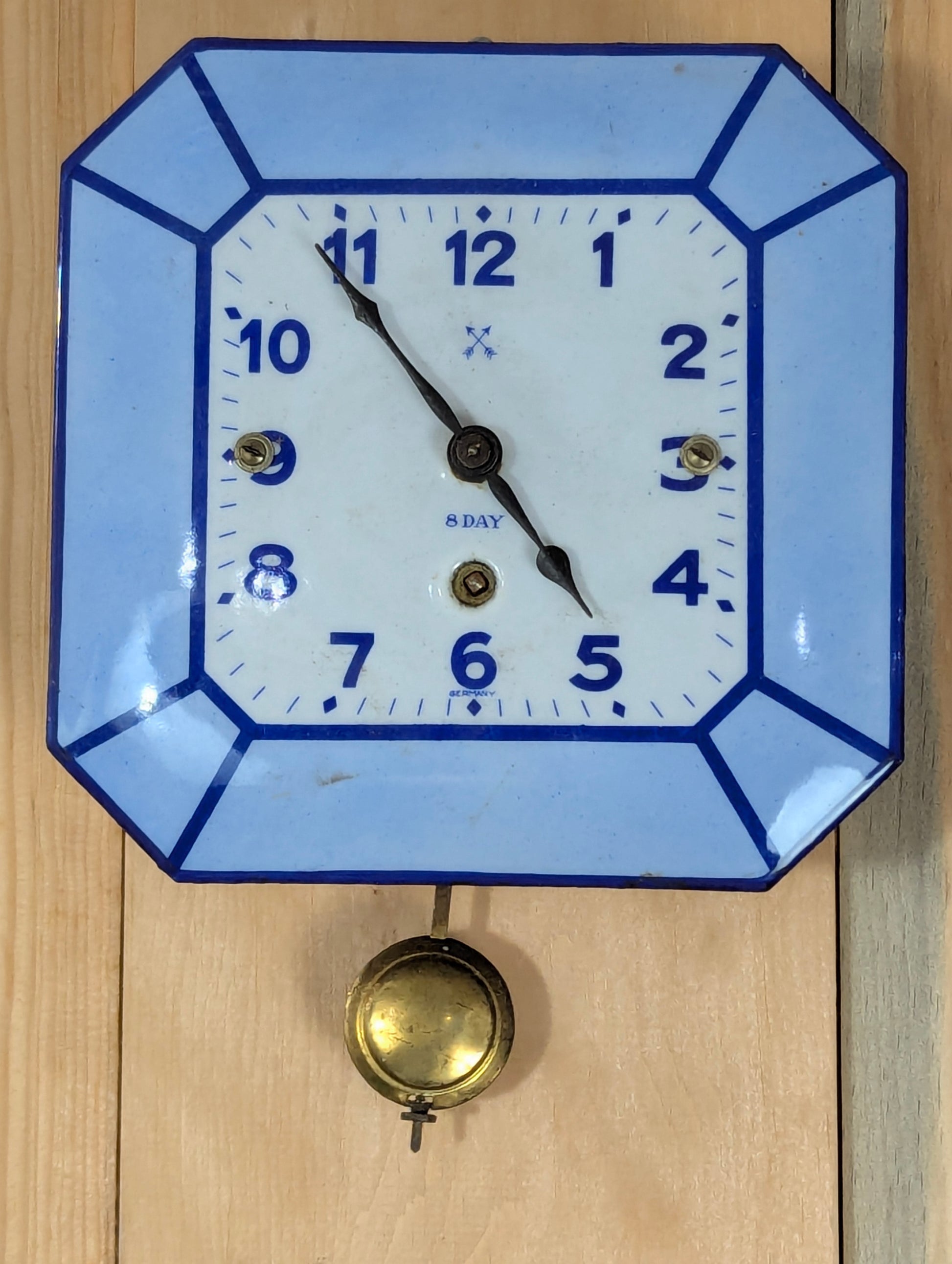 German Made Enamelled White & Blue 8- Day Wall Clock