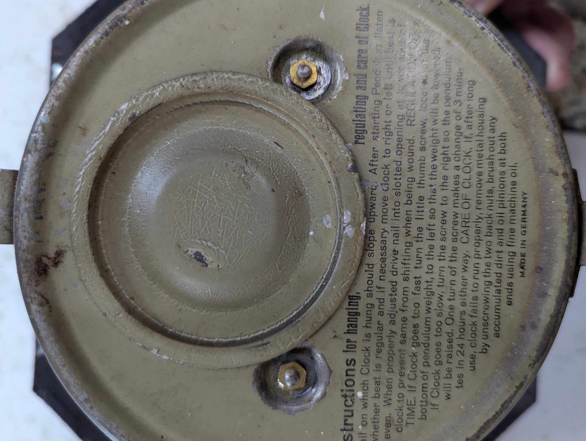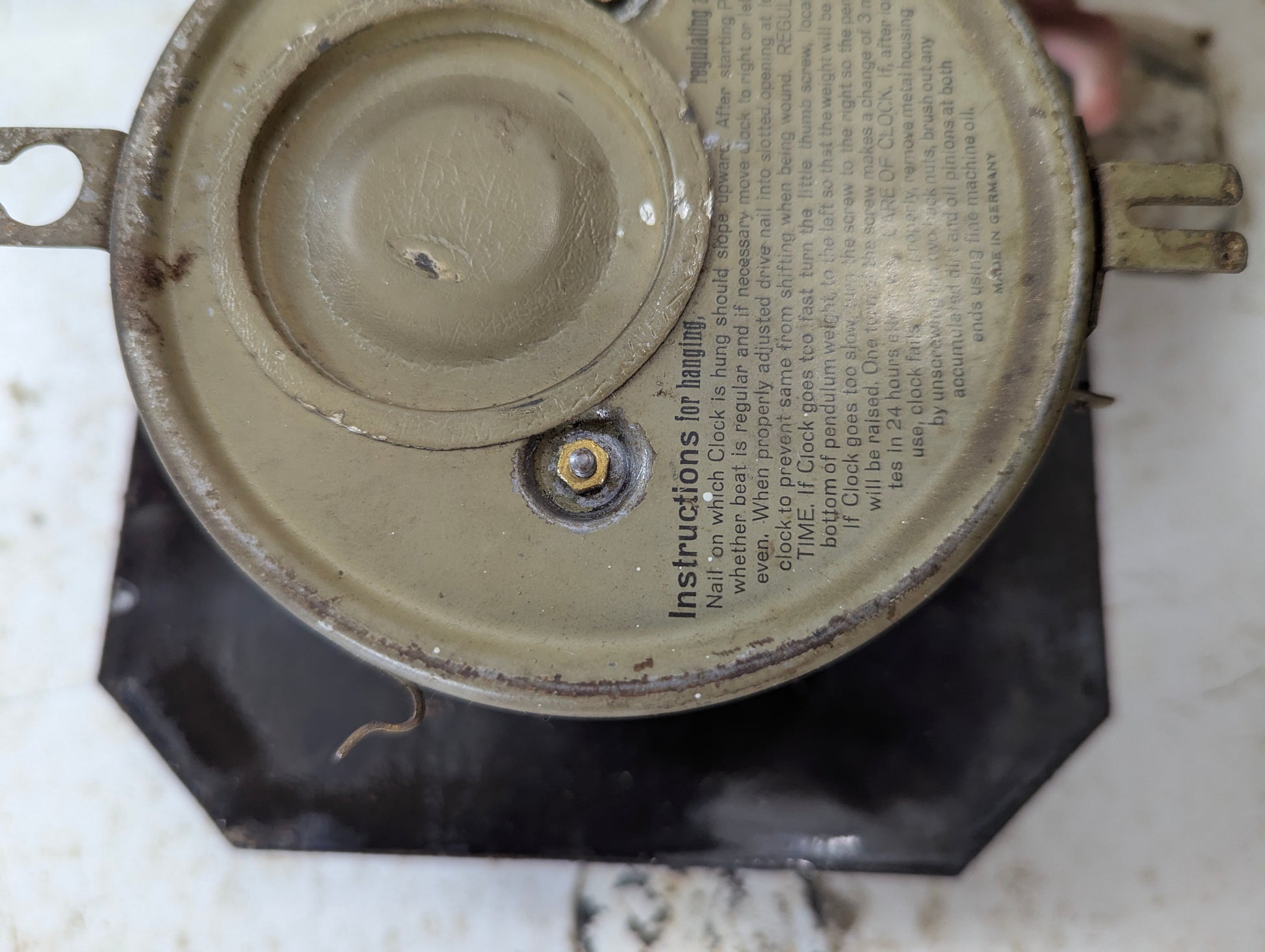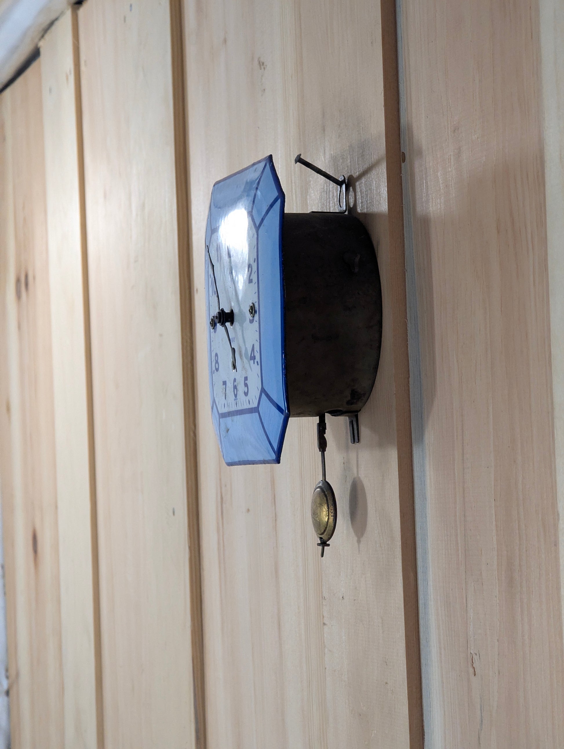 This charming German-made enamelled wall clock combines classic white and blue porcelain craftsmanship with reliable 8-day wind-up functionality. In good used condition and fully operational, it offers timeless elegance without a chime, making it perfect for subtle timekeeping in any room. Measures 6” across with a 4” clock face and sits 2.5” out from the wall. Comes with a key and there’s a hook on the side to hang it. Has instructions on the back and has its original pendulum, this clock is a beautiful and practical addition to your home décor.