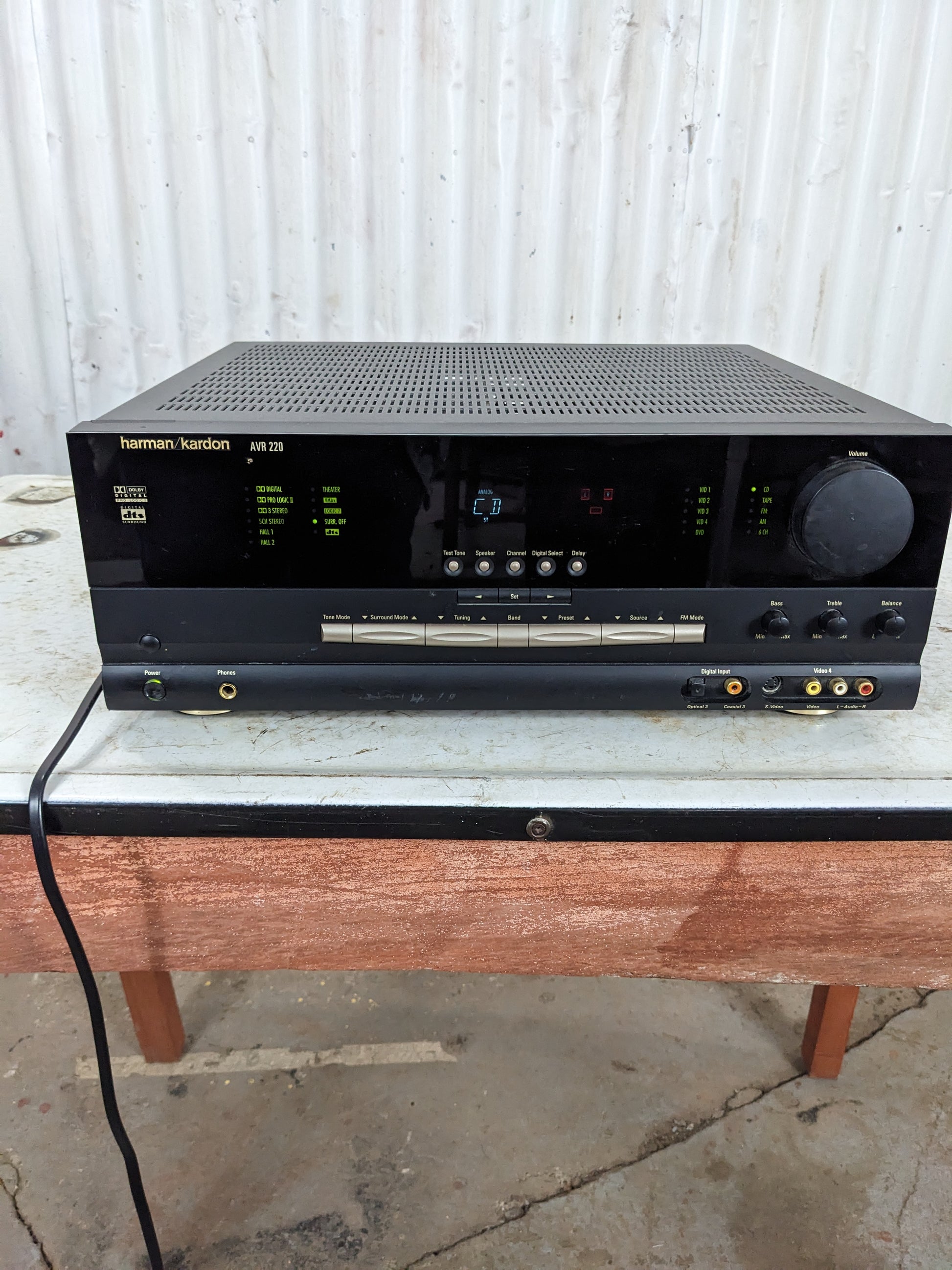The Harmon Kardon Receiver AVR220 is a reliable audio-video receiver in good condition and fully operational. It features three video outputs, allowing flexible connection options for your entertainment setup. Equipped with one DVD and one CD input, it supports a variety of media formats to enhance your listening and viewing experience. This receiver is a practical choice for those seeking dependable performance and versatile connectivity.