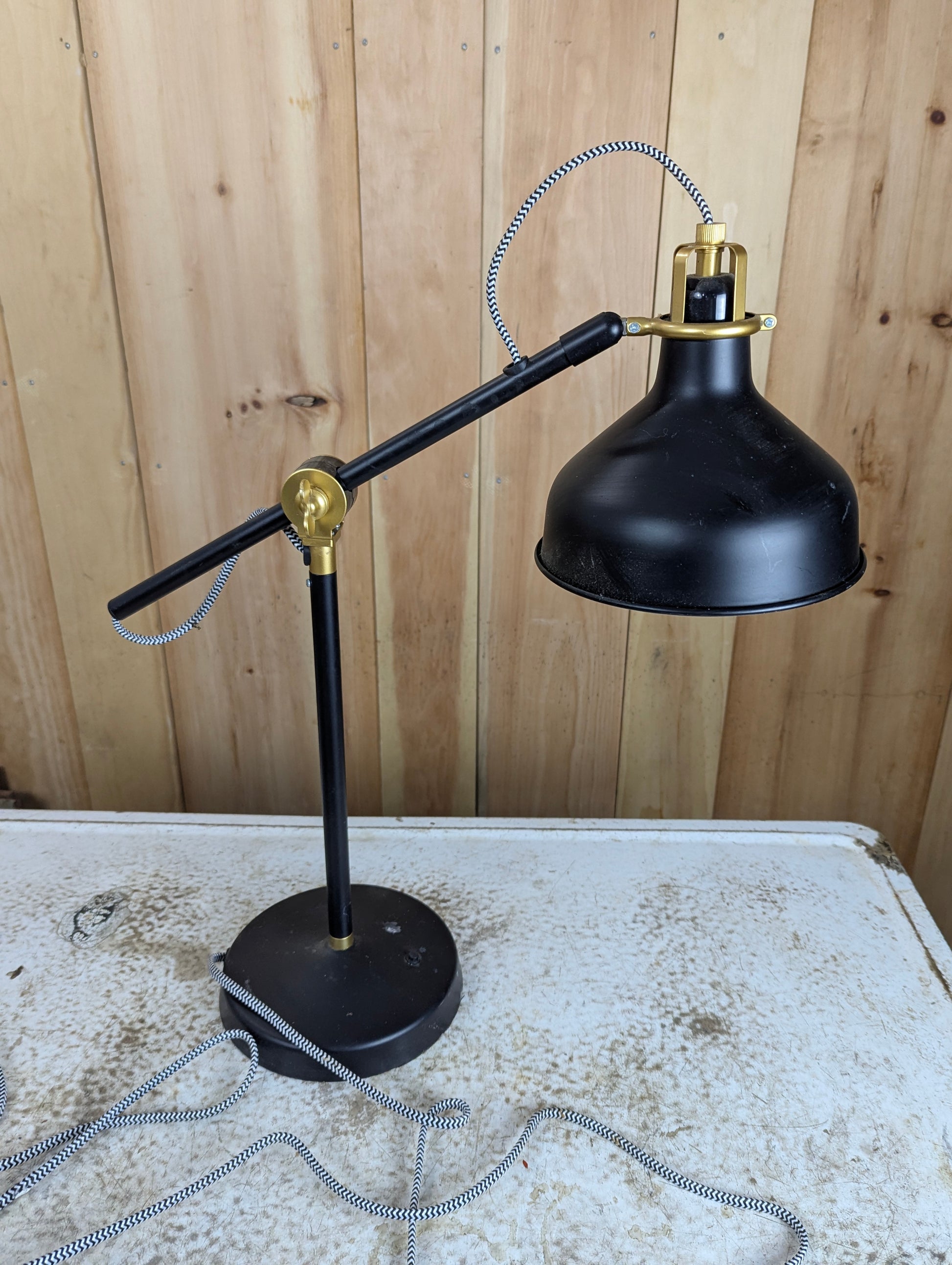 The IKEA Ranarp Black Work Lamp combines classic design with practical functionality. Adjustable to direct light exactly where you need it, this lamp is ideal for crafting or office tasks. Although the power cord shows some damage, the lamp itself operates perfectly, offering reliable lighting to boost your productivity. A stylish and functional addition to any workspace.