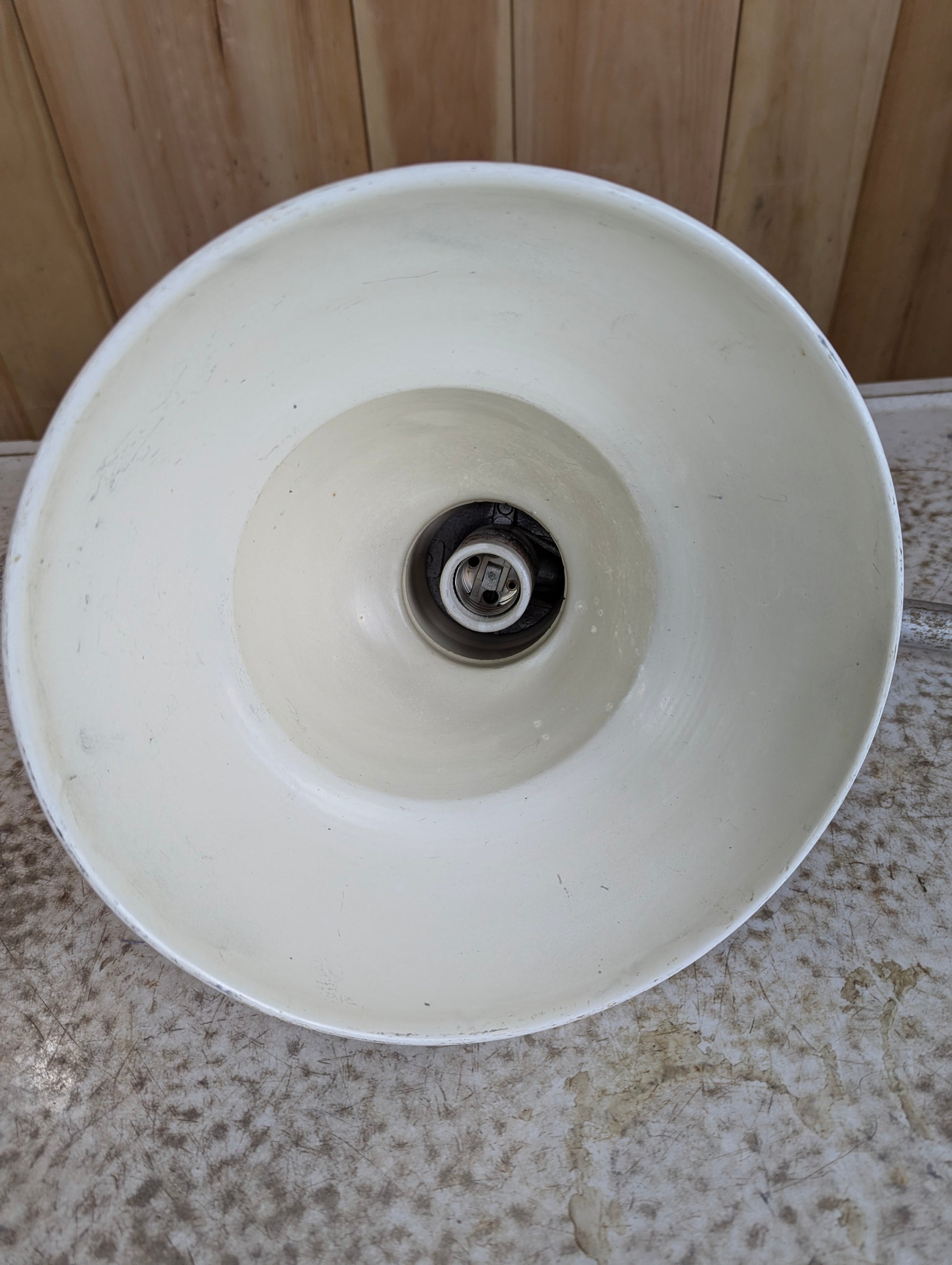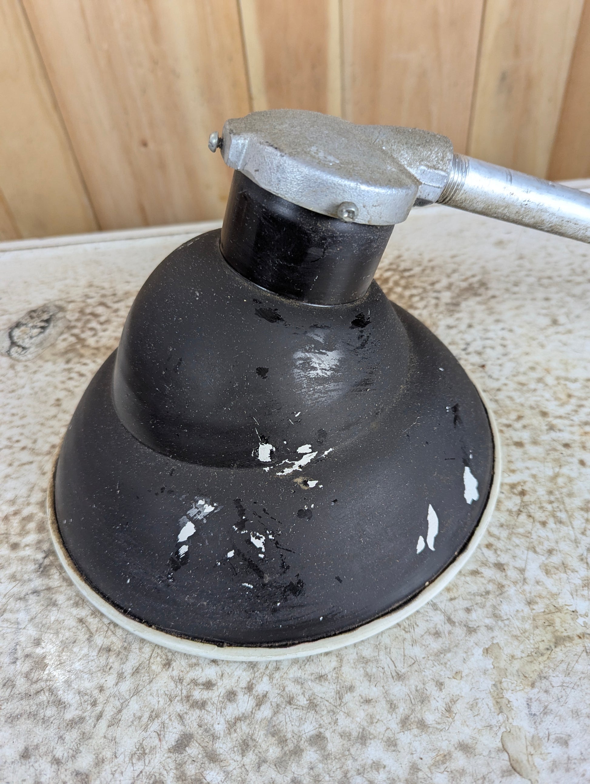 Add a bold, industrial touch to your workshop or garage with this wall-mounted black and white enamel light. In good used condition and the wiring looks good. Featuring a 12” diameter angled shade and a sturdy 12” metal aluminum arm bracket, it offers focused illumination where you need it most. The included mounting bracket ensures easy installation and secure placement. Its durable design blends functionality with style, making it the perfect lighting solution for workspaces that demand reliability and character.