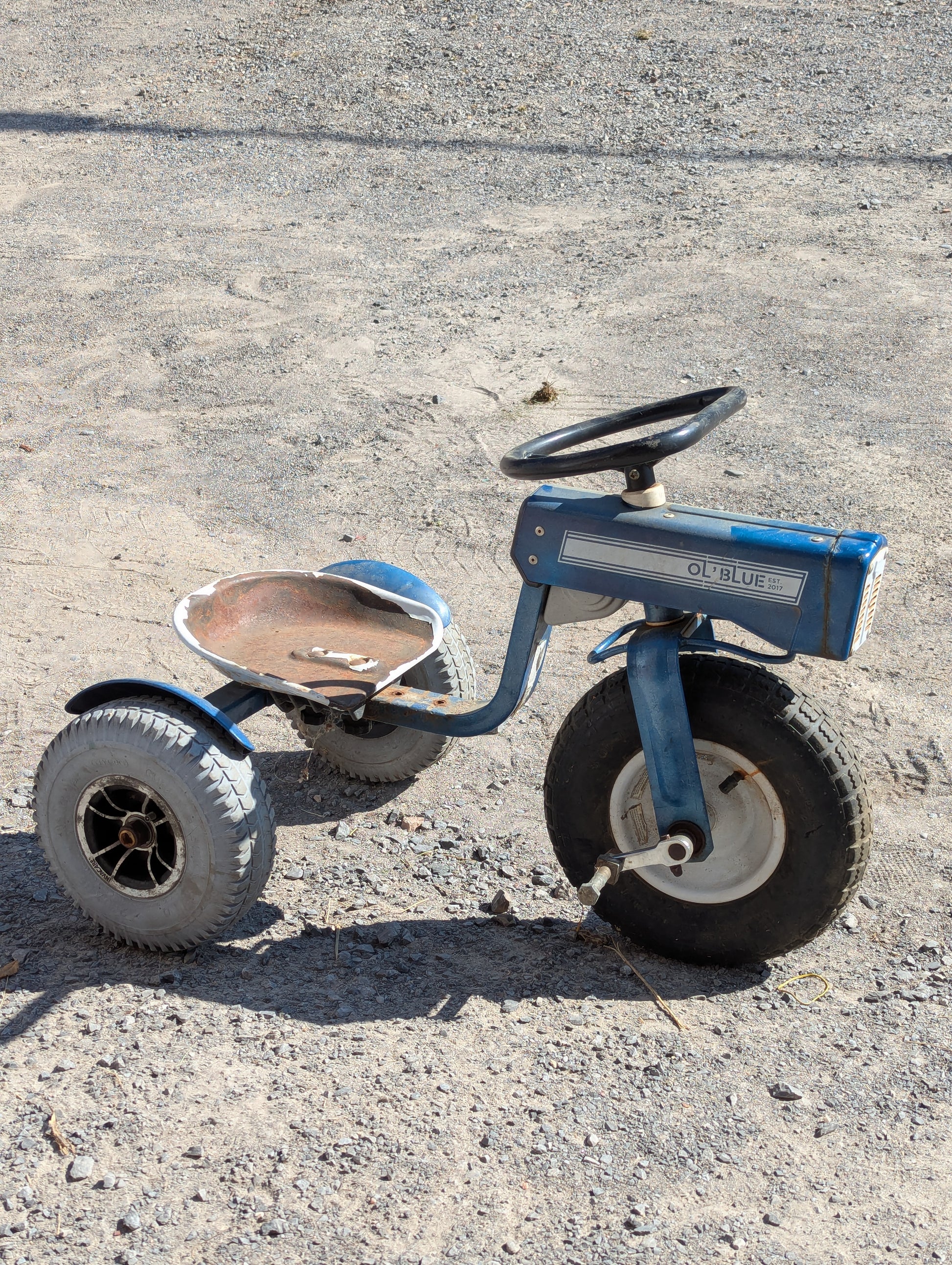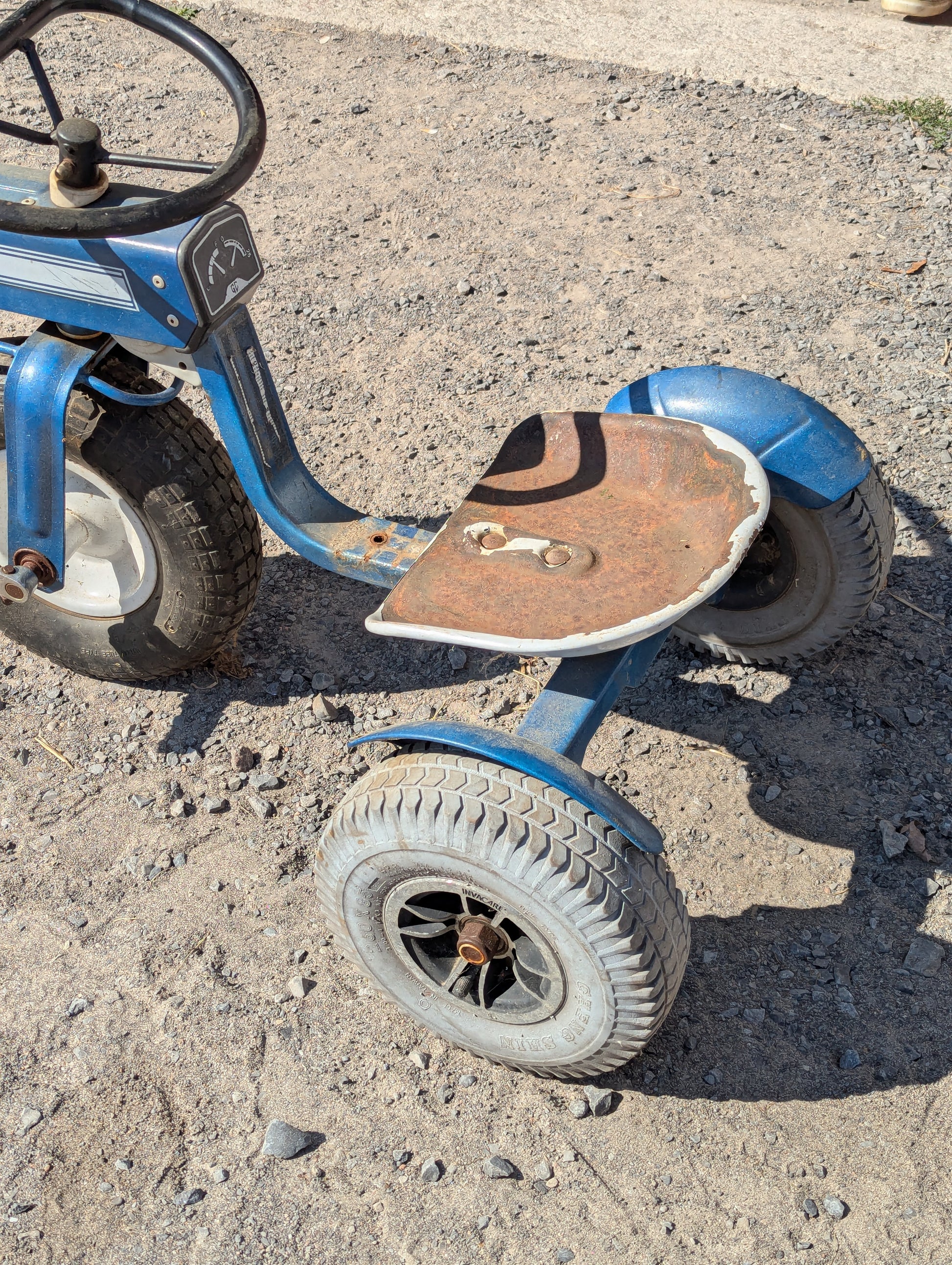 This Kid's Ol' Blue Pedal Tractor offers the promise of a smooth ride with its sturdy wheels. While the seat shows some rust on top, it adds character without affecting functionality. Please note, one pedal is missing its plastic cover, but overall, this pedal tractor is a delightful ride-on toy that encourages outdoor play and imaginative adventures. Perfect for little tractor fans ready to pedal into fun!