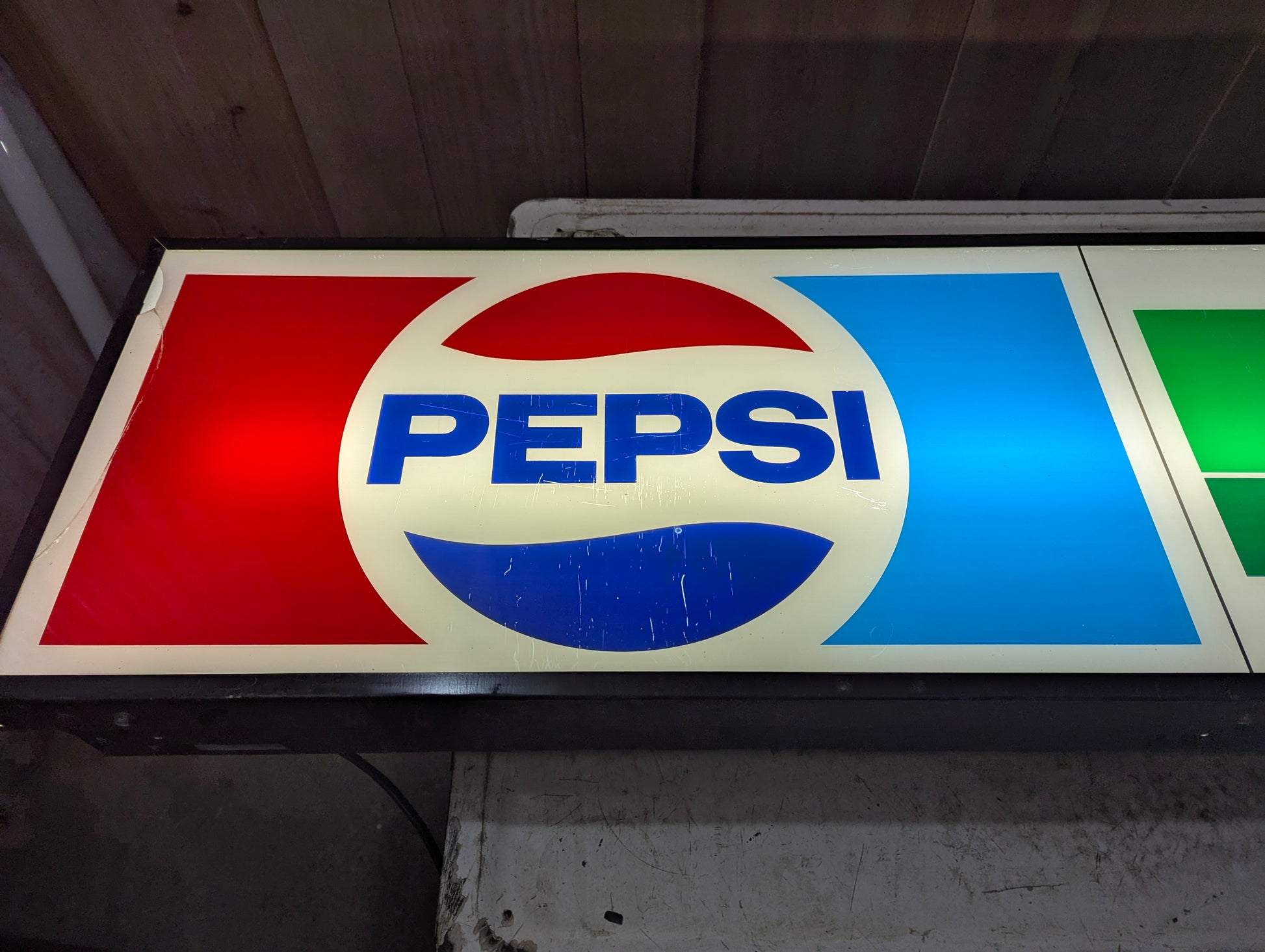 Transform any space into a retro paradise with our Large Retro Pepsi 7UP Light Up Sign Box! At 53" x 14", it's the perfect size to make a statement. Plug it in and watch it light up with its new ballast and LED tube. Some repairs were made to the left side (see photos), but it's still a vibrant and eye-catching addition to any room.