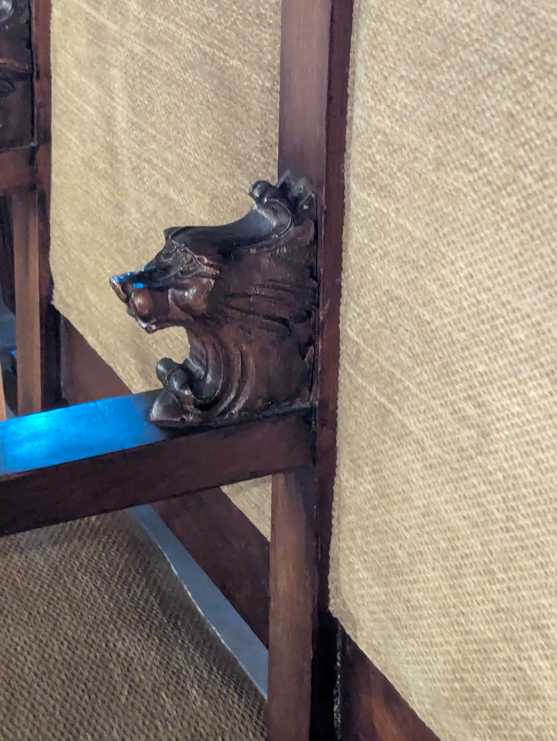 This Antique 3-Seat Lodge Throne features a sturdy, heavy wooden frame with three attached chairs, perfect for comfortable seating. Upholstered seats and back inserts offer a classic touch and supportive springs for lasting comfort. The side chairs have back heights of 45" while the middle chair stands taller at 51". Each seat measures 17.5" high, and the full set spans 71.5" wide by 22" deep, making it a stylish and practical addition to any space.