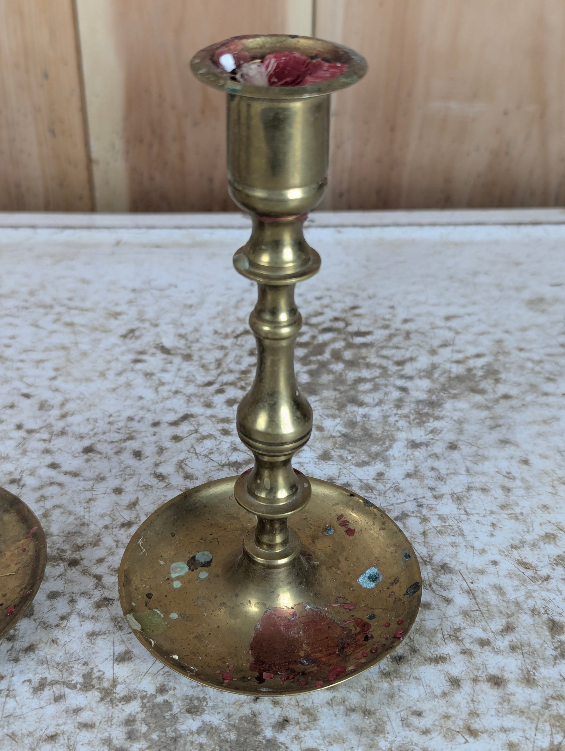 Vintage brass candlesticks standing 7 inches tall, perfect for adding warmth and character to any room. These charming pieces showcase the rich patina and authentic wear that comes with age, giving them genuine vintage appeal. Ideal for displaying on shelves, mantels, or tables as standalone décor or paired with candles for ambient lighting. Both need cleaning so sold "as found". A timeless addition to eclectic, traditional, or transitional home styling.