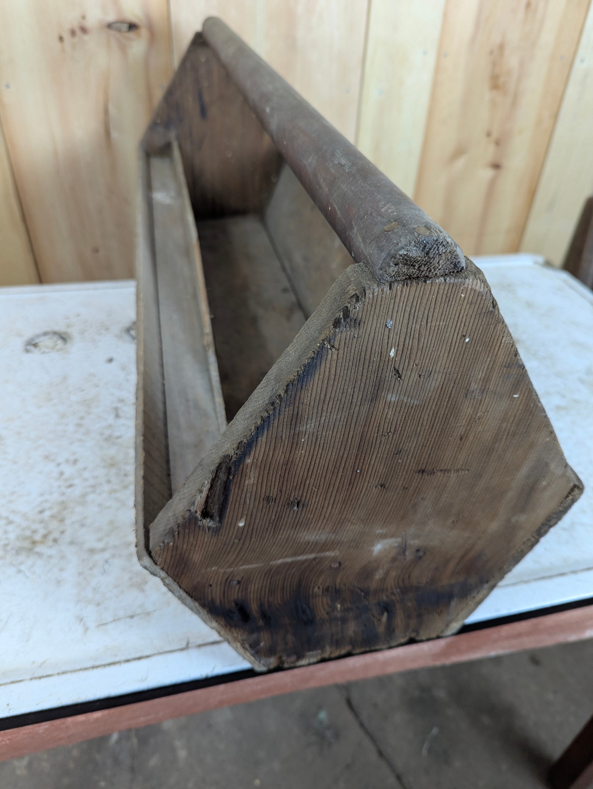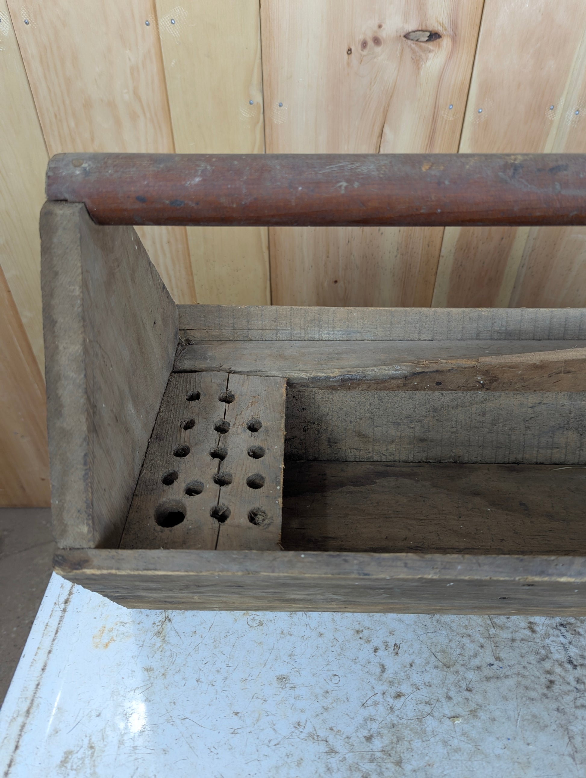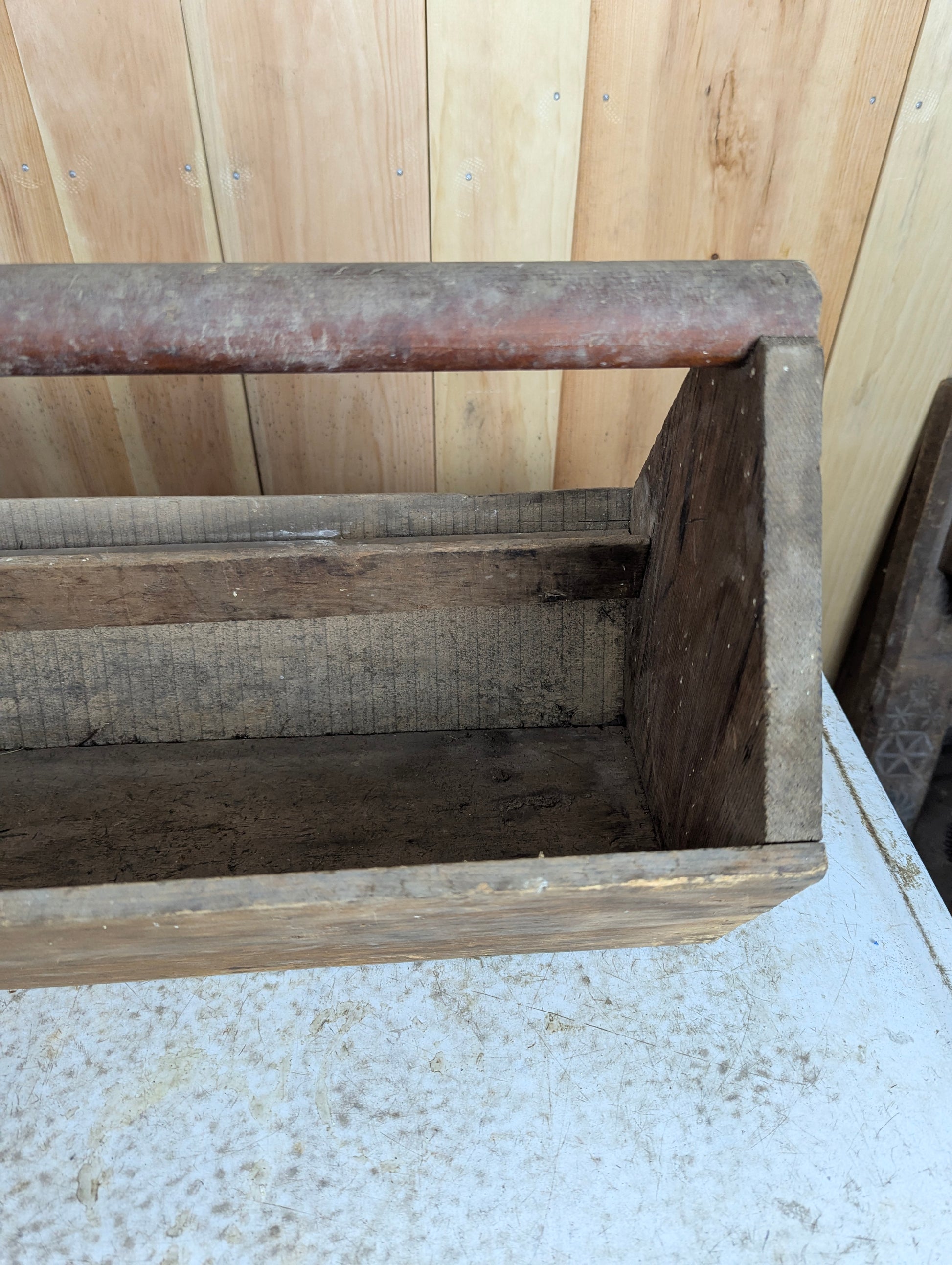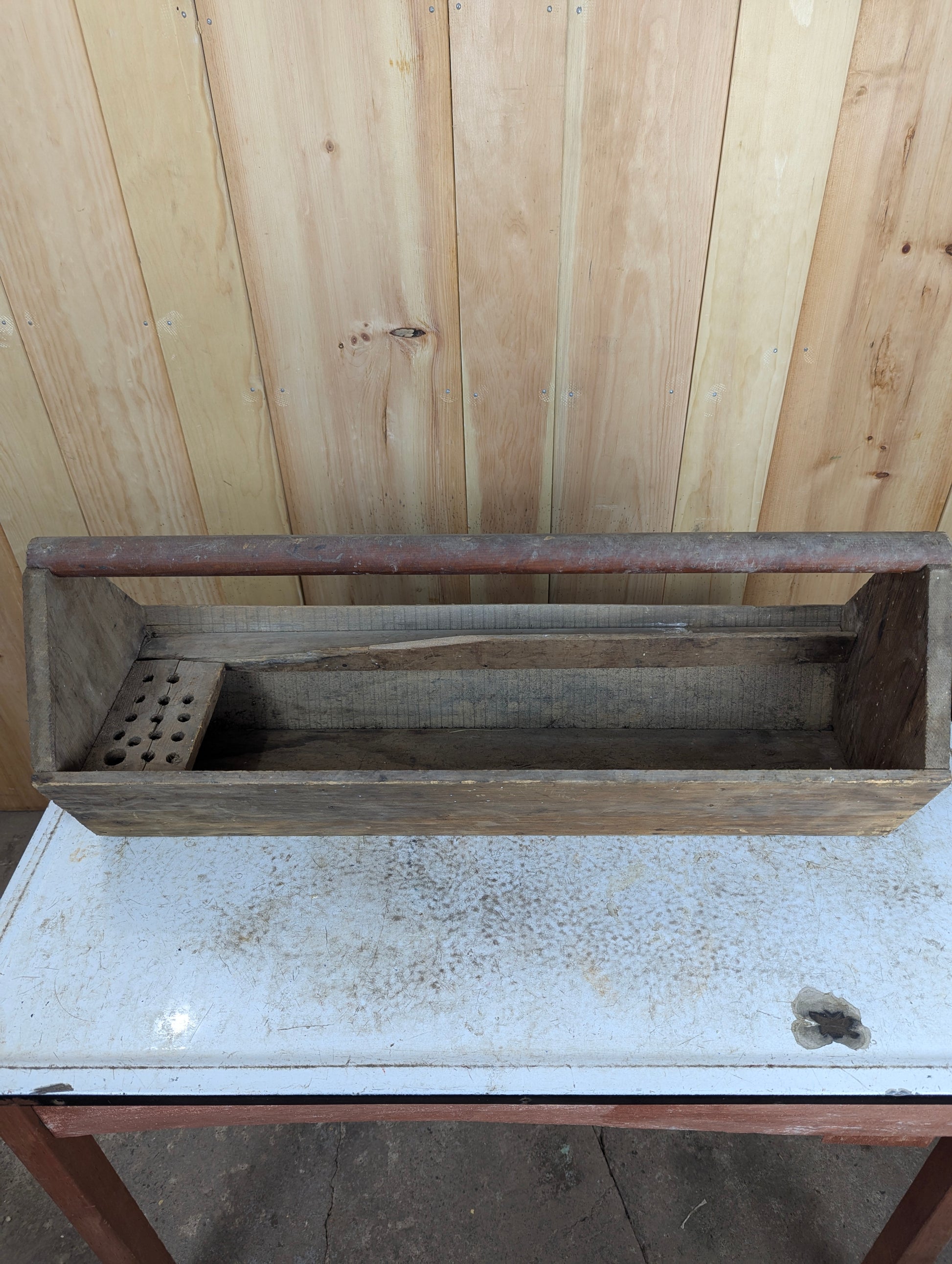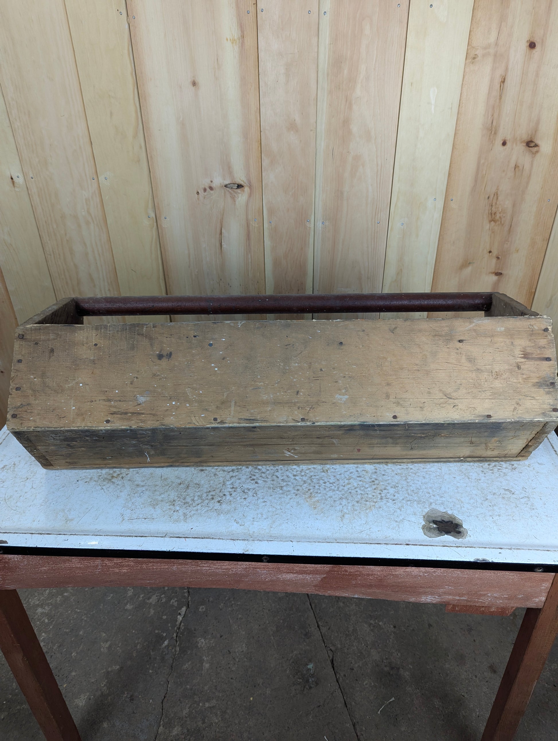 This Primitive Rustic Handcrafted Wooden Tool Box offers ample storage with a dedicated area for screwdrivers or drill bits. Measuring 33” x 11” and 13” high, it features a sturdy wooden carrying handle for easy transport. Combining practicality with rustic charm, it’s perfect for organizing your tools while adding a touch of handcrafted elegance to your workspace.