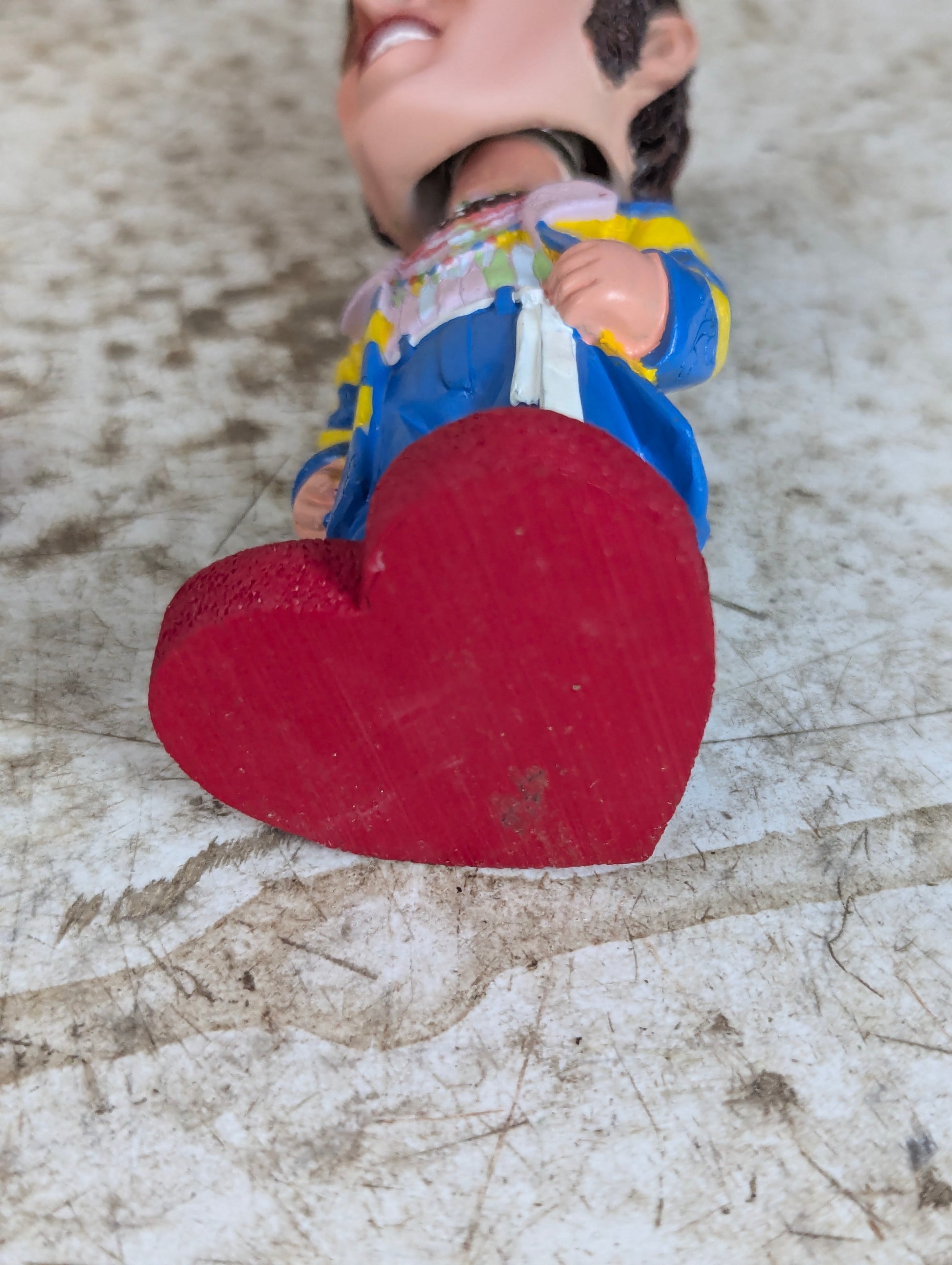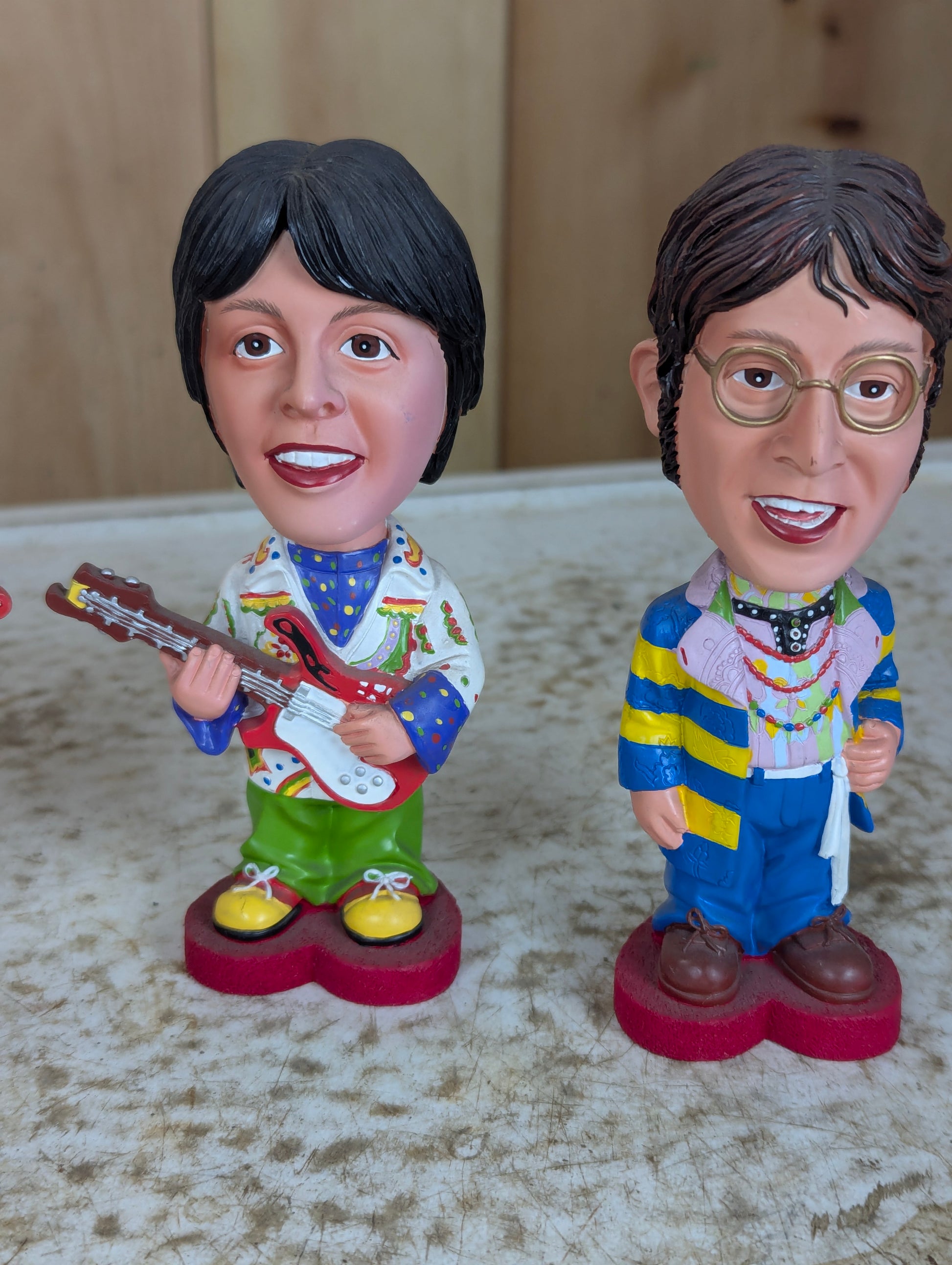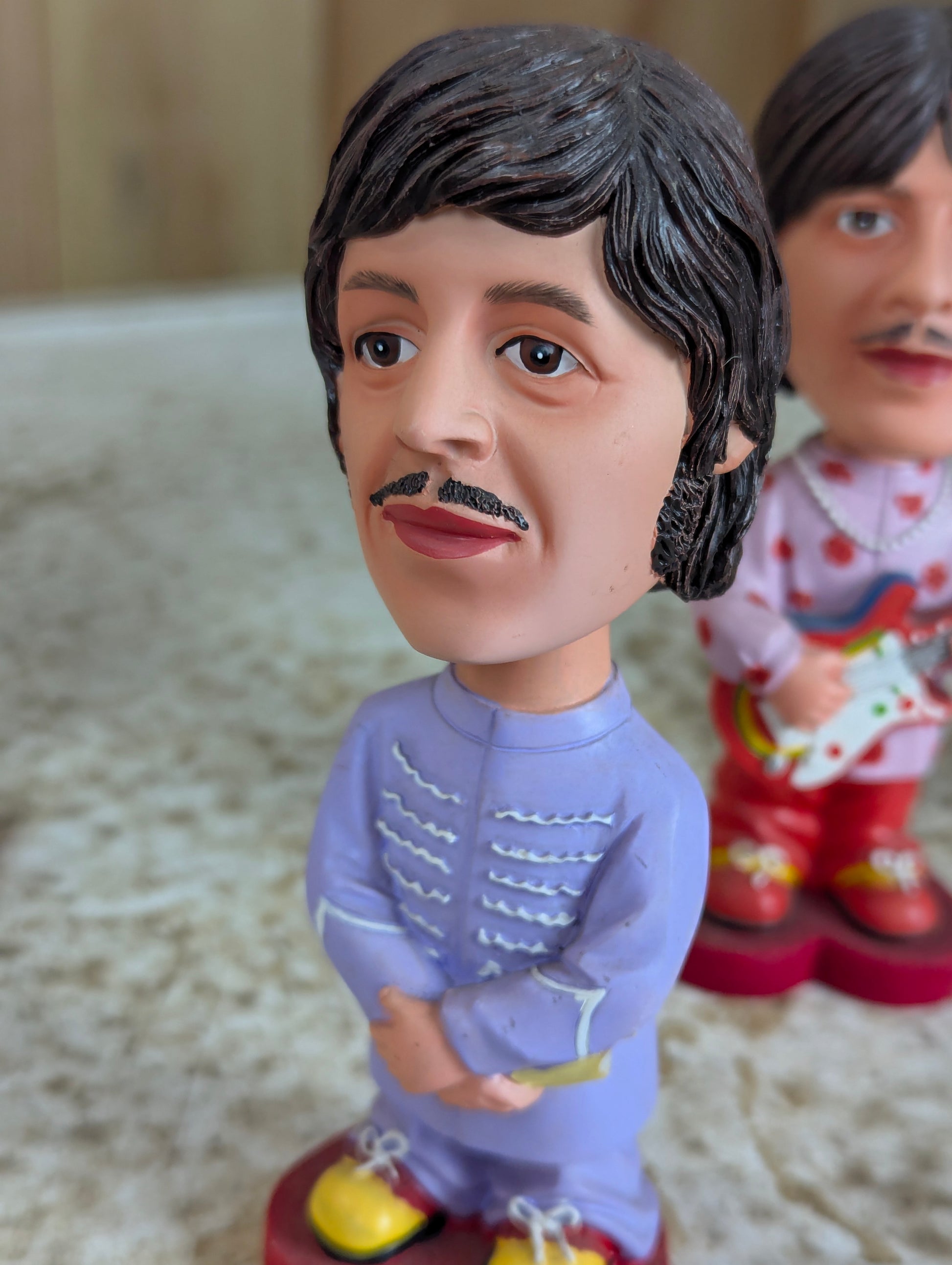 This rare set of collectible Beatles bobbleheads stands 6” tall and features the band in vibrant, psychedelic costumes, capturing their iconic style in fine detail. Each figure comes with a charming heart-shaped base, adding a unique touch to your display. Please note, Ringo’s drumsticks show some damage as pictured, but the overall condition remains excellent. A must-have for devoted Beatles fans and collectors looking to own a distinctive piece of music memorabilia.