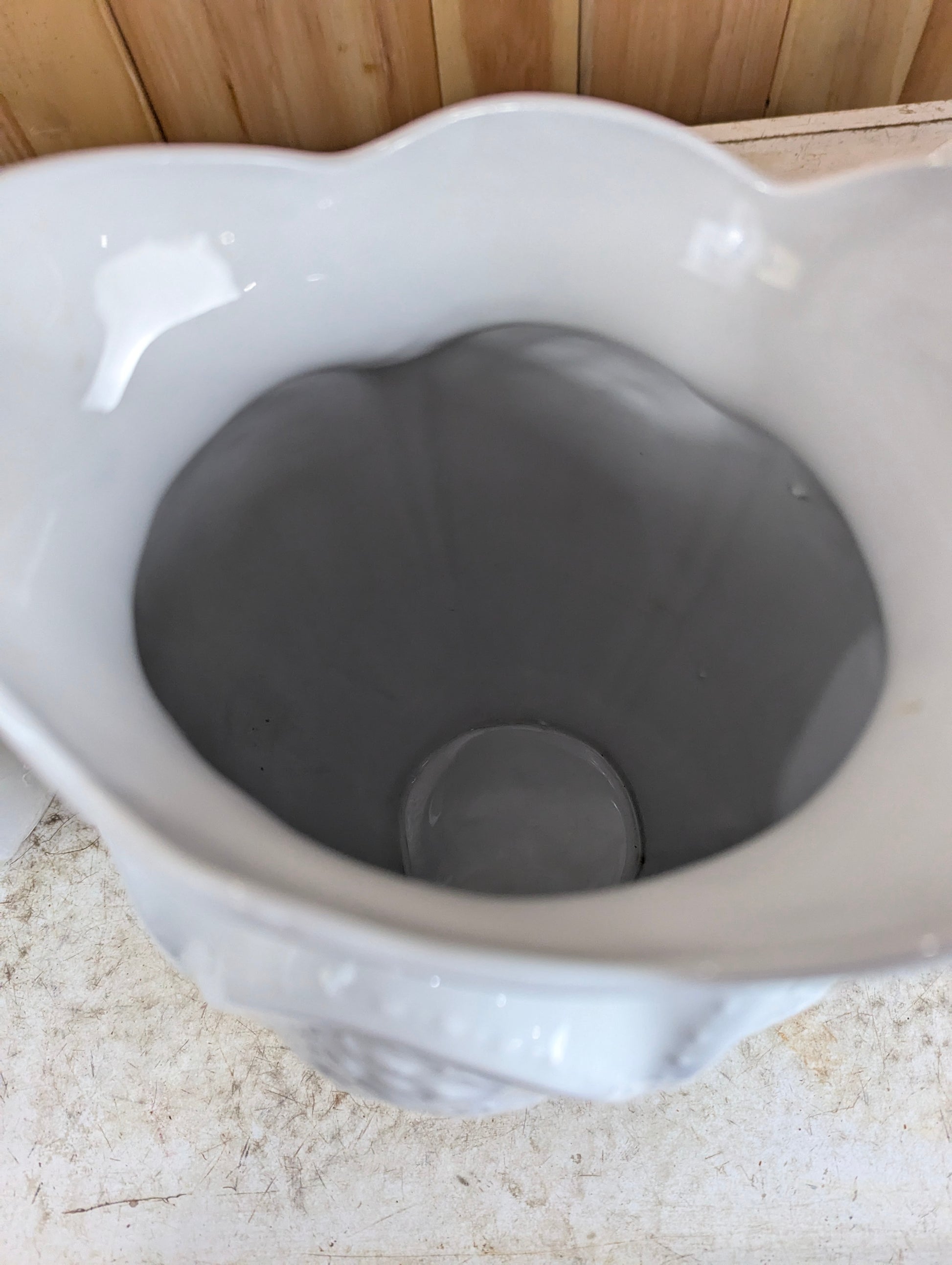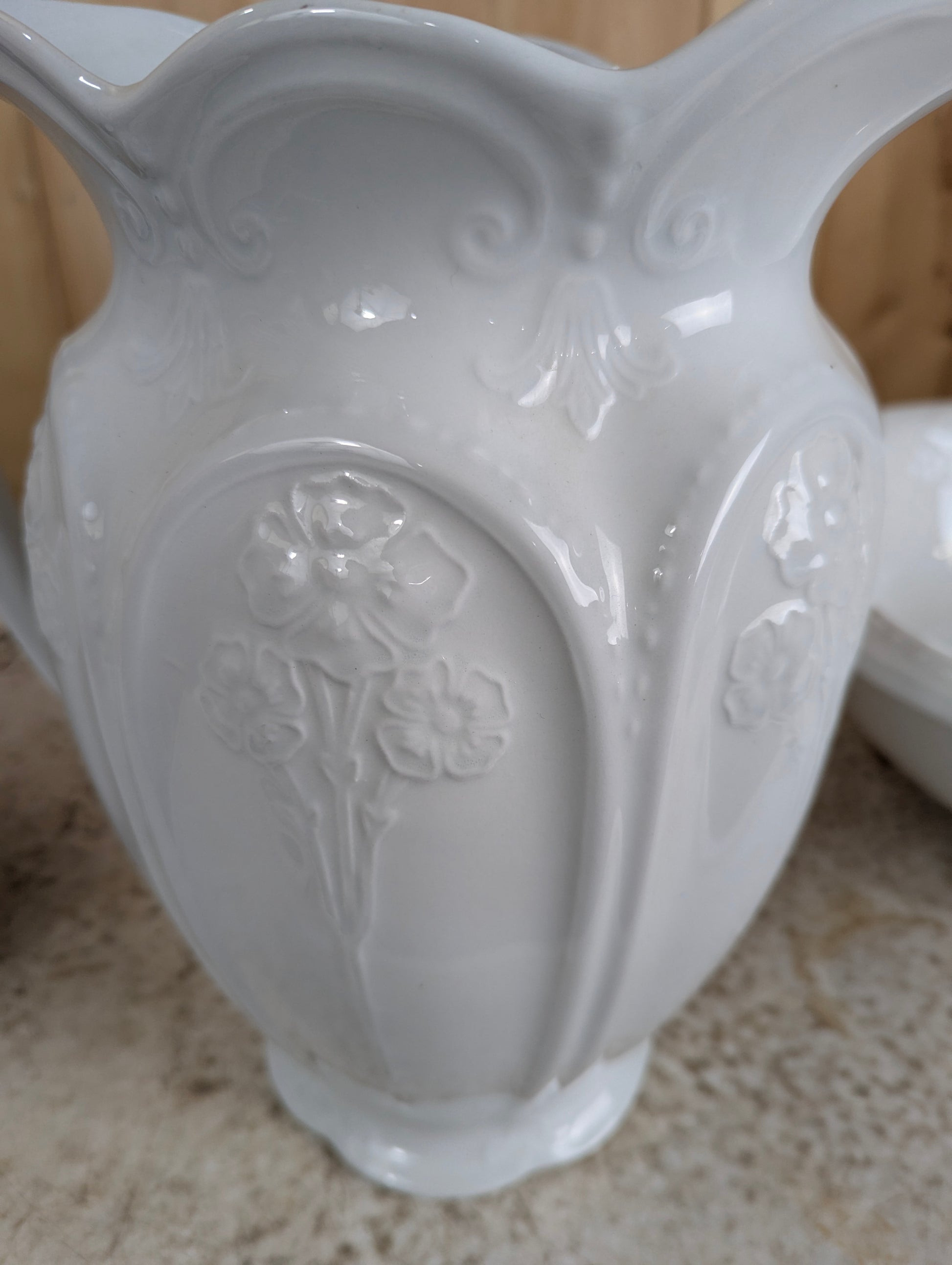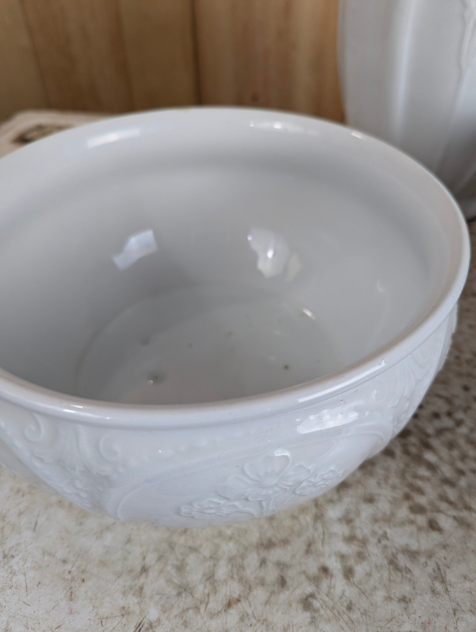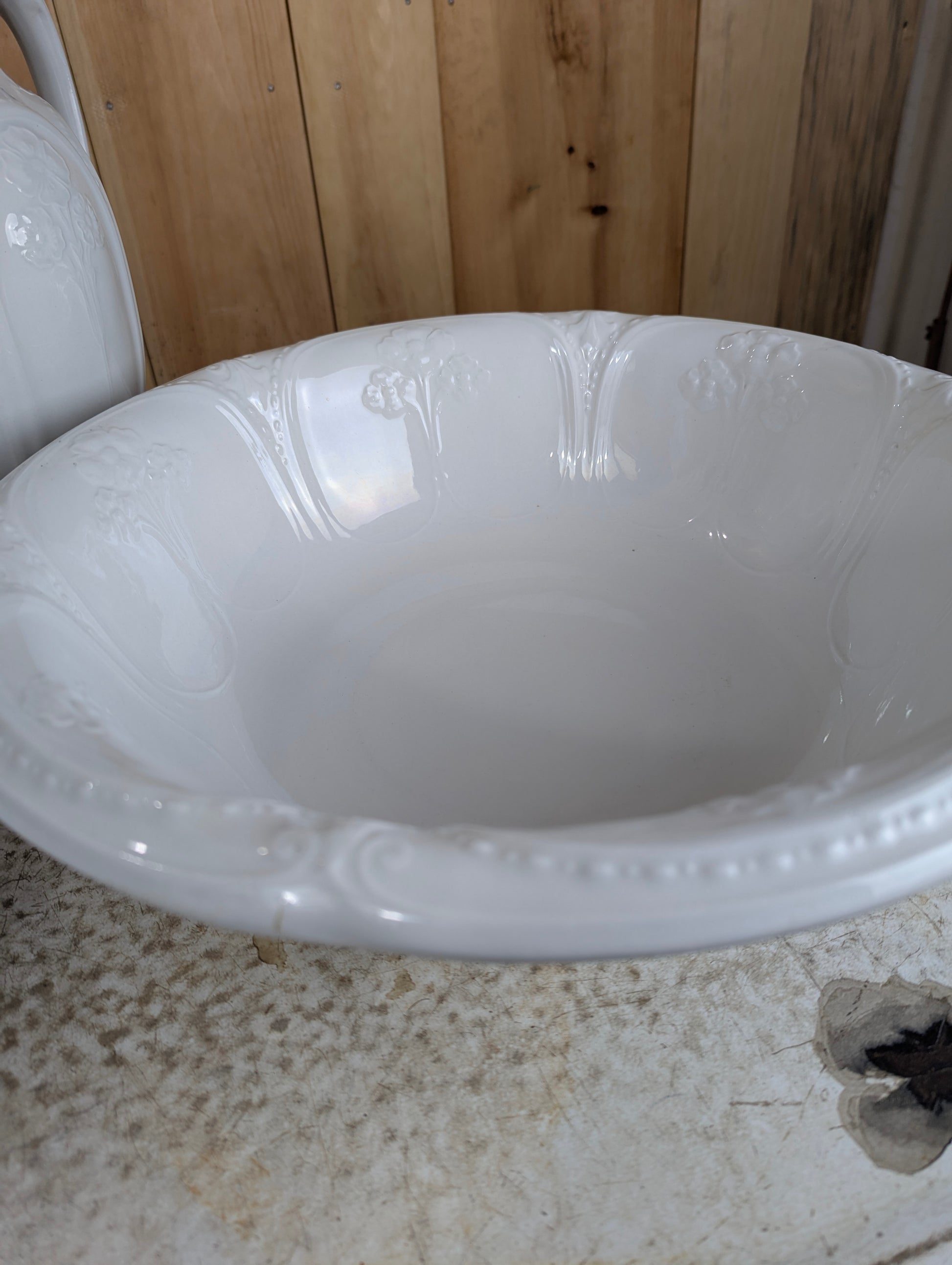 This charming set of three vintage J&G Meakin ironstone pieces from England offers a perfect blend of history and style for your washstand or dresser. Featuring a tall pitcher (11.5” high), a wide bowl (16” diameter, 5” high), and a 5” high chamber pot with handle (9” diameter), each piece displays an elegant embossed design. While gently used with some signs of wear, this collection adds timeless character and practical decor to your home. Elevate your space with this classic set that combines durability and vintage charm.