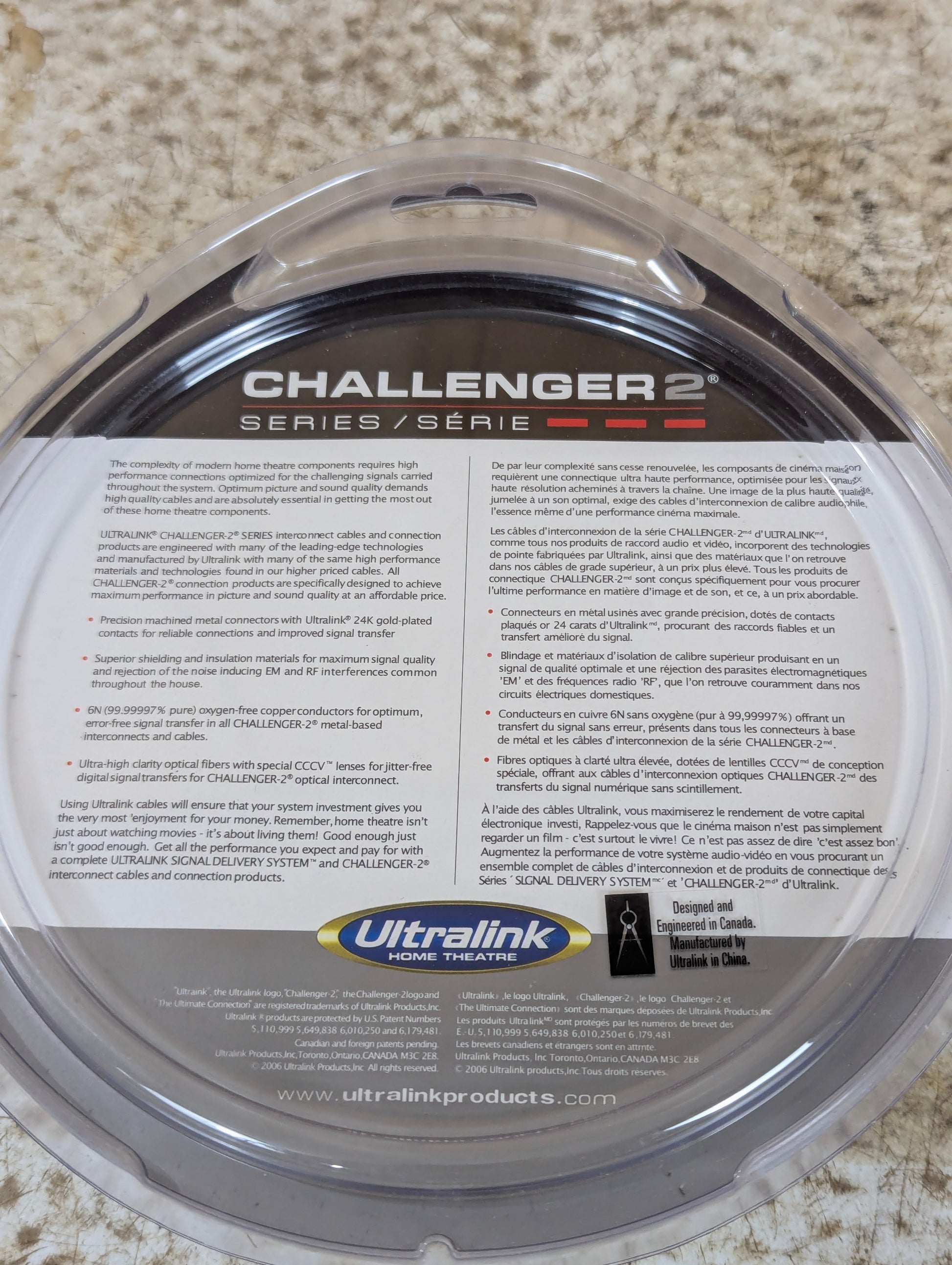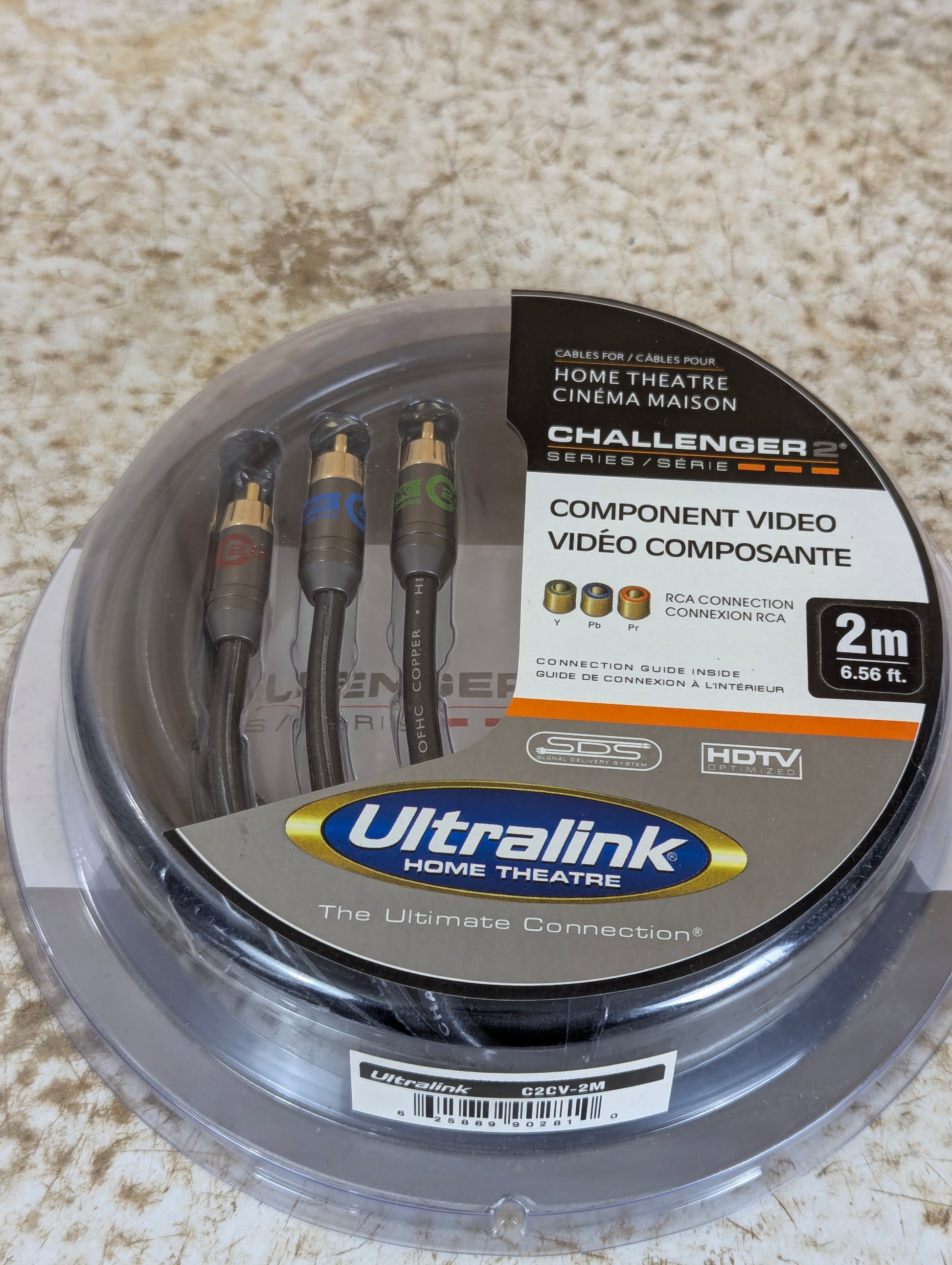 Experience exceptional video clarity with the Ultralink Challenger 2 Series Component Video Cable. Featuring 24K gold-plated contacts and superior shielding and insulation, this 2-meter cable ensures maximum signal quality and minimal interference. Still in its original packaging, it offers reliable performance for your home entertainment setup. Elevate your viewing experience with this premium, new old stock cable.