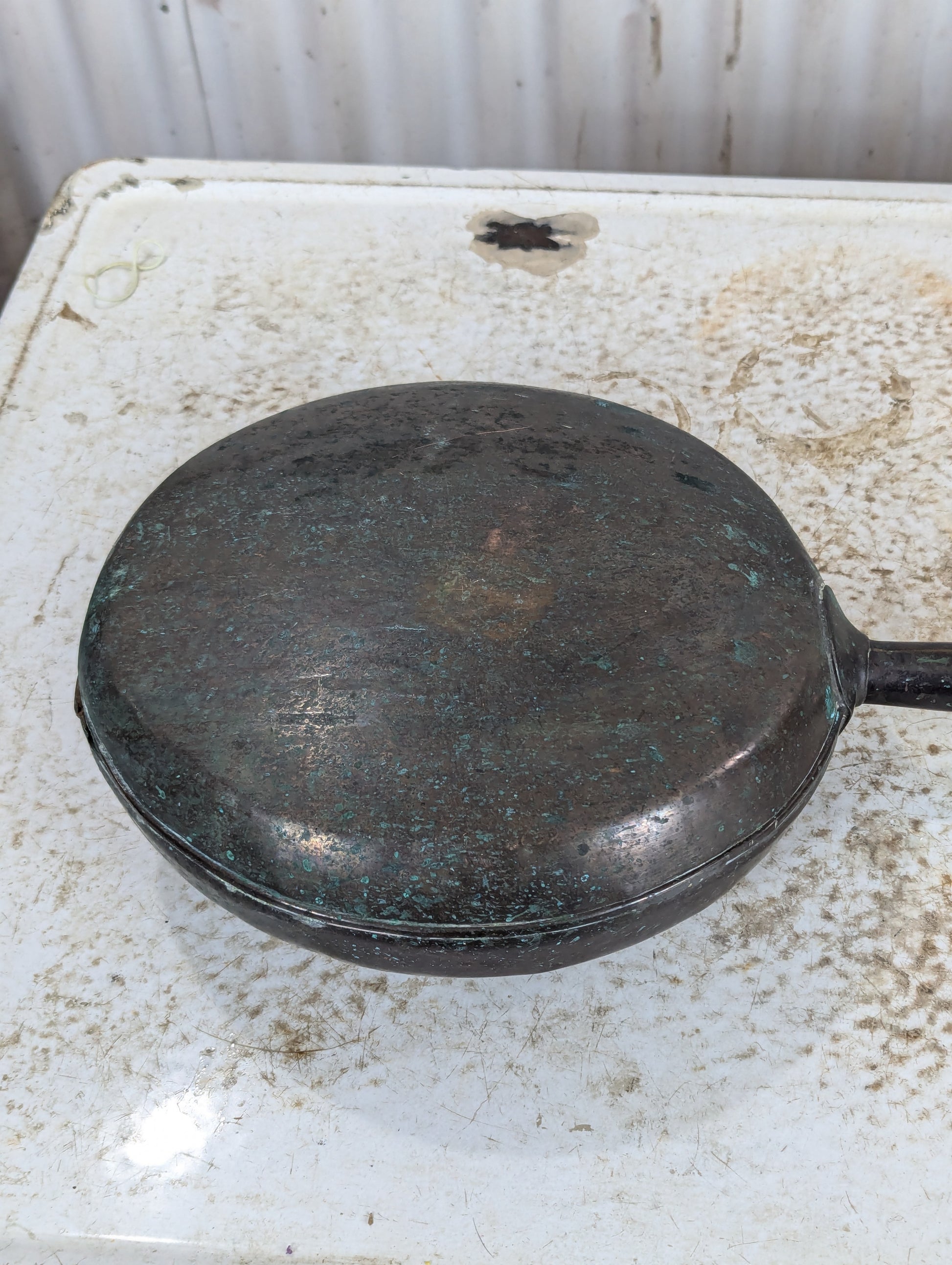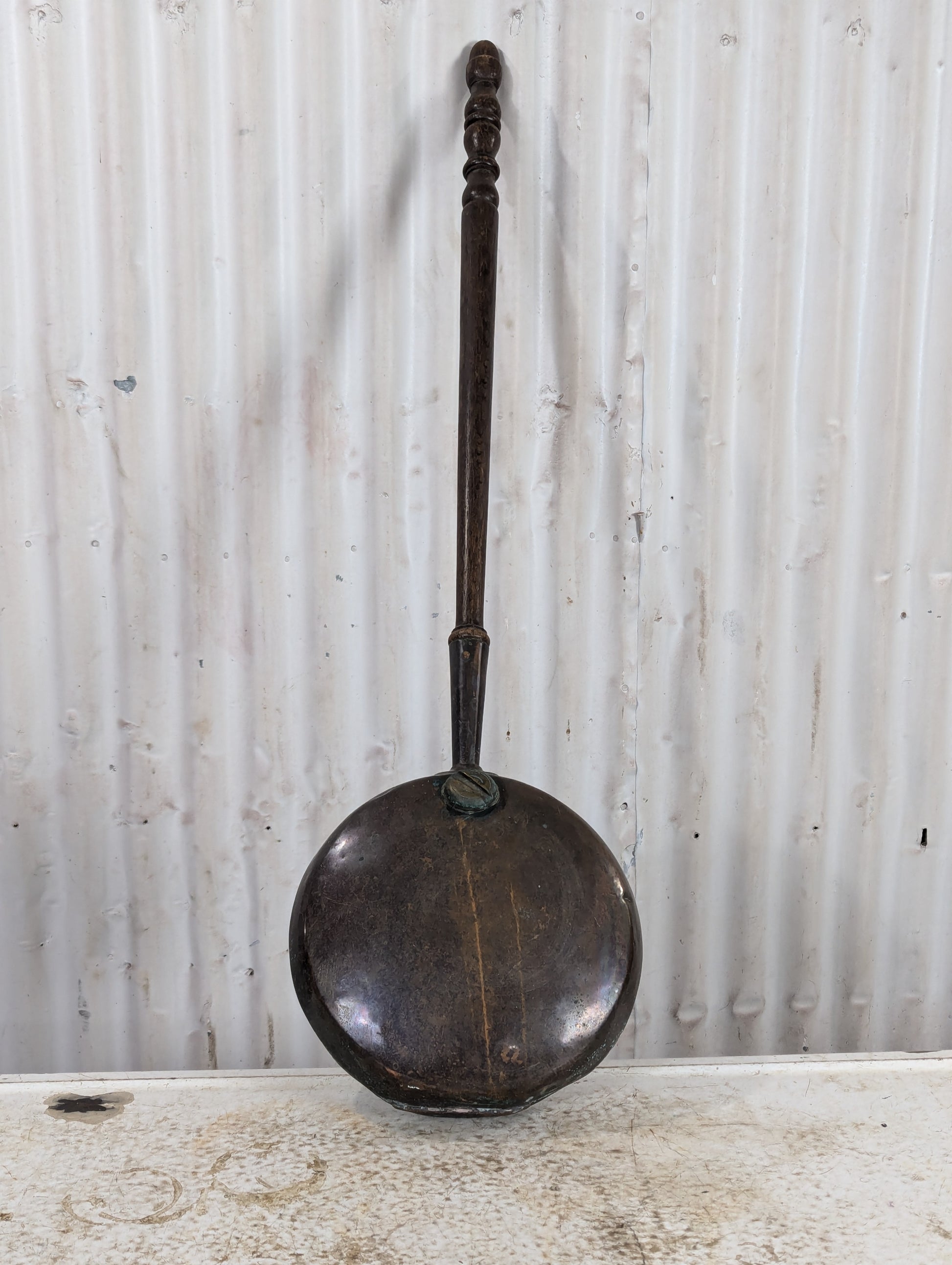 This authentic Victorian Copper Bed Warmer brings historical charm to your home decor collection. Measuring an impressive 42" long with an 11" diameter warming pan, this antique piece remains in fairly good condition despite its age. The long handle made it perfect for its original purpose, while today it serves as a conversation-starting collectible that adds warmth and character to any wall display or vintage-themed room. Don't miss this opportunity to own a genuine piece of practical Victorian history.
