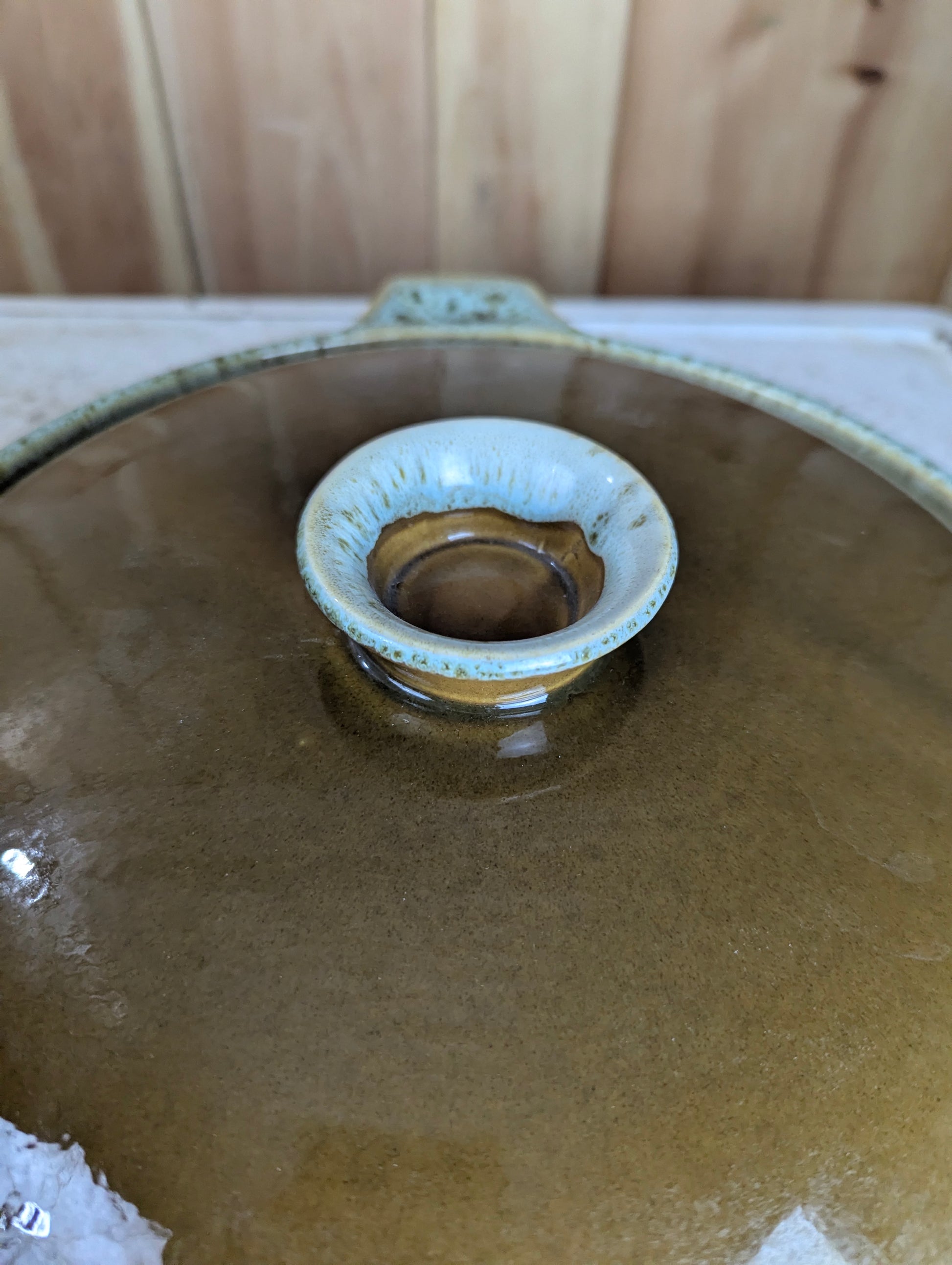 This exceptional vintage casserole dish from Sunburst Potteries represents authentic Canadian pottery craftsmanship from the 1960s-70s era. Measuring 12 inches in diameter with convenient side handles, it's perfectly sized for family meals and entertaining. The piece remains in excellent condition—completely free from chips, scratches, or cracks—making it a pristine addition to any vintage kitchenware collection. Whether you're a serious collector seeking authentic Alberta-made pottery or simply looking for functional vintage serveware with genuine character, this Sunburst creation delivers both style and substance. A true gem from a celebrated Canadian pottery maker.