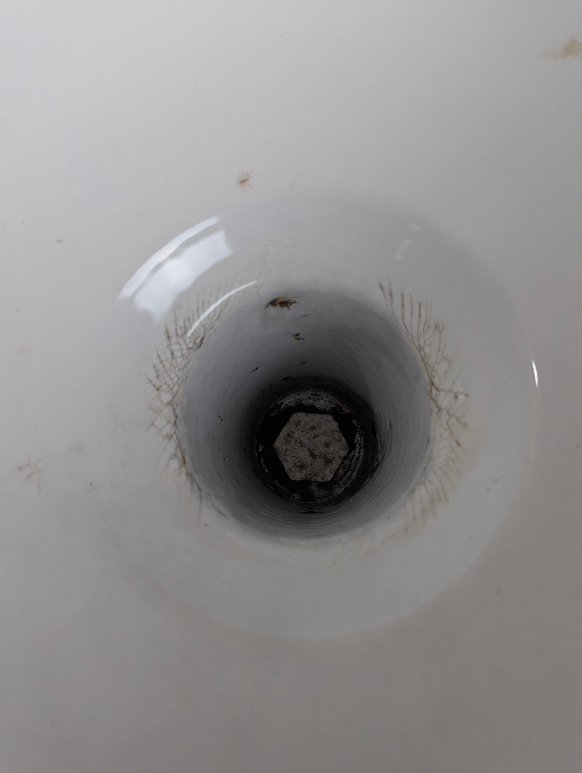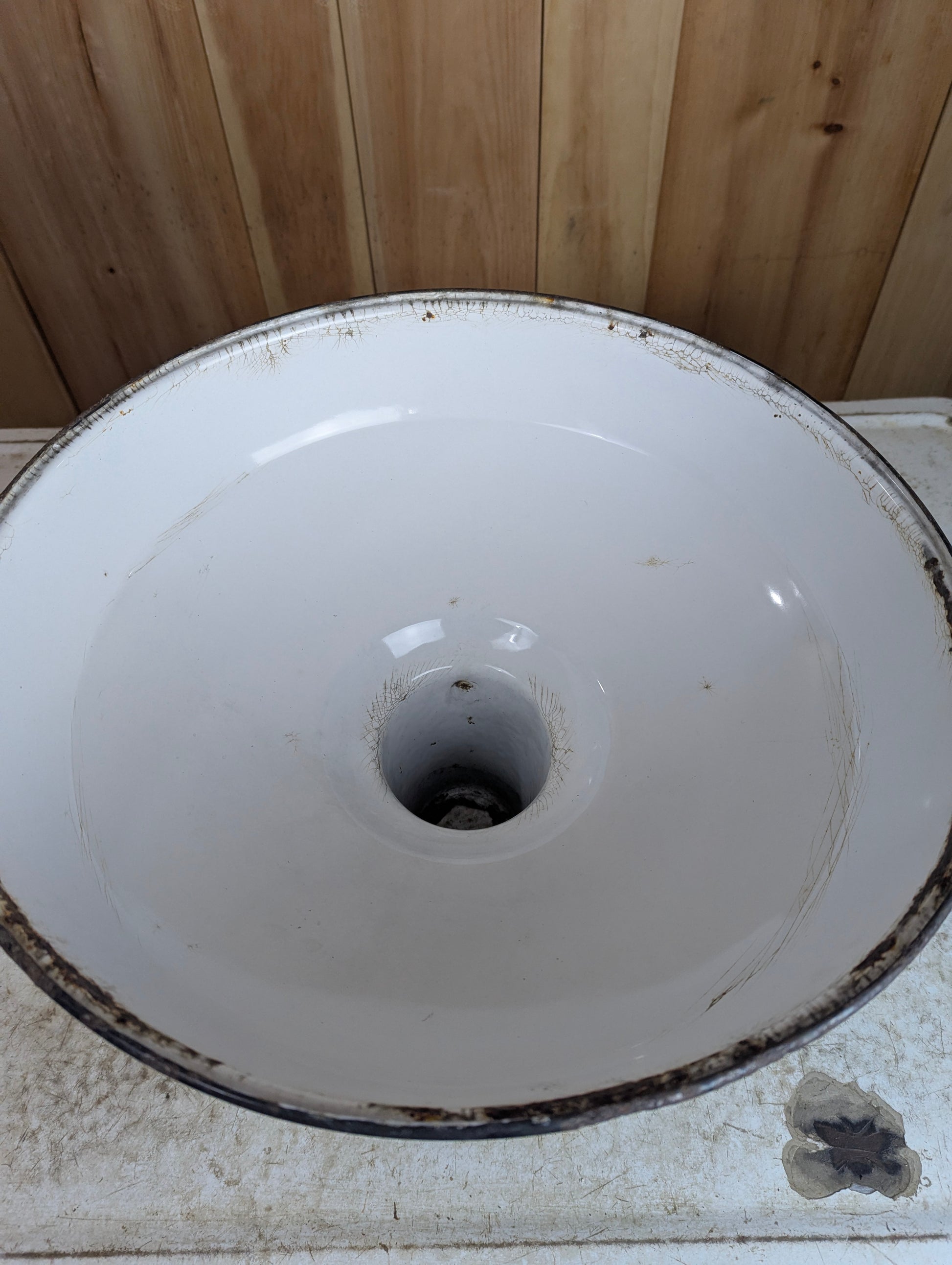 Vintage 16" Green Enamel Light Shade Bring authentic industrial charm to your space with this striking 16" green enamel shade. Its classic design and weathered patina tell a story of decades past, making it a standout piece for vintage enthusiasts and industrial décor lovers alike. The long socket neck offers flexible mounting options, whether you're creating a statement pendant or restoring a period fixture. While this shade shows its age with light spider web cracking—a hallmark of genuine vintage character—it remains fully functional and structurally sound. Perfect for adding nostalgic appeal to lofts, workshops, or eclectic home interiors.