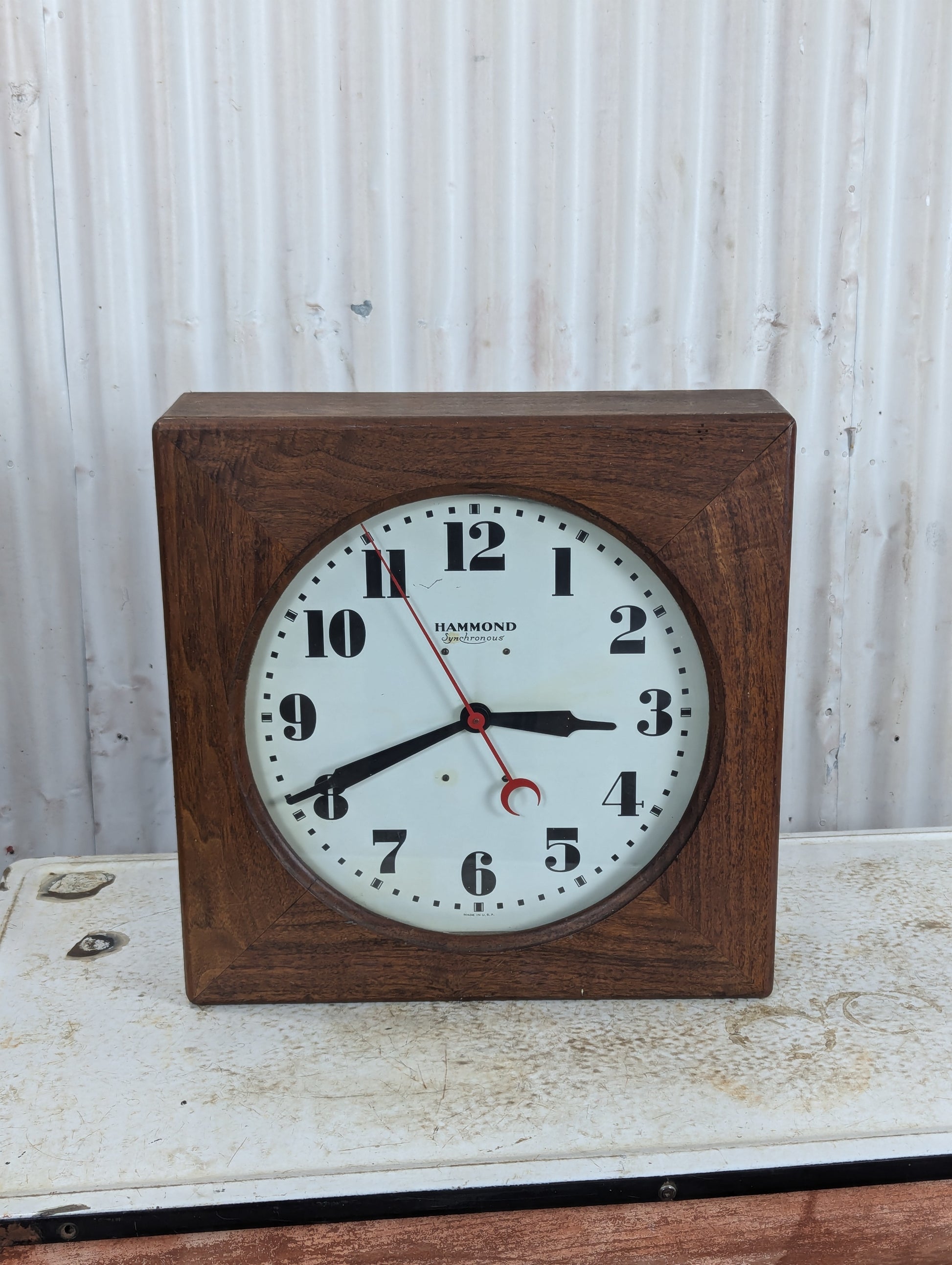 This authentic Vintage 1930's Hammond Electric Wall Clock is a rare find in good working condition. Housed in a wooden case (some damage to case as seen in last pic) measuring 18.5" x 18.5" with a 5" depth, this American-made timepiece combines historical charm with practical functionality. Don't miss this opportunity to own a piece of genuine electrical engineering history that will become the conversation centerpiece in any room.