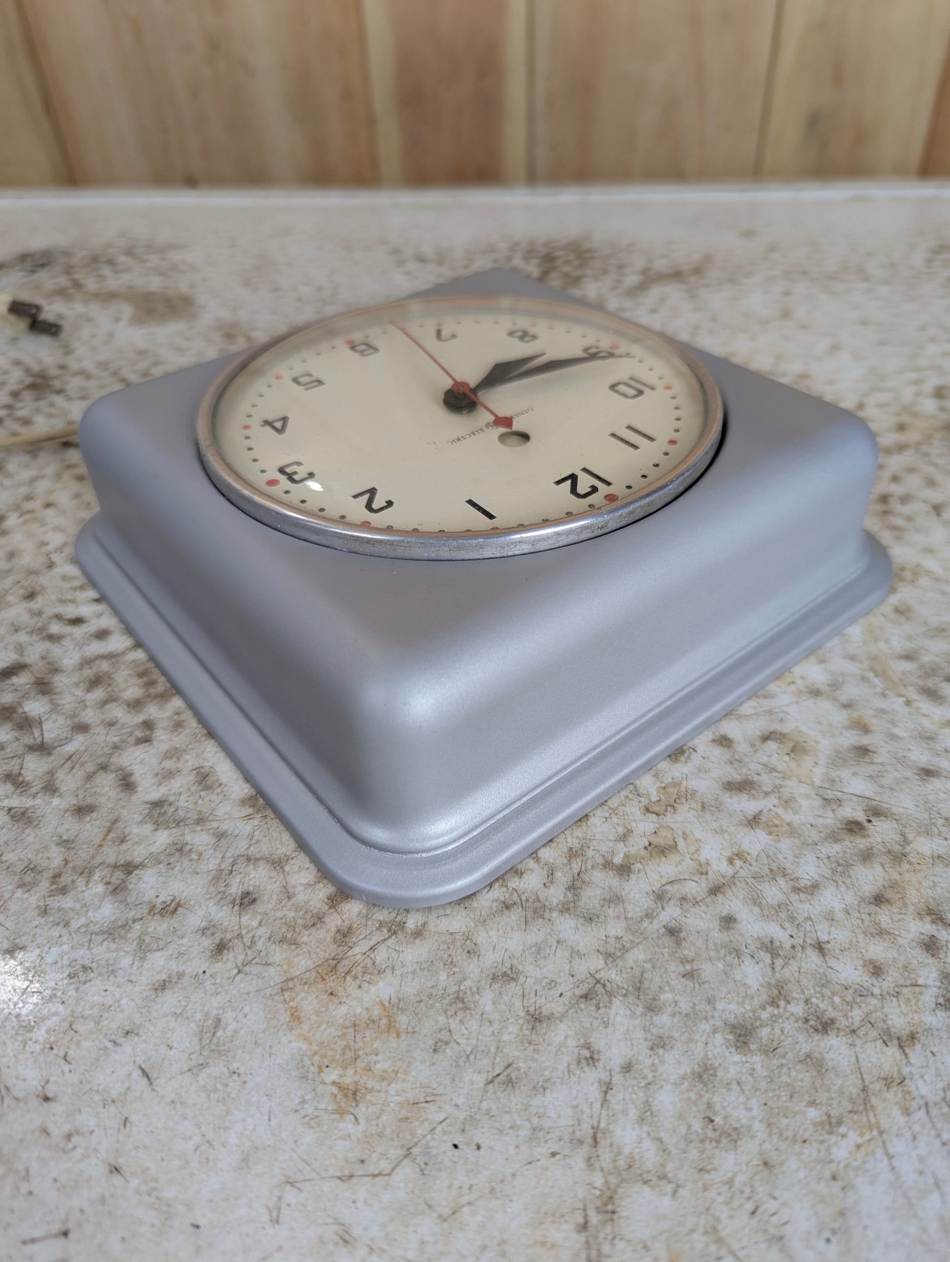 This Vintage 1940’s General Electric Wall Clock Model 2H08 is in working order and features a durable metal case. Measuring 7” x 7” with a 2” depth, its clock face, which is 5” in diameter, is in excellent condition. Combining classic design with reliable function, it’s a timeless piece perfect for adding vintage charm to any room.