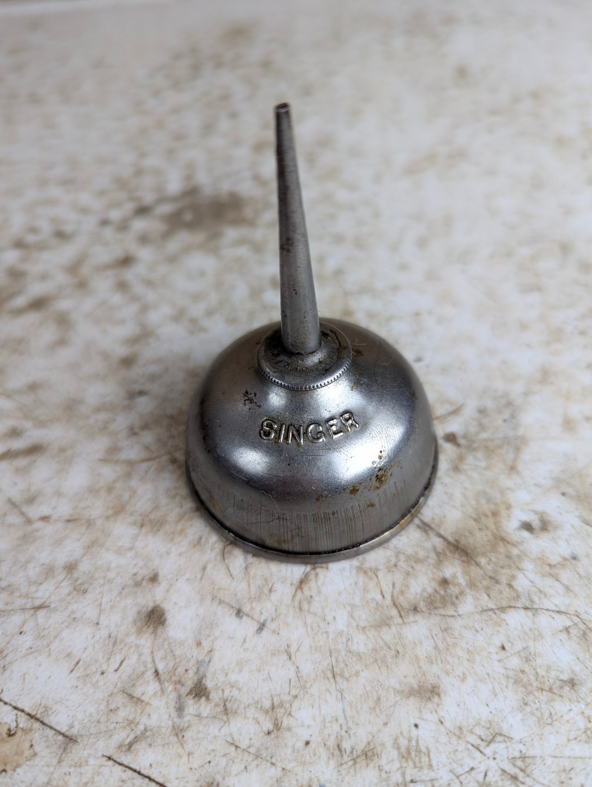 Vintage Singer thumb oil can in good used condition. This essential sewing machine accessory measures 2" in diameter and is perfect for lubricating your vintage Singer machine. A practical collectible for sewing enthusiasts and machine restorers.